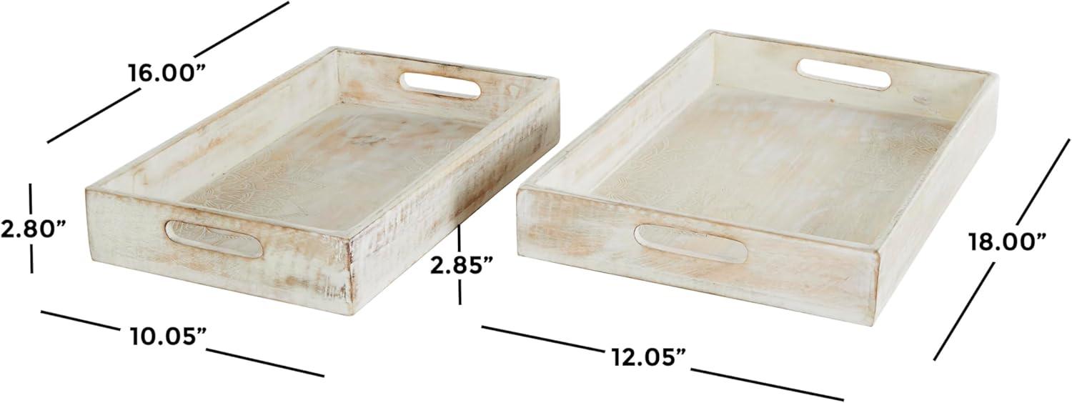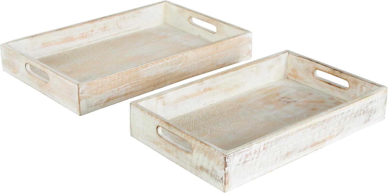 Deco 79 Mango Wood Handmade Whitewashed Tray with Carved Mandala Interior, Set of 2 18", 16" W, Cream(Cream)