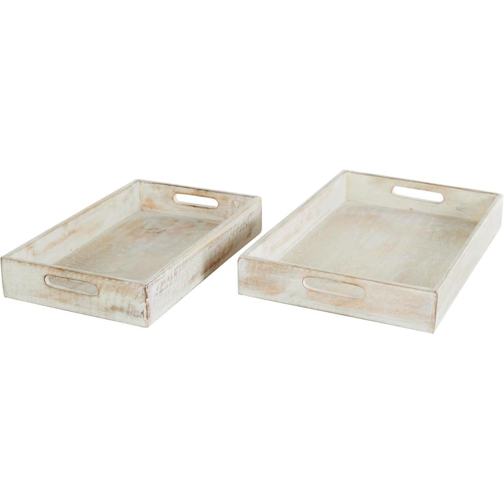 CREAM WASHED FINISH: A set of 2 mango wooden trays that features a soft washed cream hue and a whitewashed finish, imparting a warm and timeless aesthetic to each tray