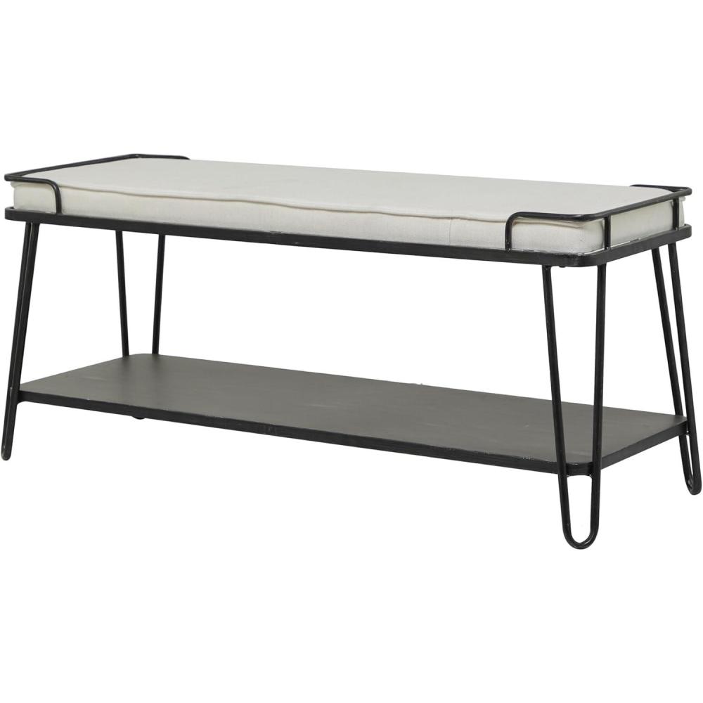 METAL BENCH SEAT: Metal is used as a sturdy frame for this white home bench, with a rope backrest and an upholstered cushion