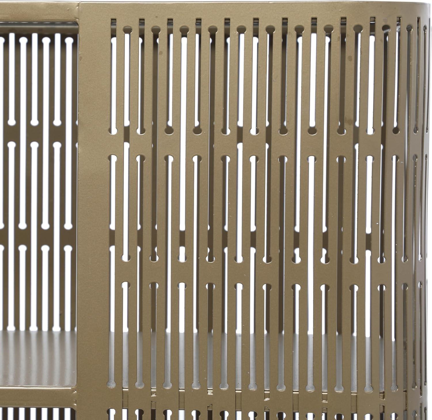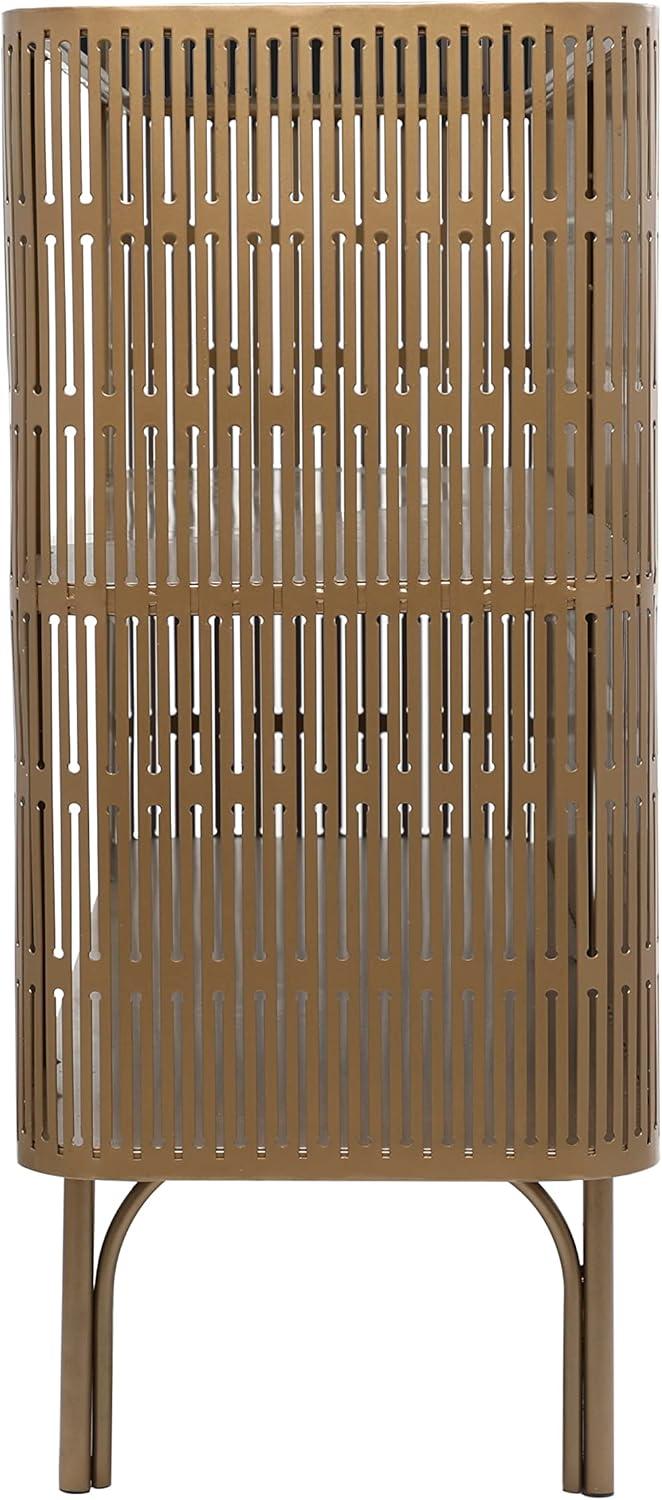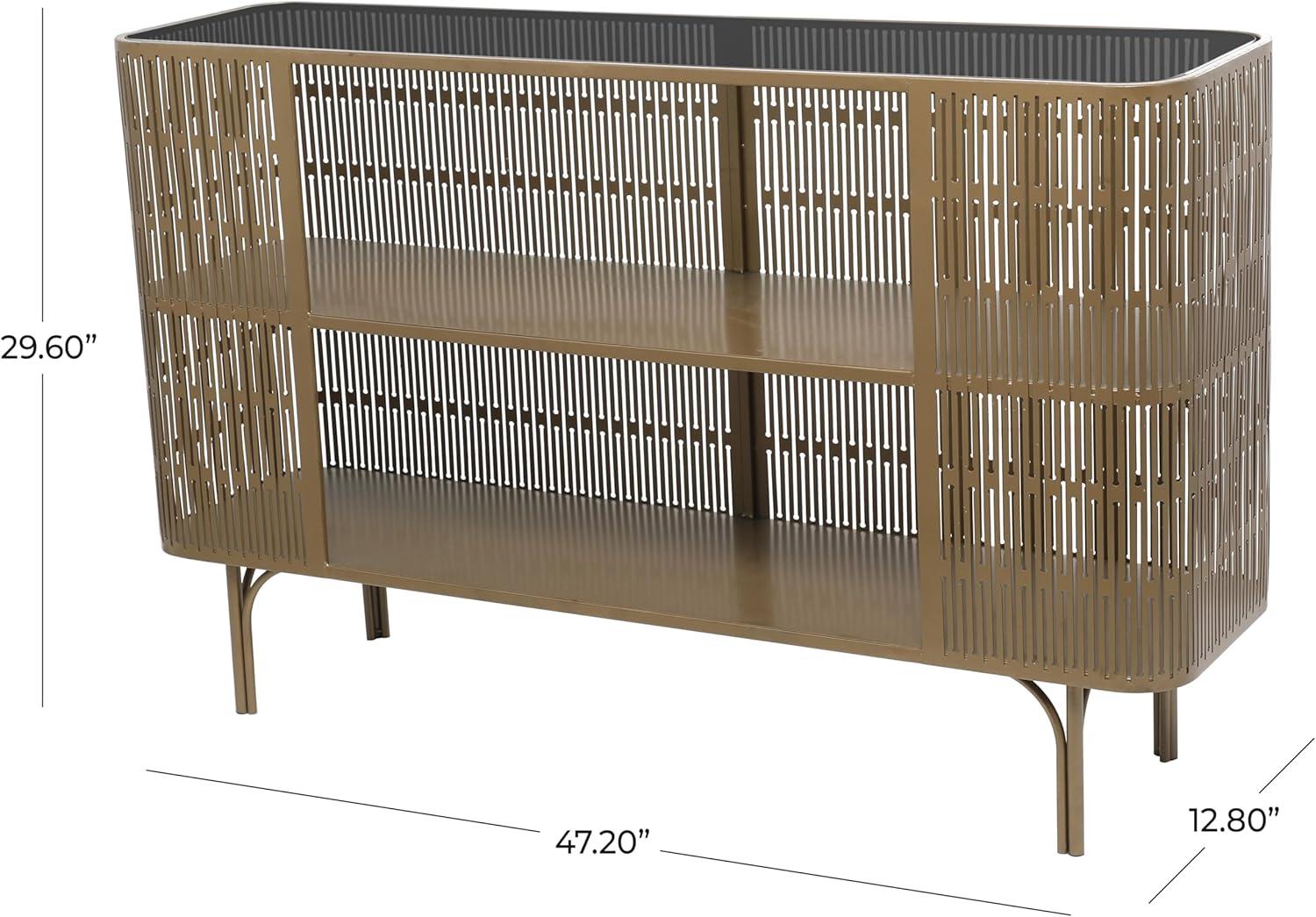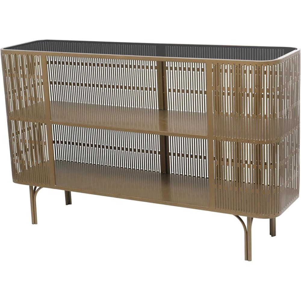 Iron is forged to form a remarkable caged console table design. This stylish console table features an oval-shaped cage exterior design with a table top and a 2-tier metal shelf. Wipe clean with a dry cloth. A practical yet stylish upgrade that instantly elevate the look of your room. Maintain a clutter free zone and stay organize with this chic cabinet. Gold metal framed console table will complement well with large regular wall mirror or dark tone abstract wall art. Includes one shelf that rests directly in the middle of the unit. This item ships in 1 carton. Suitable for indoor use only. This item ships fully assembled in one piece. Maximum weight limit is 150 lbs. This is a single gold colored entryway table. Metal console table features a single shelf. Modern style.