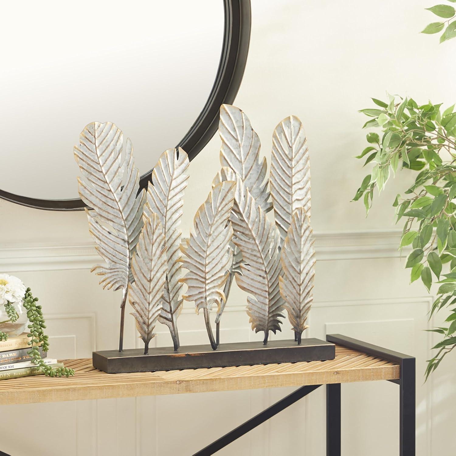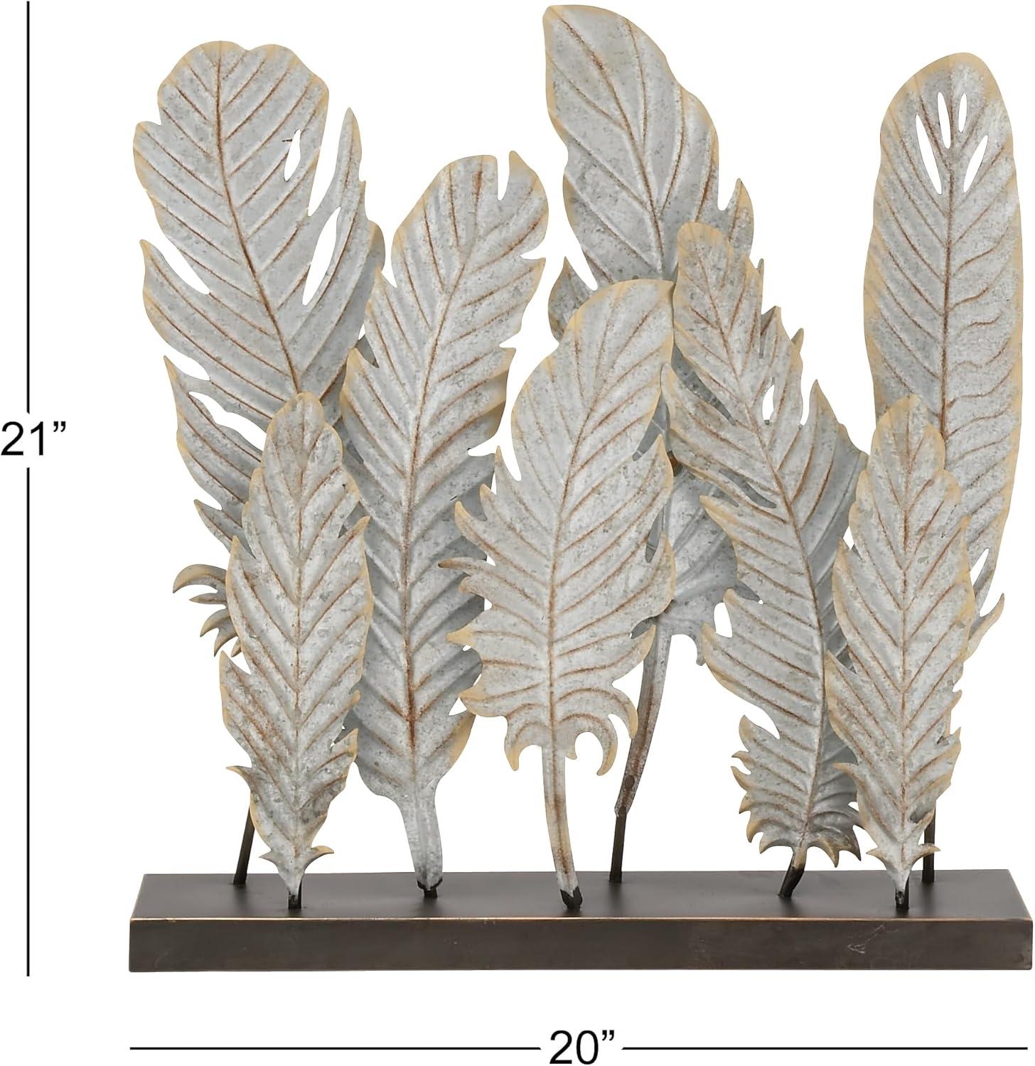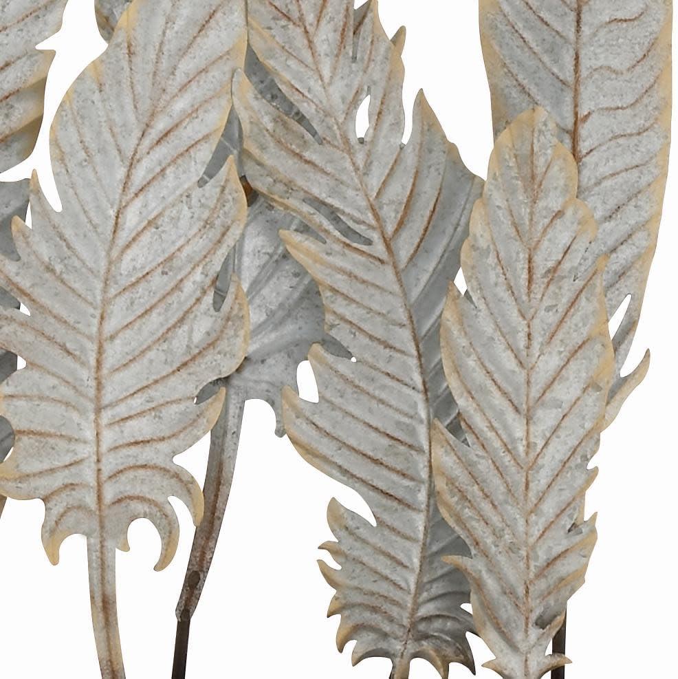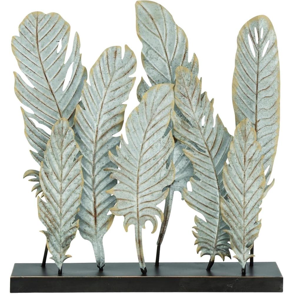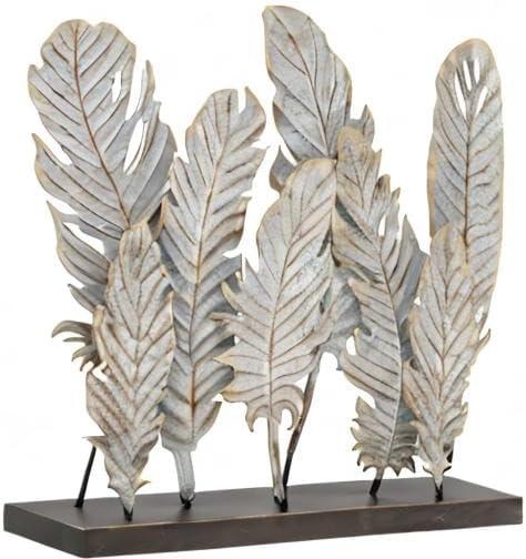 BIRD SCULPTURE: Features an antique distressed white finish of 8 feather-shaped sculptures with solid black metal base