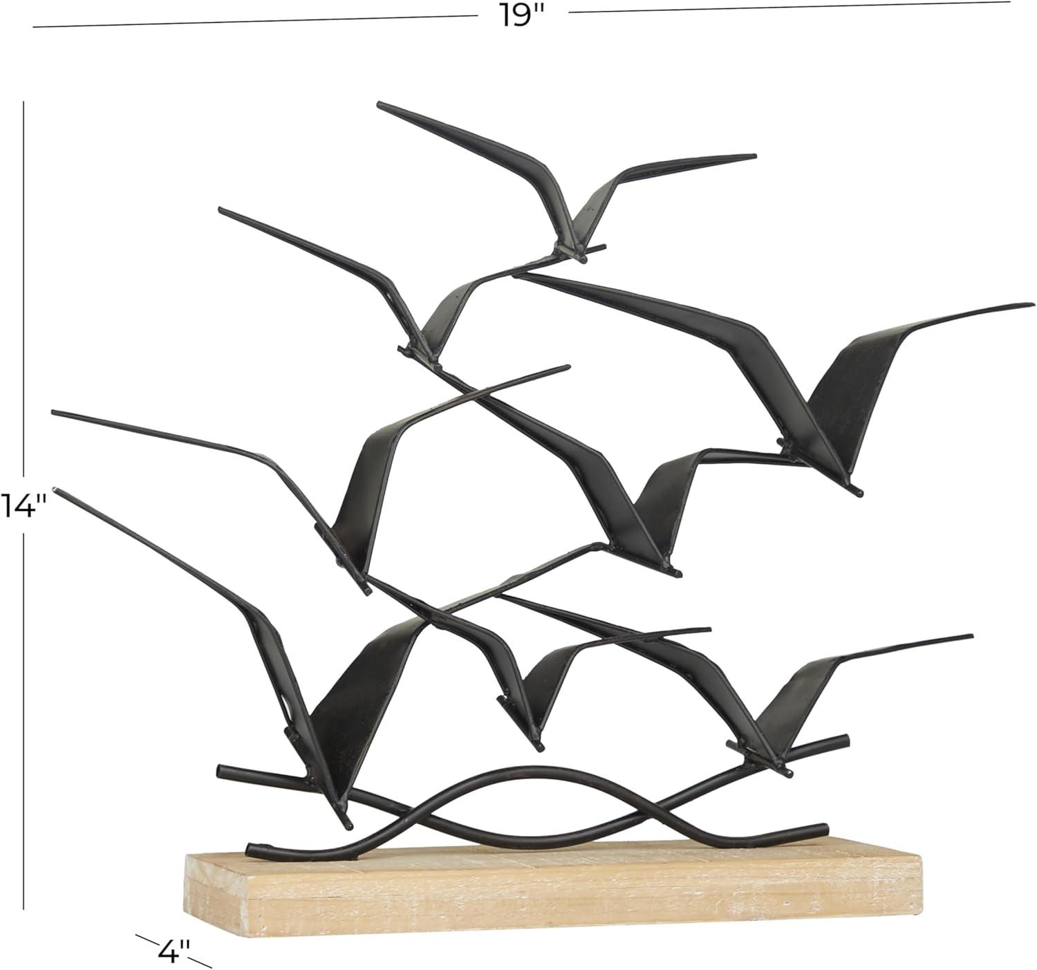 Welded metal forms this coastal accent statue and is attached to a wooden base stand. Matte black home decor figurine accentuates a flock of birds on a rectangular base stand with intricate details. Wipe clean with a dry cloth. Level up your table decoration and bring the beauty of nature inside for a comforting atmosphere. Make an instance home refresh with this beautifully crafted sculpture for an eye catching appeal. Display this bird home decor statue as accent decor on your console table or as a centerpiece on your coffee table to complete your coastal-themed living room design. Designed with felt or rubber stoppers at the base that prevent scratching furniture and table tops, as well as sliding around. This item ships in 1 carton. Please note that this item is for decorative use only. Iron sculpture makes a great gift for any occasion. Suitable for indoor use only. This item ships fully assembled in one piece. This is a single black colored statue. Coastal style.