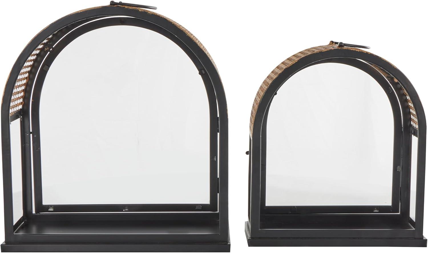 Deco 79 Metal Brushed Rectangular Candle Lantern with Brown Wood Tops, Set of 2 15", 11" H, Dark Gray(Black)
