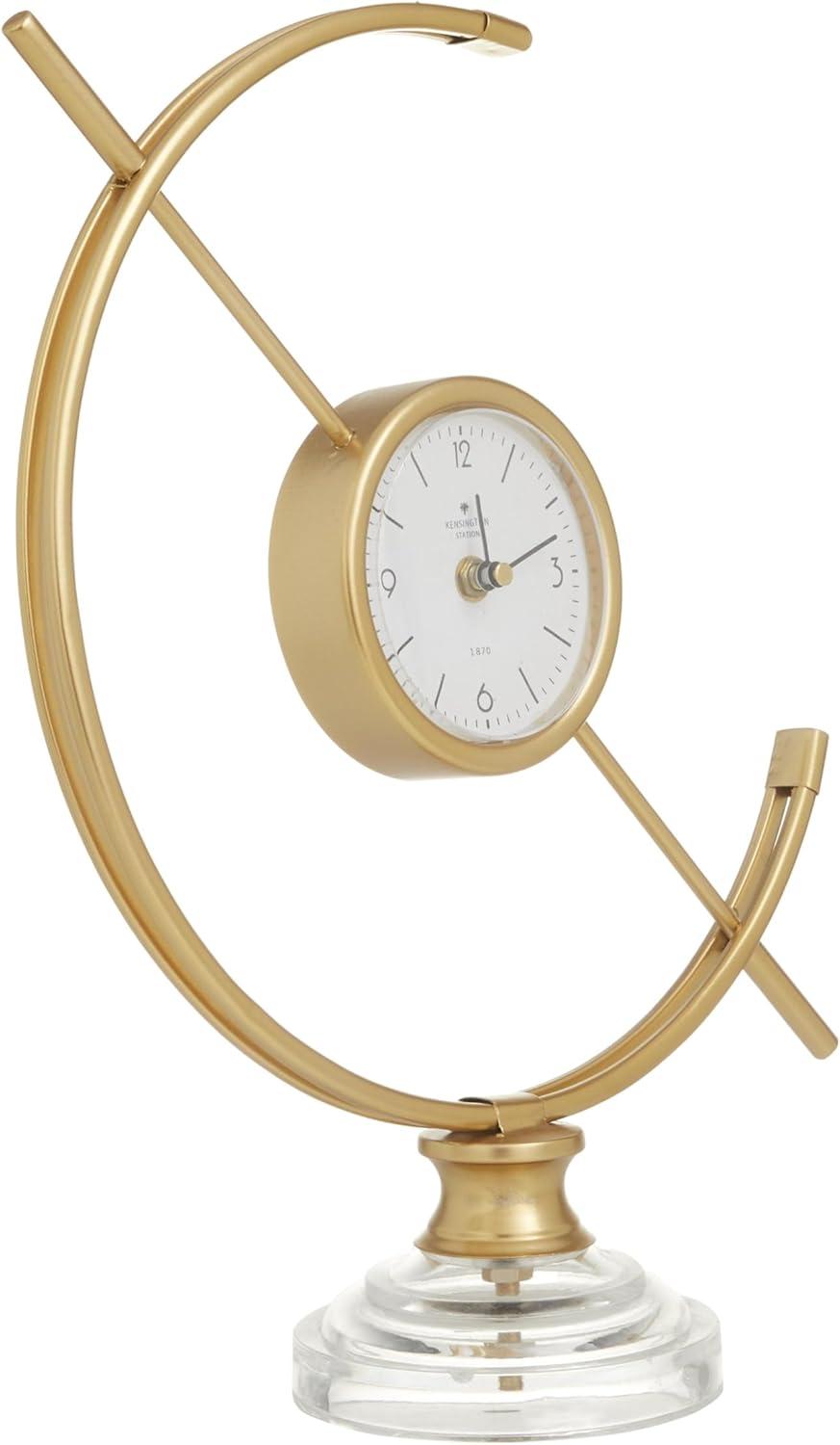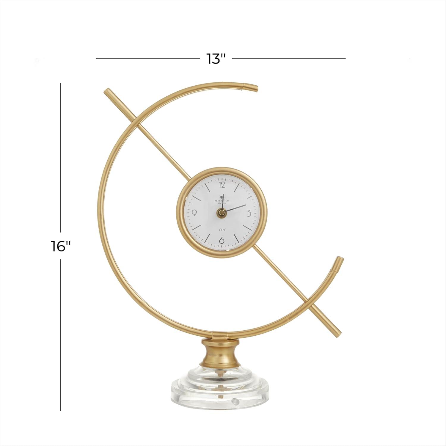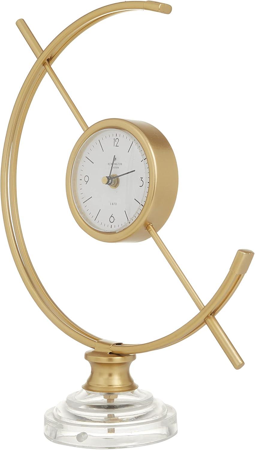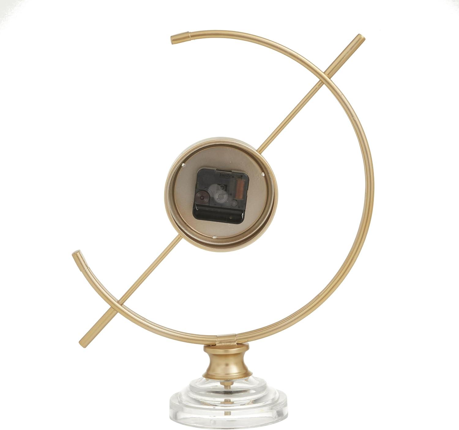 Improve your time management skills and keep a clock close by with this charming piece. A dashing display on any surface to help you manage your time throughout the day. This chic round clock is a stunning focal point piece for both light and dark toned tables and shelves. Requires 1 AA battery. Battery not included. This item ships in 1 carton. This clock showcases an Arabic numeral with minute marking. The clock mechanism runs silent. Iron clock makes a great gift for any occasion. Suitable for indoor use only. This item ships fully assembled in one piece. This is a single gold colored mantel clock. Modern style.