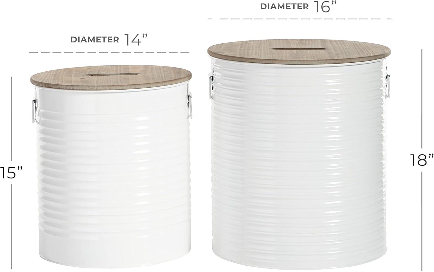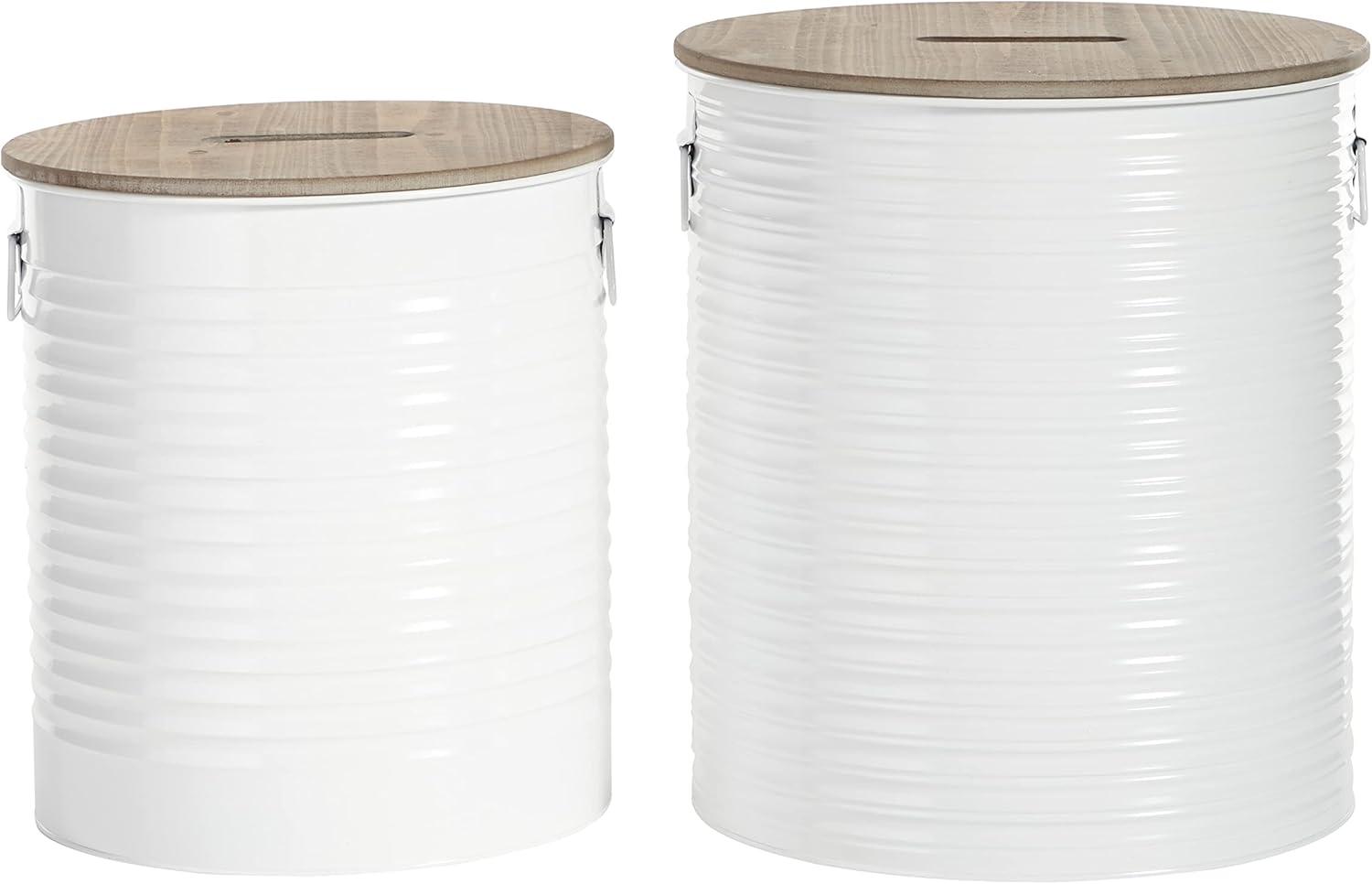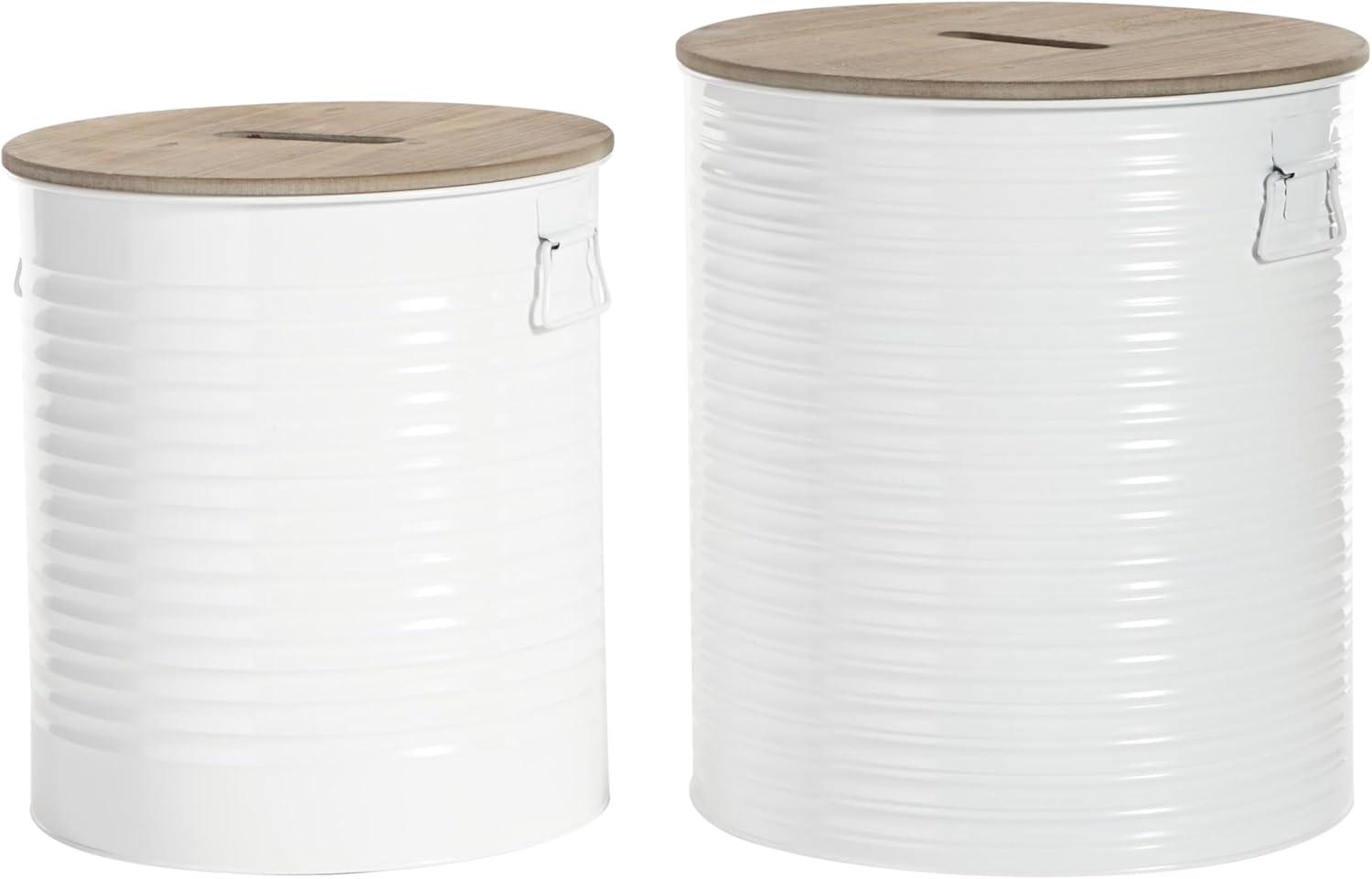 FEATURES CYLINDER STORAGE STOOL Set of 2 barrel style side tables features spacious interior with metal side handle and wooden top with open slot for easy access
