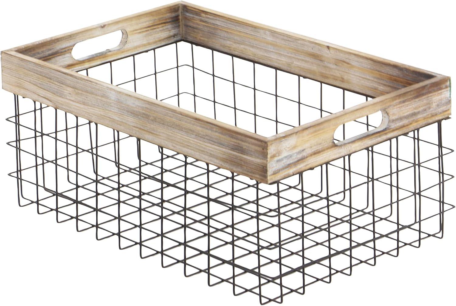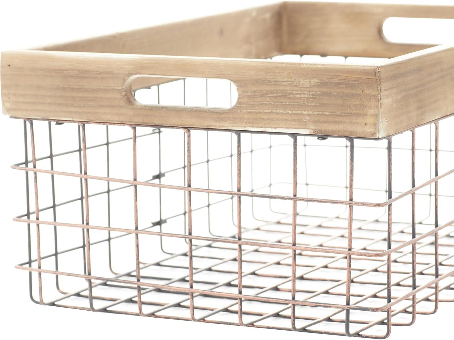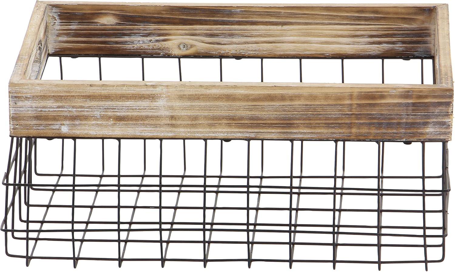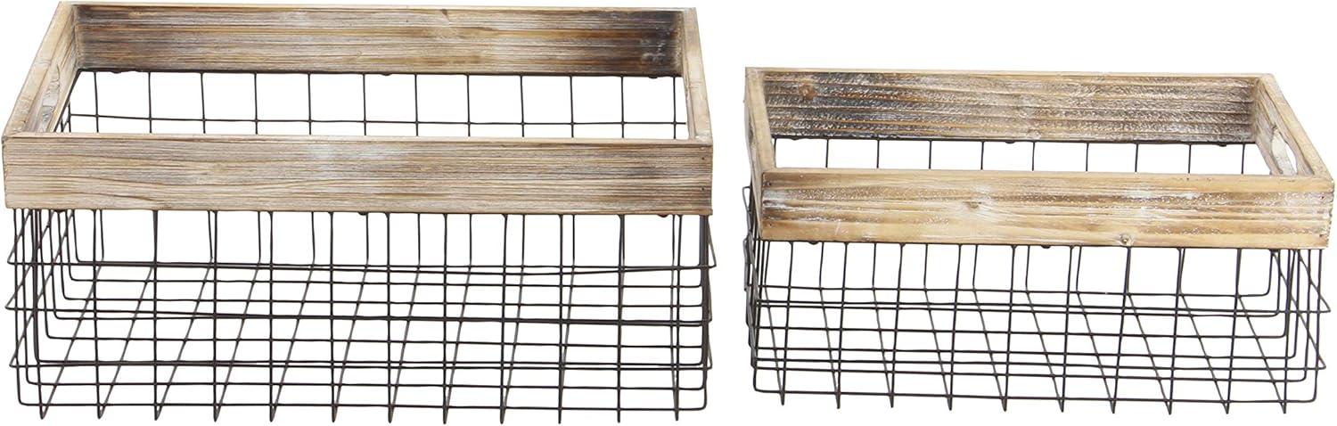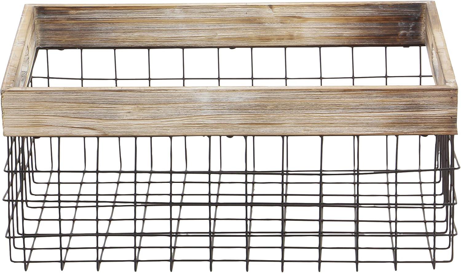 Arrange household items, packaged food, or fresh produce in style with this Deco 79 Farmhouse Brown Wood and Black Metal Baskets – Set of 2, 15″ X 18″. Each piece features an open-style, rectangular grid frame body that allows content visibility and plenty of airflows, and a wooden rim with cut-out end handles that provide ease of handling and transfer. Sporting a distressed oak finish with exposed grain, these baskets will definitely bring a rough and rugged look to your ensemble.
