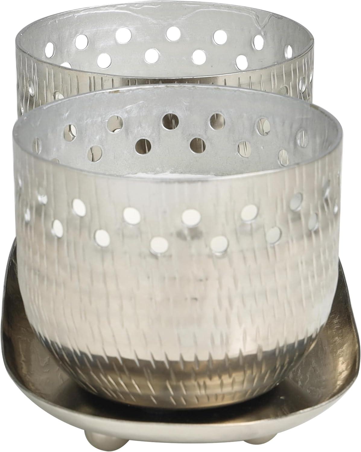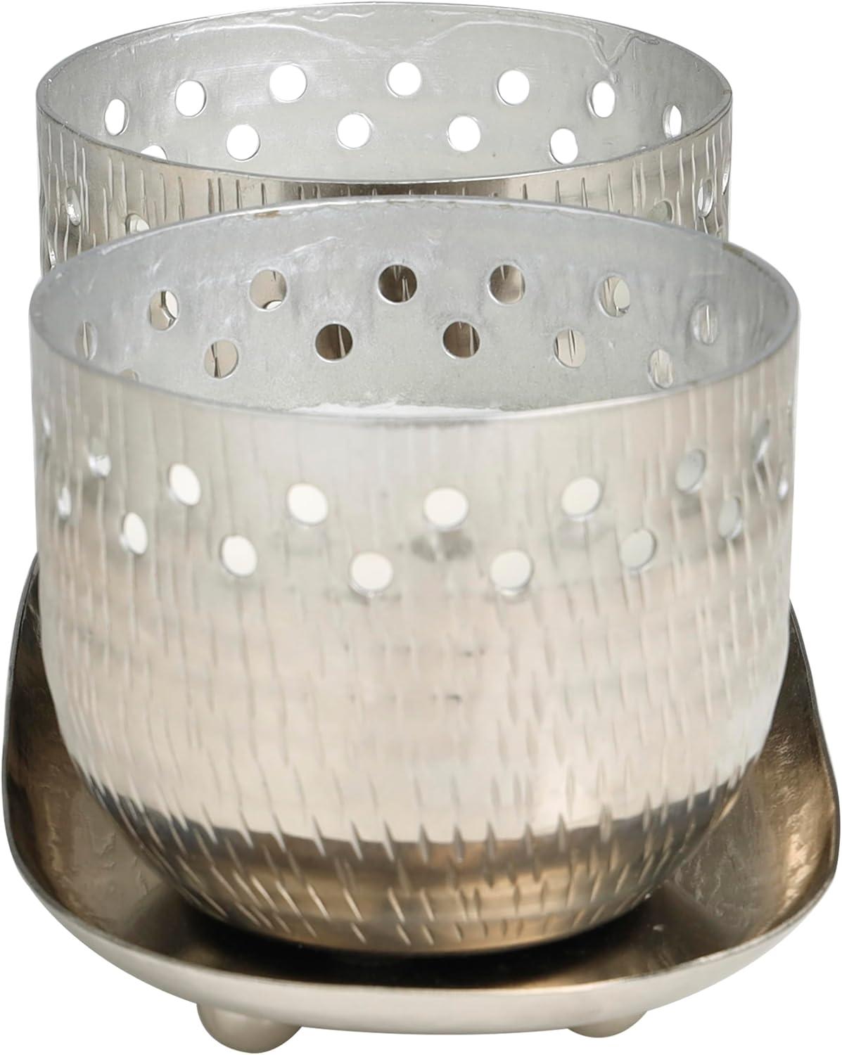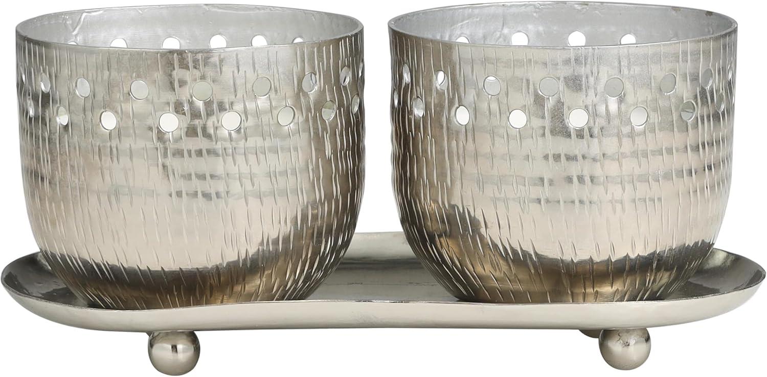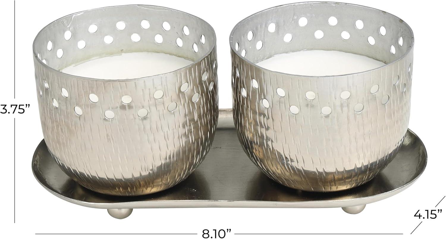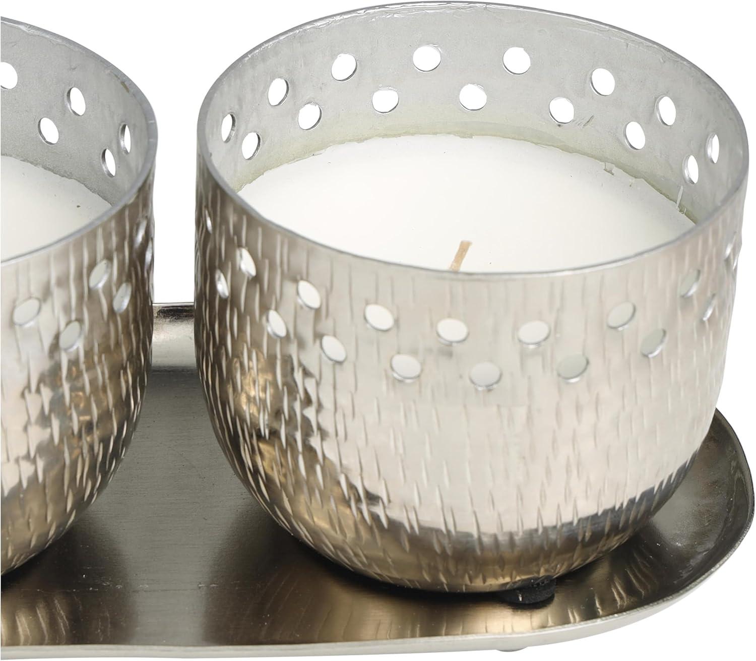 WHITE AND SILVER POLISHED FINISH Geometric polished silver candle bowls house one white wax 1-wick candle each, with a sleek silver tray to complete the look