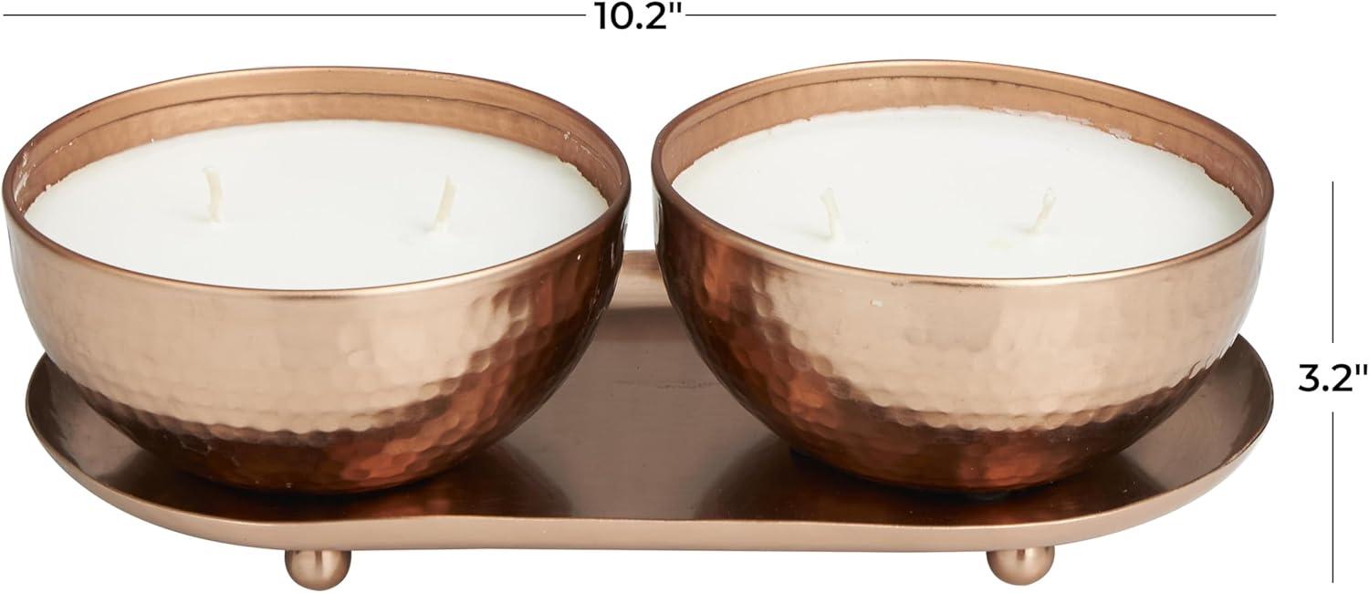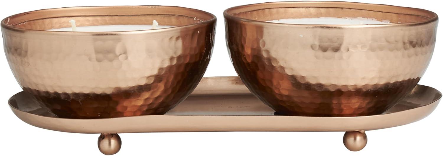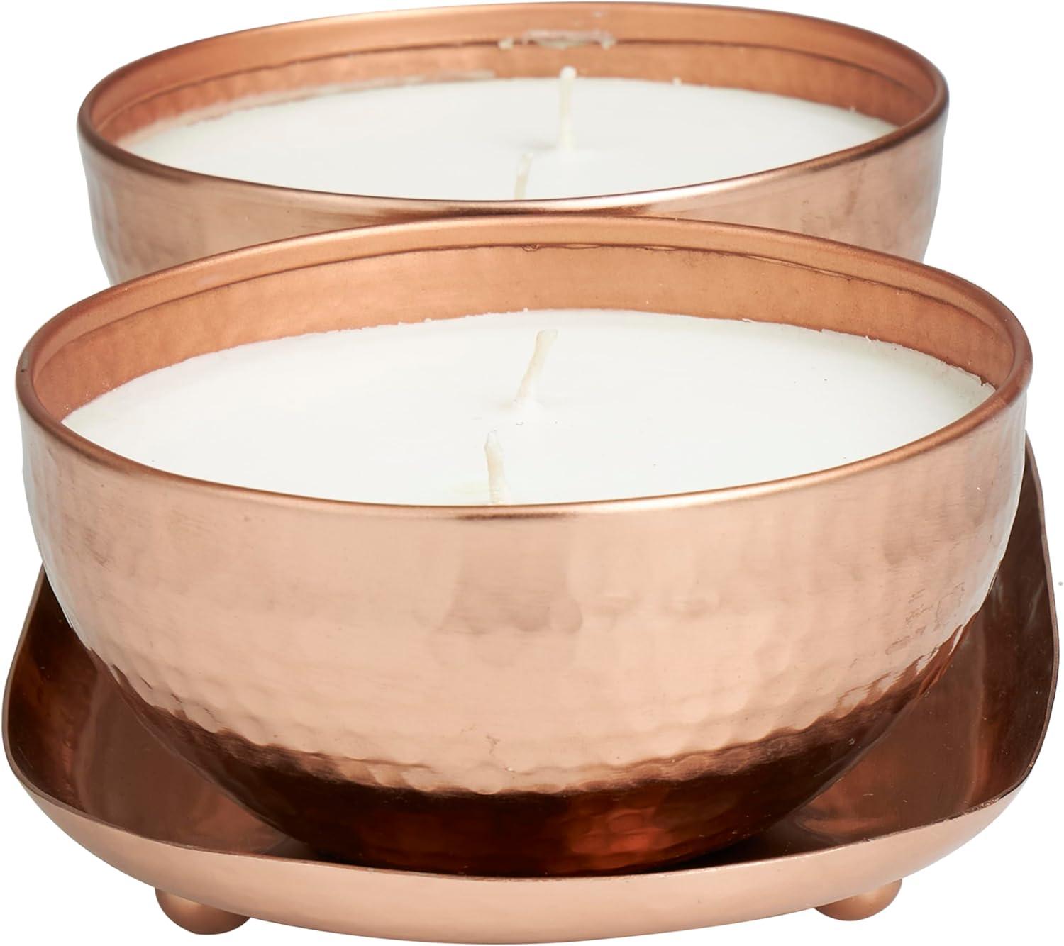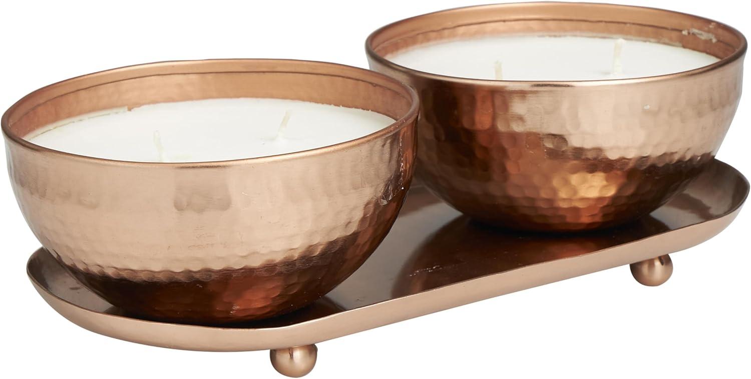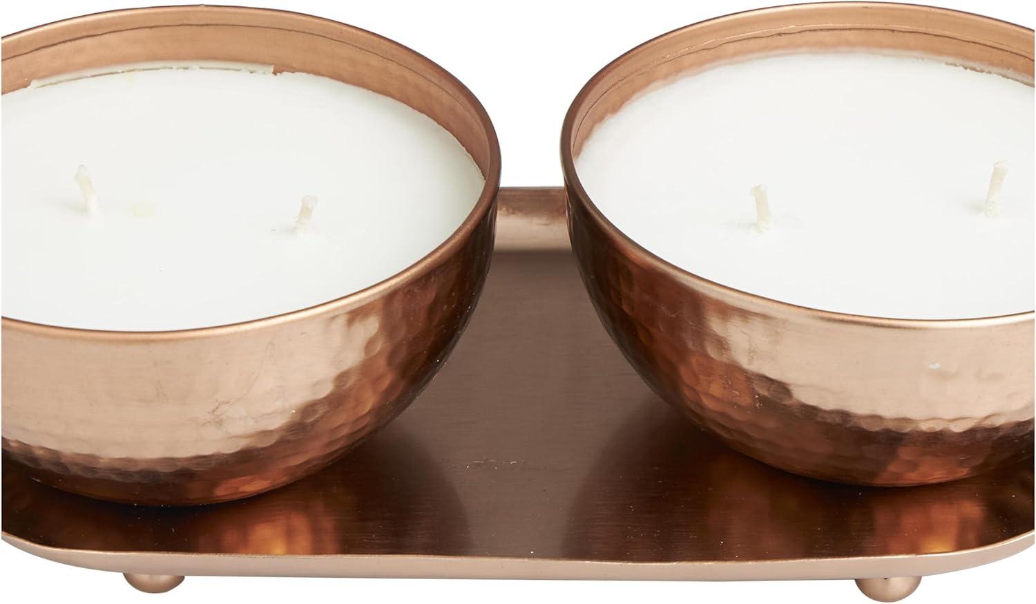 WHITE AND COPPER SATIN FINISH Minimalistic polished copper candle bowls house one white wax 2-wick candle each, with a sleek copper tray to complete the look