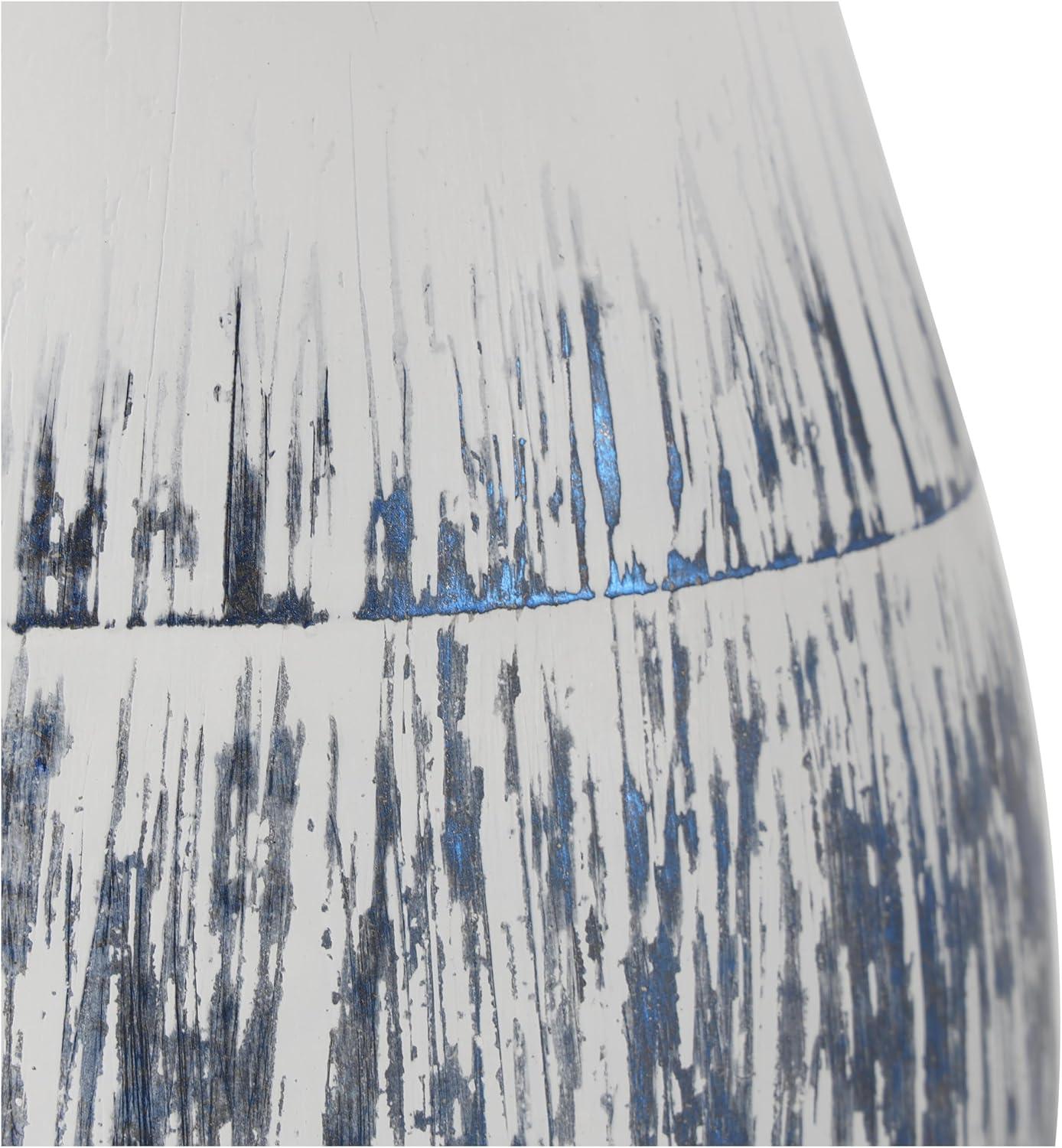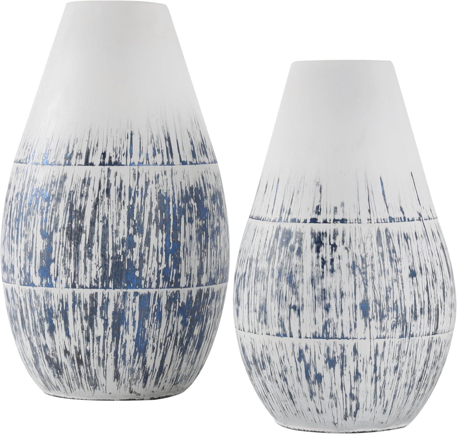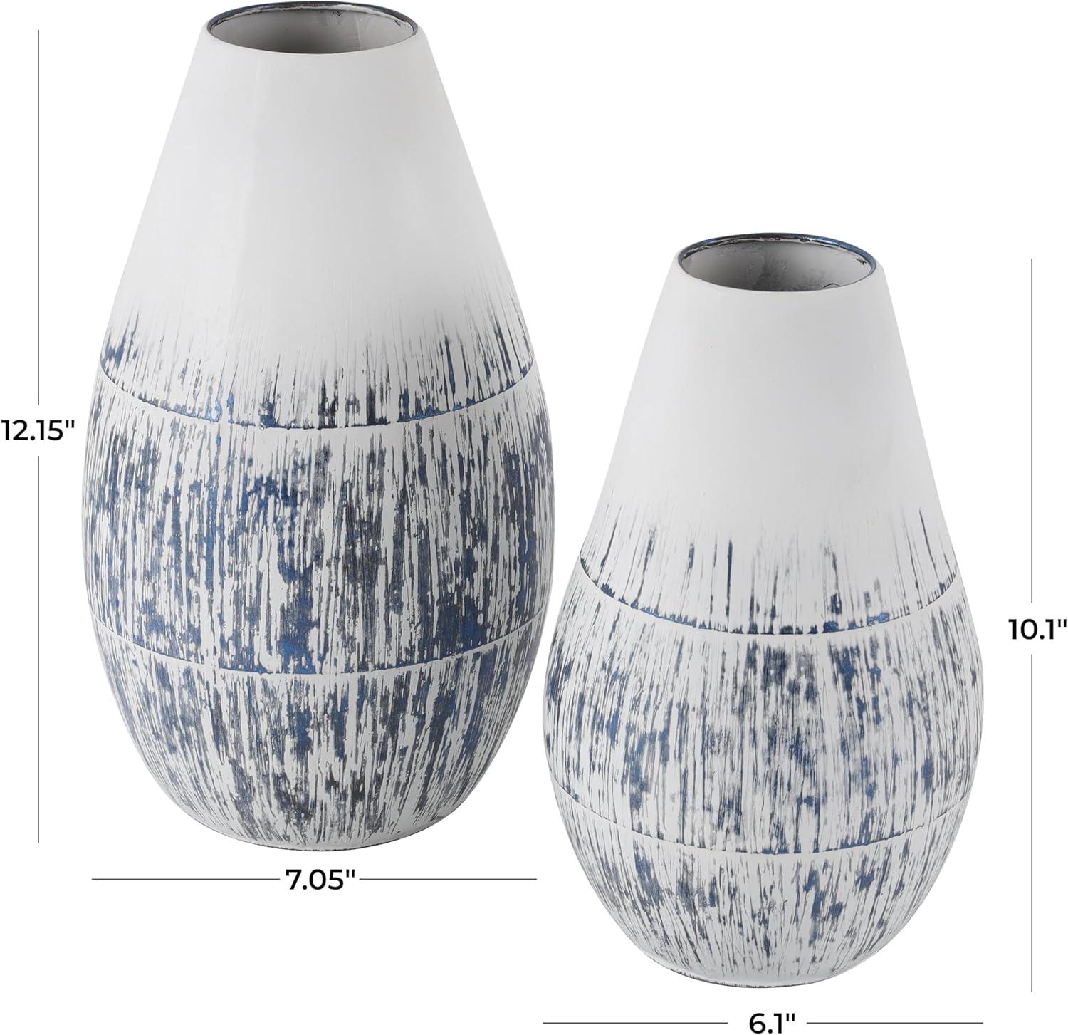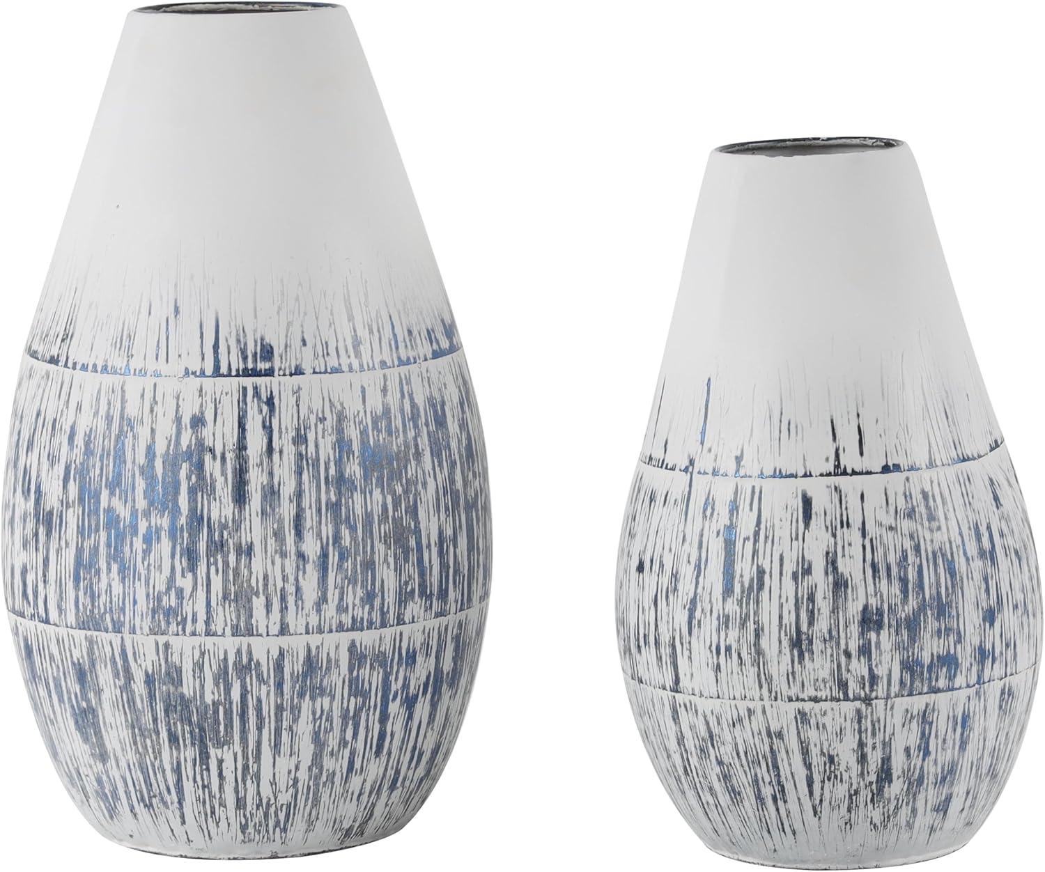This contemporary set of 2 vases for home decor is welded with iron and applied with a blue and white brushed finish. These matte blue vases for dried flowers' round shape offers a versatile and charming design that effortlessly enhances the beauty of your home decor. Wipe clean with a dry cloth. Arrange this blue set of 2 centerpiece vases together to create a captivating display or position them separately to accentuate living rooms, bedrooms or offices. Designed with felt or rubber stoppers at the base that prevent scratching furniture and table tops, as well as sliding around. This item ships in 1 carton. Iron vase makes a great gift for any occasion. Suitable for indoor use only. This item ships fully assembled in one piece. This blue colored iron vase comes as a set of 2. Contemporary style. Vases have 2.80 in, and 2.50 in mouth openings.