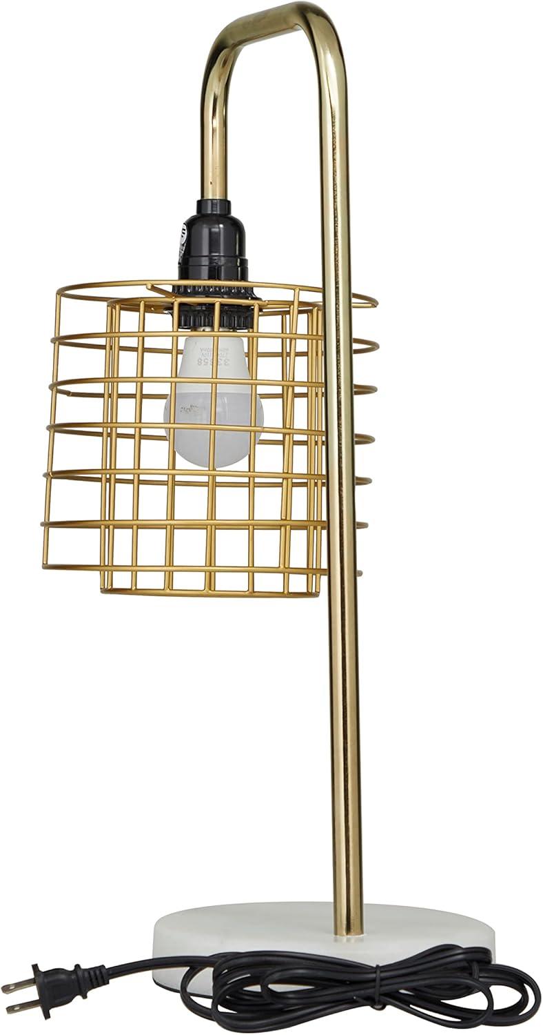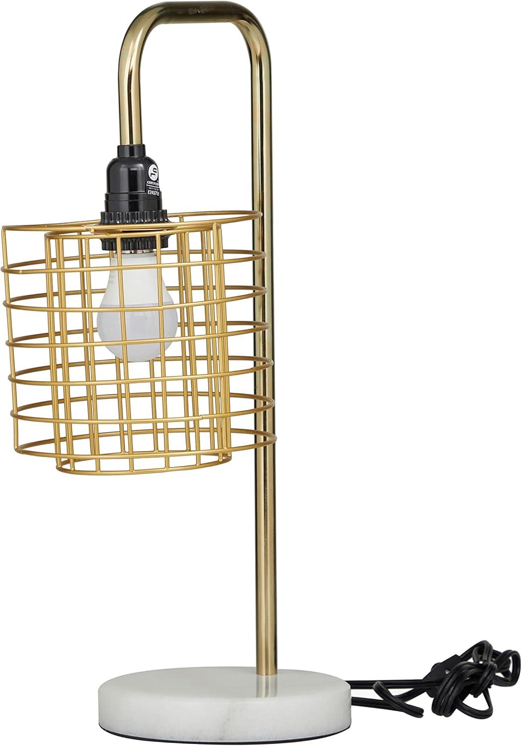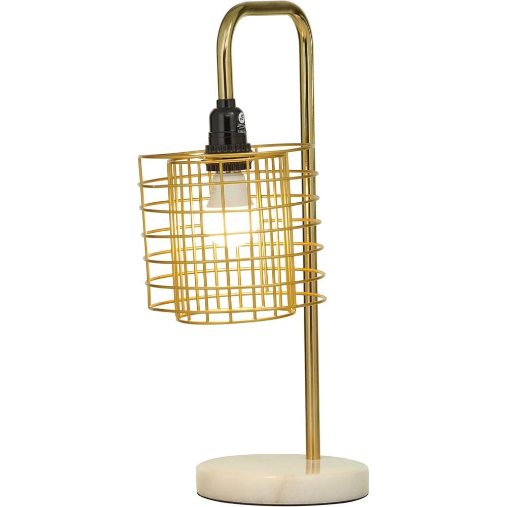 This eye catching lamp makes a playful addition to your surface space and beautifully illuminate its surrounding area. Make a statement with this unique lamp on mantle, console table or in any living space. Give your industrial style of home a chic illumination with this uniquely designed table lamp. Includes 1 60W Type A E26/Medium (Standard) bulb. This item ships in 1 carton. Comes with a 73″ cord length. Metal desk lamp makes a great gift for any occasion. Suitable for indoor use only. This item ships fully assembled in one piece. Desk lamp comes with a gold drum shaped shade that measures 7 x 7 x 7 inches. Includes a rotary switch. Marble is a product of nature and no two pieces are exactly alike. It is prone to variations in color and/or patterns in the material that add to the beauty and charm of the piece.. This is a single gold colored accent lamp. Industrial style.