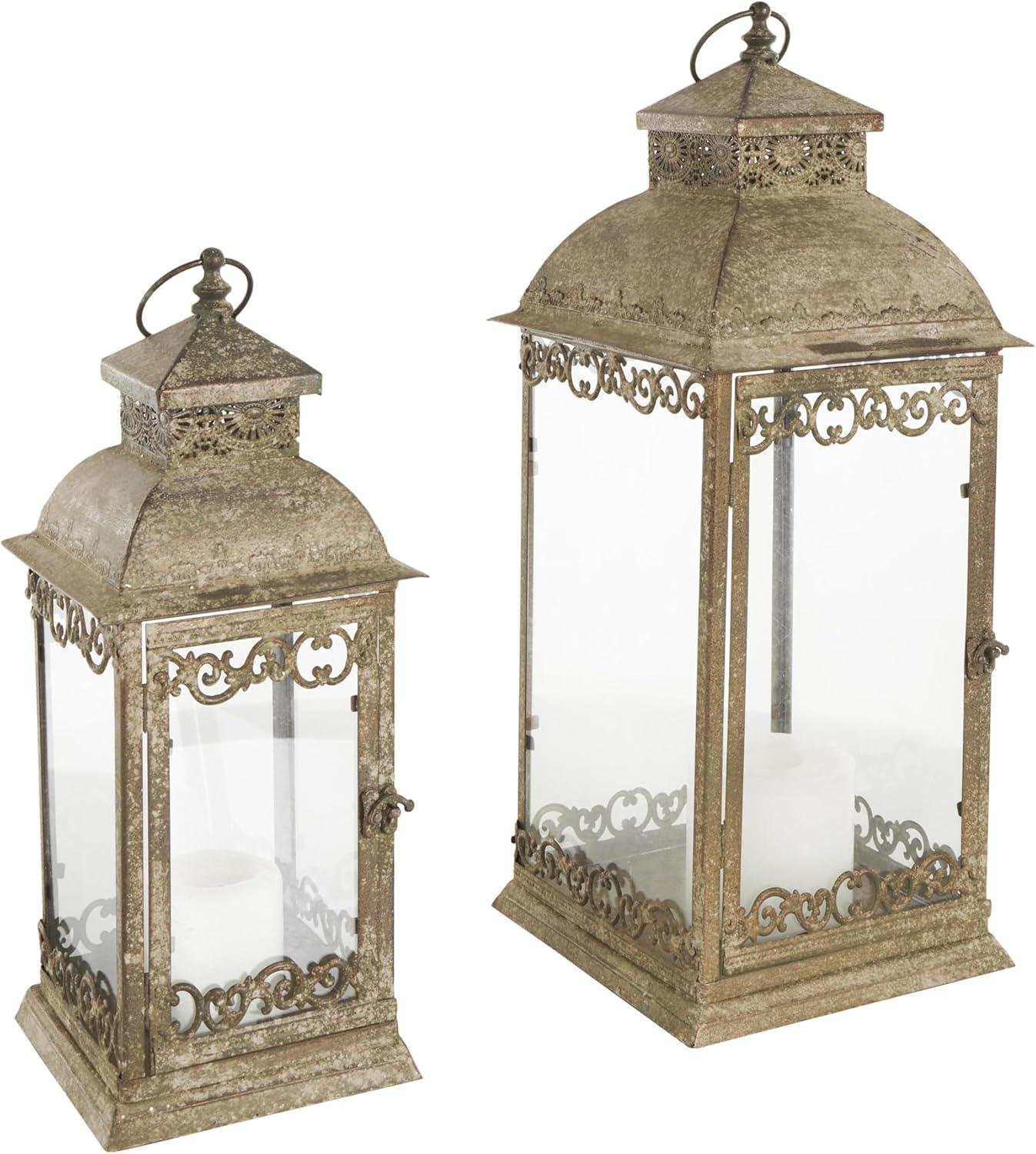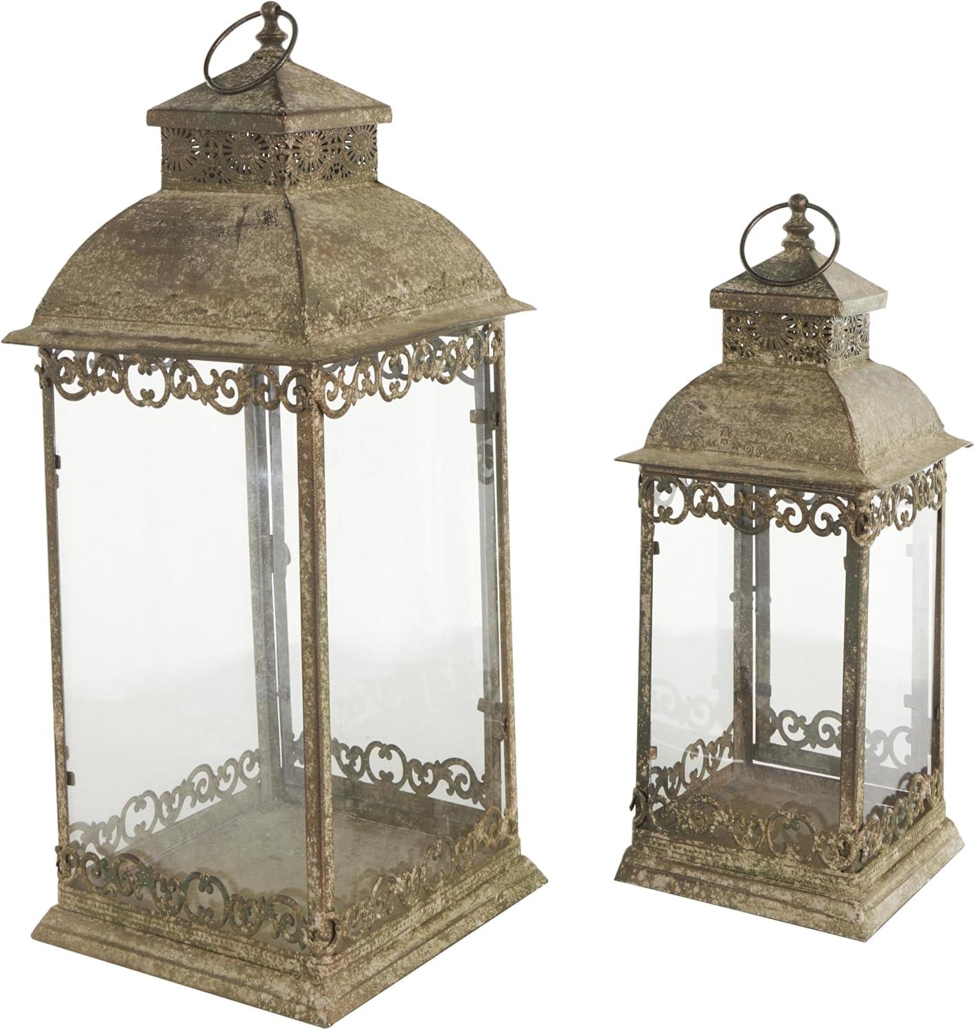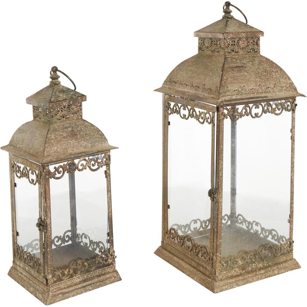 Enhance the ambiance of your home by placing this vintage candle lantern set on a tabletop, or hanging, to create a warm and inviting atmosphere. Can hold 2 pillar candles, not included. This item ships in 1 carton. Please note that this item is for decorative use only. Metal candle lantern makes a great gift for any occasion. Suitable for indoor use only. This item ships fully assembled in one piece. This brown colored metal decorative candle lantern comes as a set of 2. Rustic style.