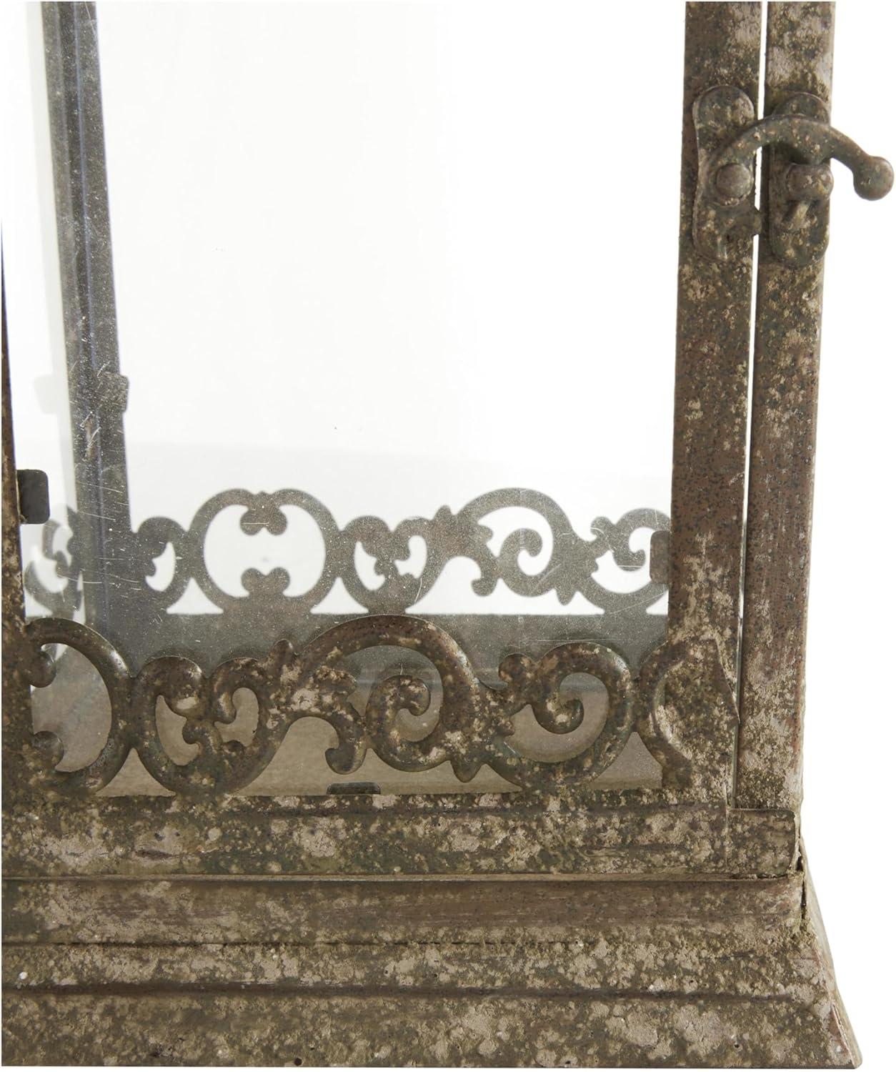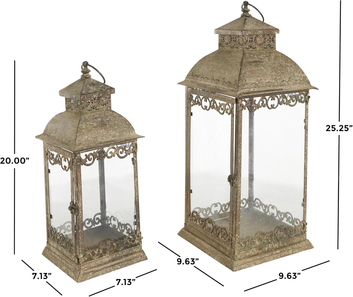 BROWN AND CLEAR DISTRESSED FINISH: A set of 2 candle lanterns that exhibit a distressed brown finish with subtle green hints and clear glass panels, imbuing an authentic vintage appeal