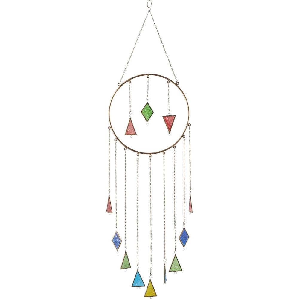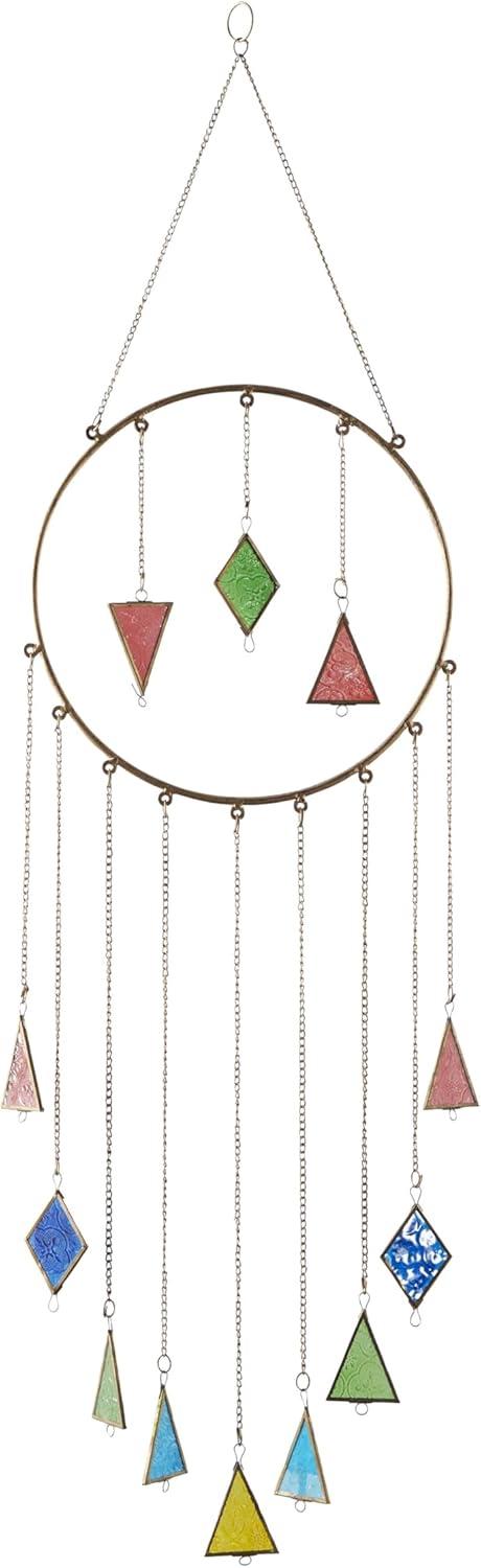 Iron is sculpted and chained glass mirrors are attached on its base for a playful windchime design. Hanging windchime features a round dreamcatcher inspired metal base with geometric glass mirror chimes. Wipe clean with a dry cloth. Give your surface space a finishing touch with these beautifully crafted windchime inspired dreamcatcher. The soothing sound of this windchime will keep you relax and rejuvenated throughout the day. Create a serene vibe within your balconies and kitchen windows as you hang this whimsical glass windchime. This item ships in 1 carton. Metal windchime makes a great gift for any occasion. Can be hung vertically using the metal chain; nails and screws not included. Suitable for indoor use only. This item ships fully assembled in one piece. Made in India. This is a single multi colored wind chime. Contemporary style.