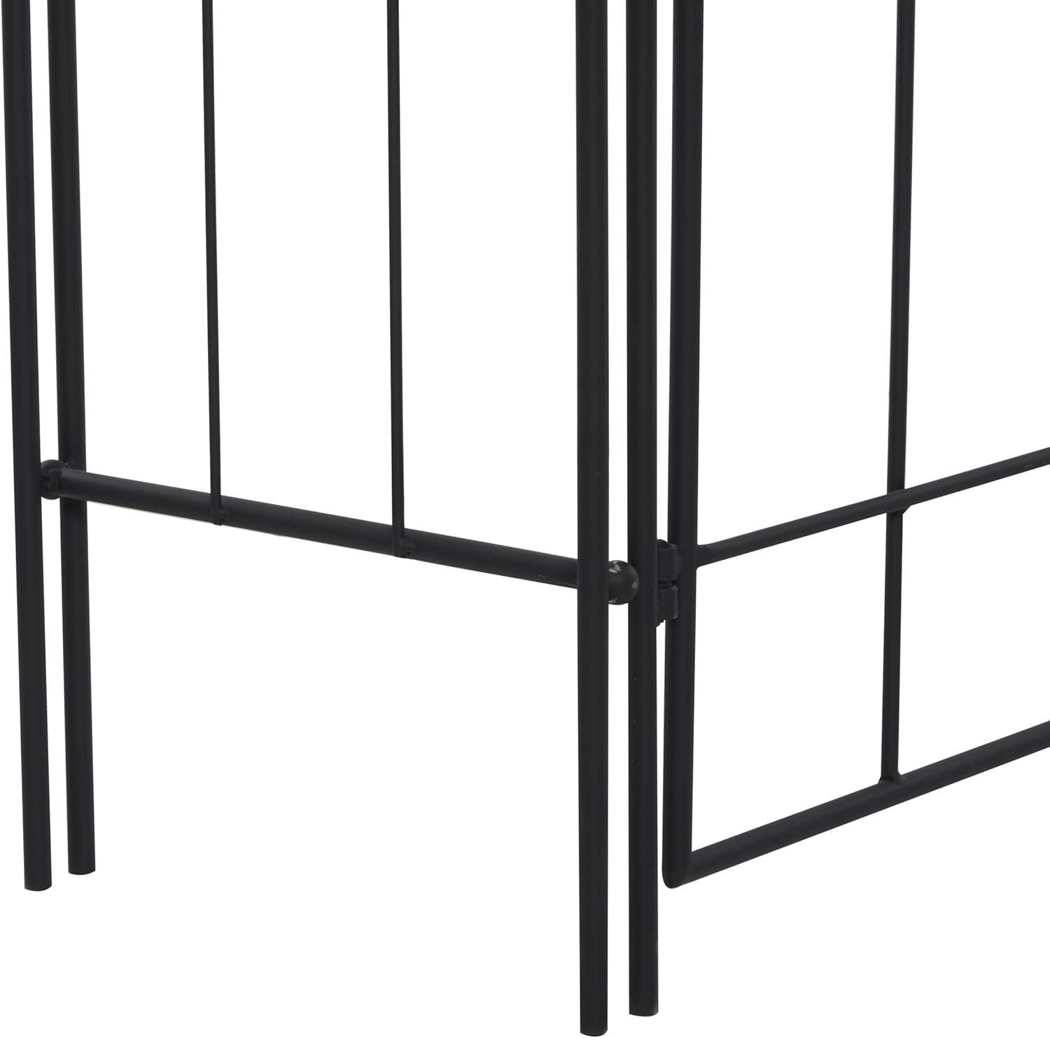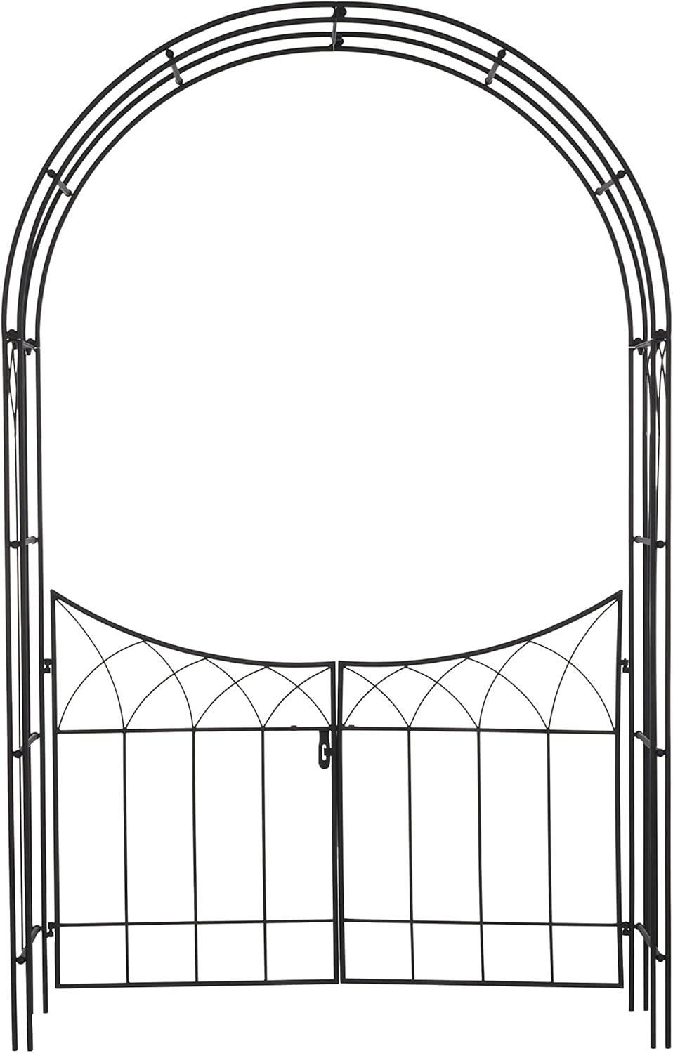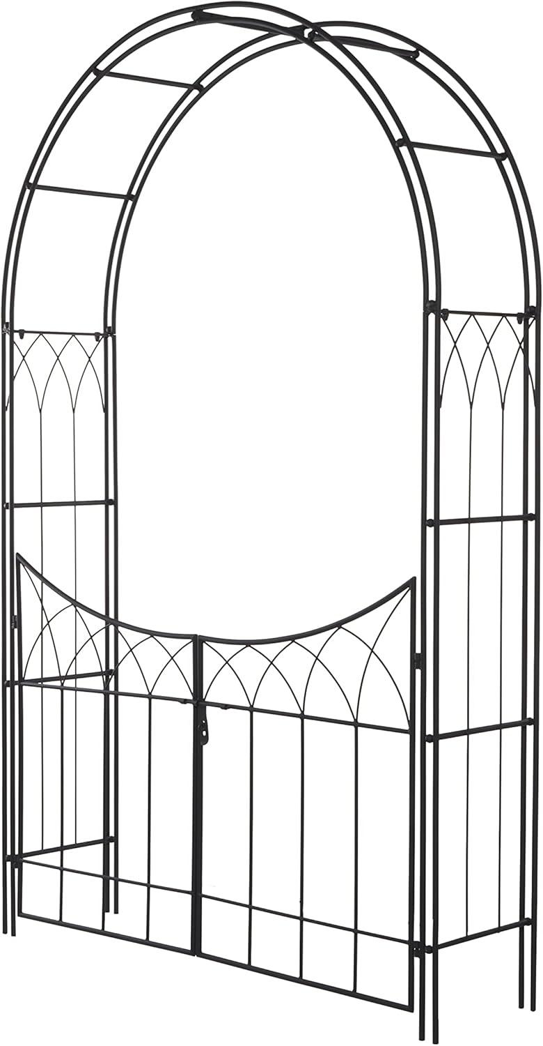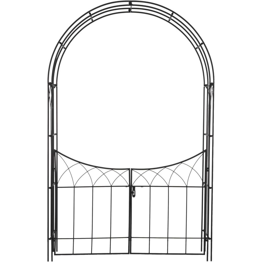 Trellis is made from bent and welded metal with hinged the gate doors. This garden arbor accentuates an arched form with a fence gate. Wipe clean with a dry cloth. A creative way to add a welcoming look with bold design into your outdoor setting. This garden arbor is perfect for creating a focal point over in your outdoor patio space. Welcome your guests while flaunting your flowering vines with this arch garden arbor trellis with gates. This item ships in 1 carton. Outdoor garden accent requires stakes to secure it to the ground; stakes are not included. Suitable for indoor and outdoor use. Some assembly required. This is a single black colored garden gate. Traditional style.