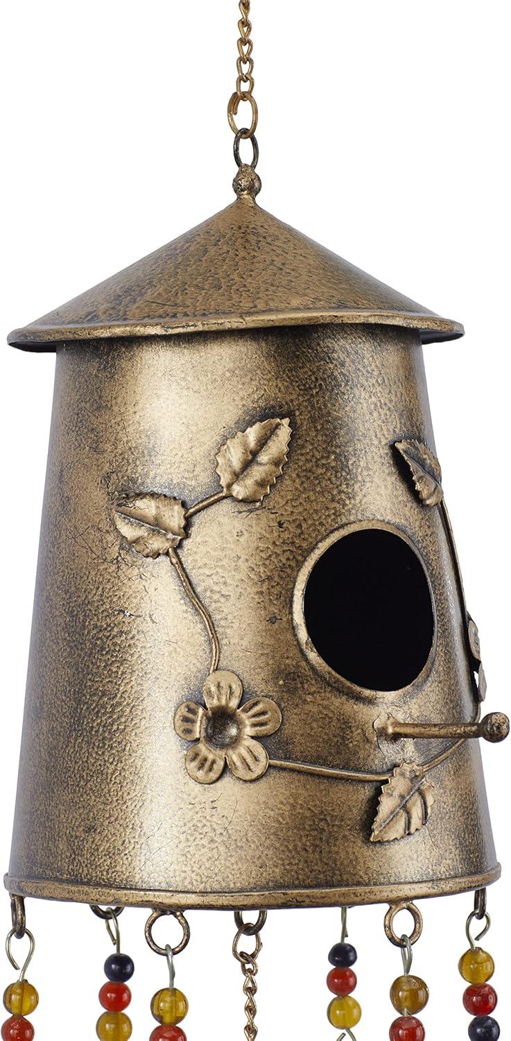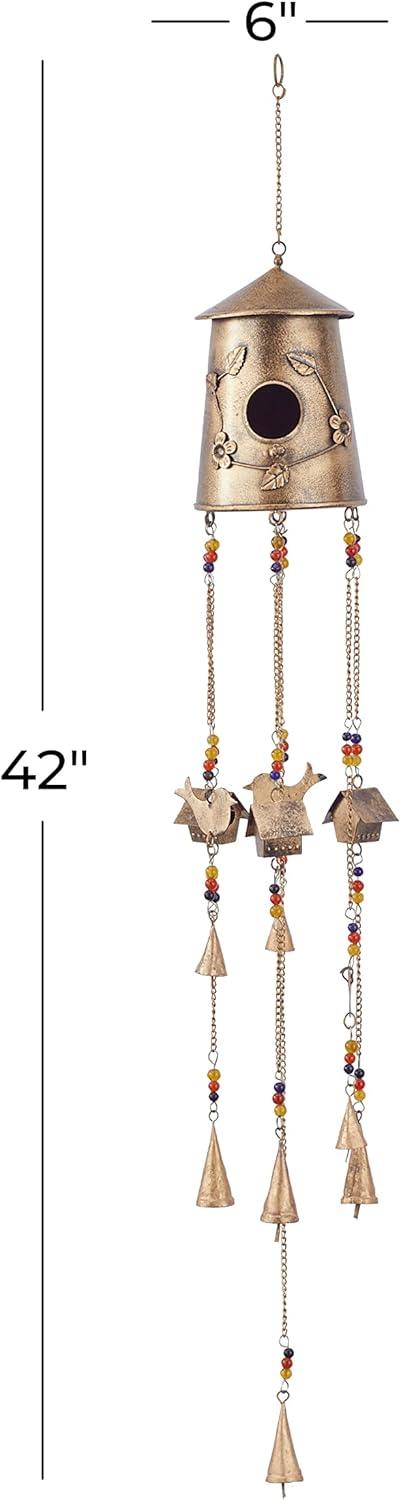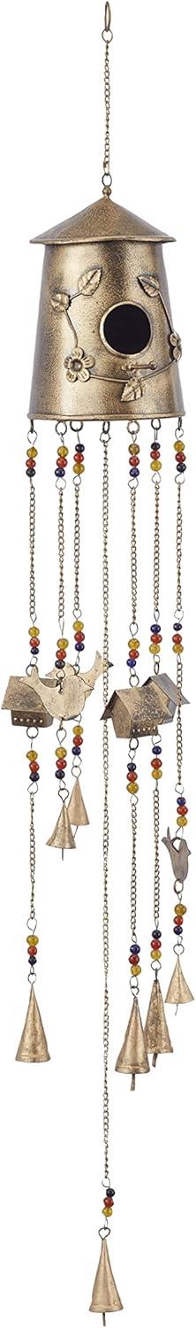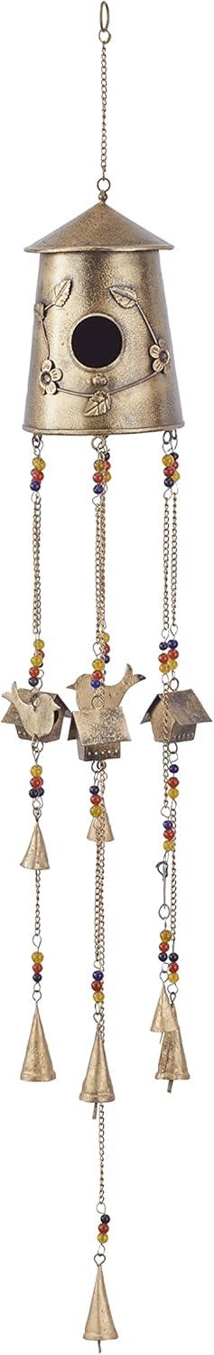 The iron of this accent piece is welded intricately to form a bird house structure with attached chains. A rustic wind chime featuring a bird house structure with round bead details. Wipe clean with a dry cloth. Nature’s own music sounds best when accompanied by the gentle tones of this wind chime that will extend a warm welcome to all your guests. This item ships in 1 carton. Metal windchime makes a great gift for any occasion. Can be hung vertically using the metal chain; nails and screws not included. Suitable for indoor and outdoor use. This item ships fully assembled in one piece. Made in India. This is a single bronze colored wind chime. Rustic style.