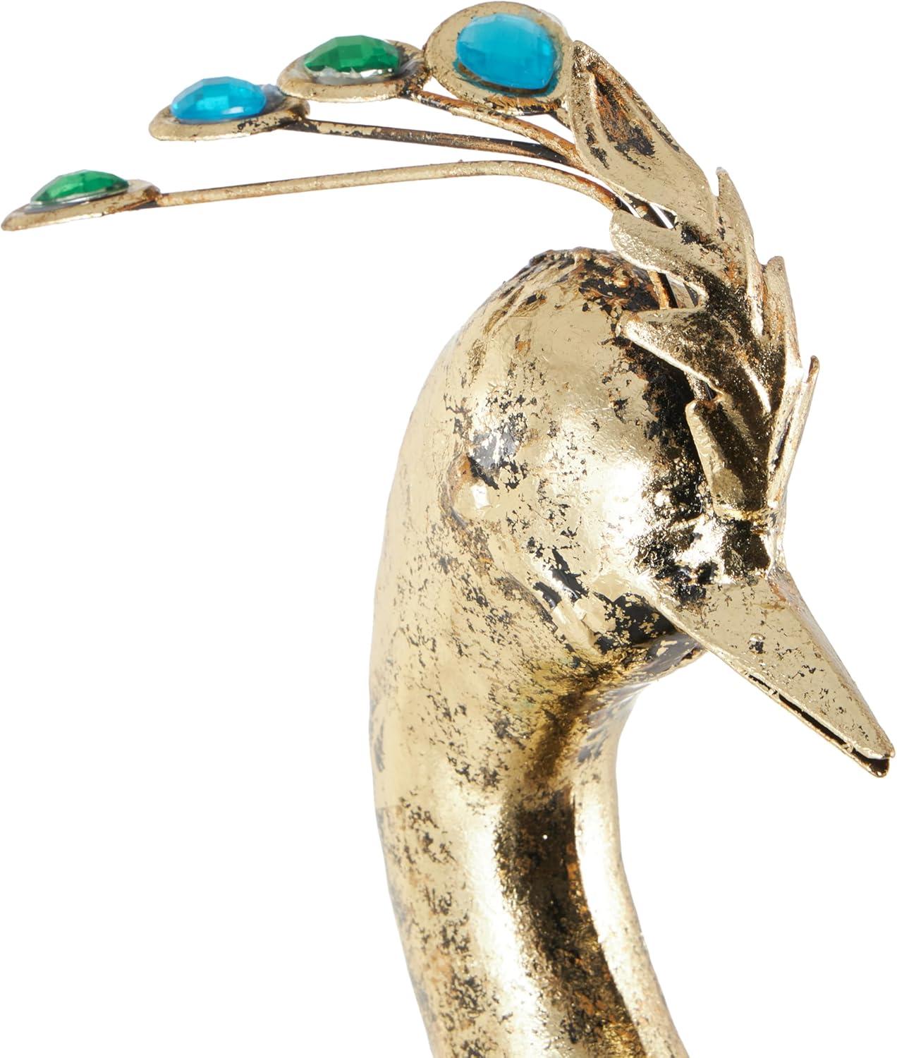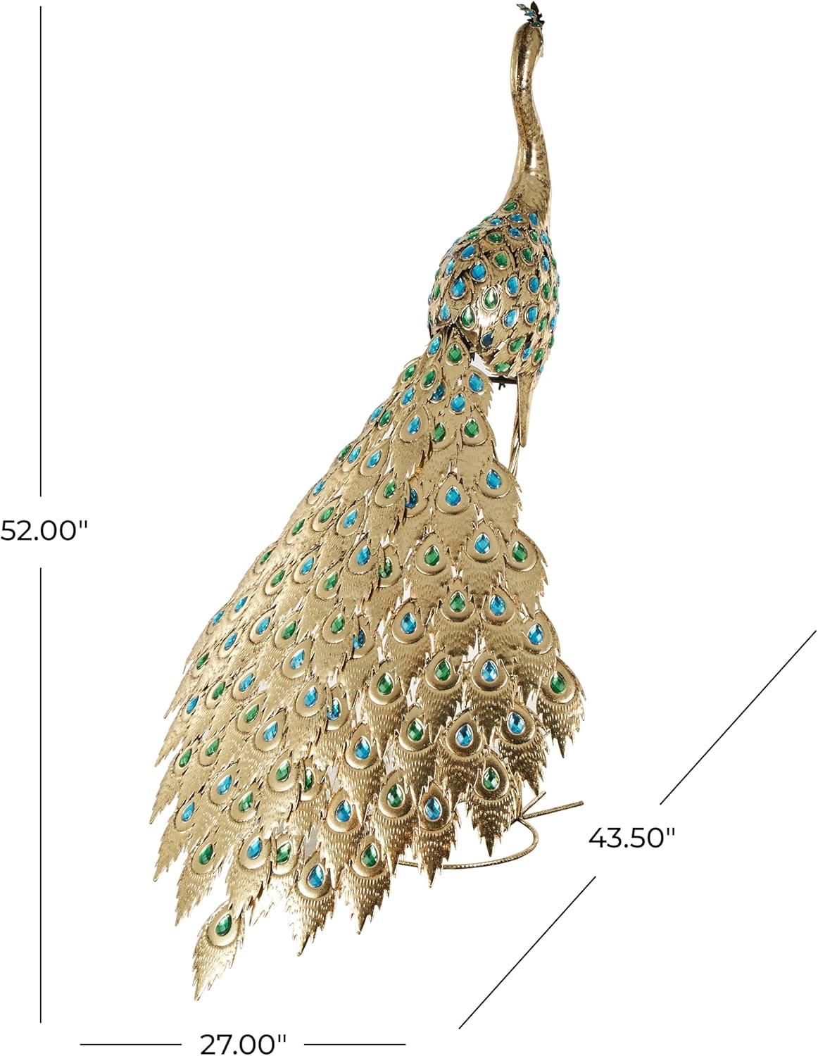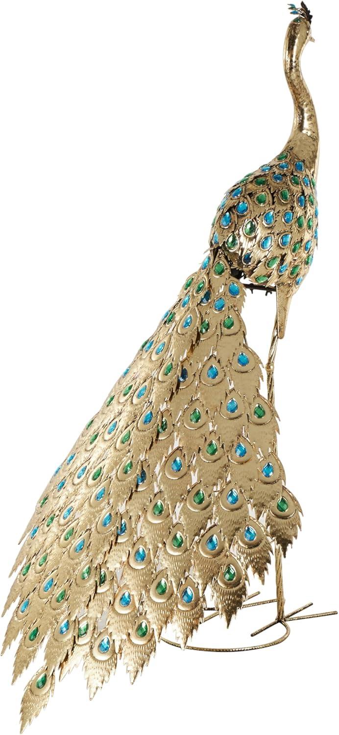 This contemporary garden decor sculpture is welded from iron into a peacock form with hand-placed jewels for a stunning effect. This satin brass outdoor decorative sculpture captures the elegant shape of a peacock with diamond shaped jewels that bring color and shine to any space. Wipe clean with a dry cloth. This peacock garden statue is perfect for enhancing any outdoor or indoor space like patios, living rooms or gardens. Designed with felt or rubber stoppers at the base that prevent scratching furniture and table tops, as well as sliding around. This item ships in 1 carton. Suitable for indoor and outdoor use. This item ships fully assembled in one piece. This is a single brass colored garden statue. Contemporary style.