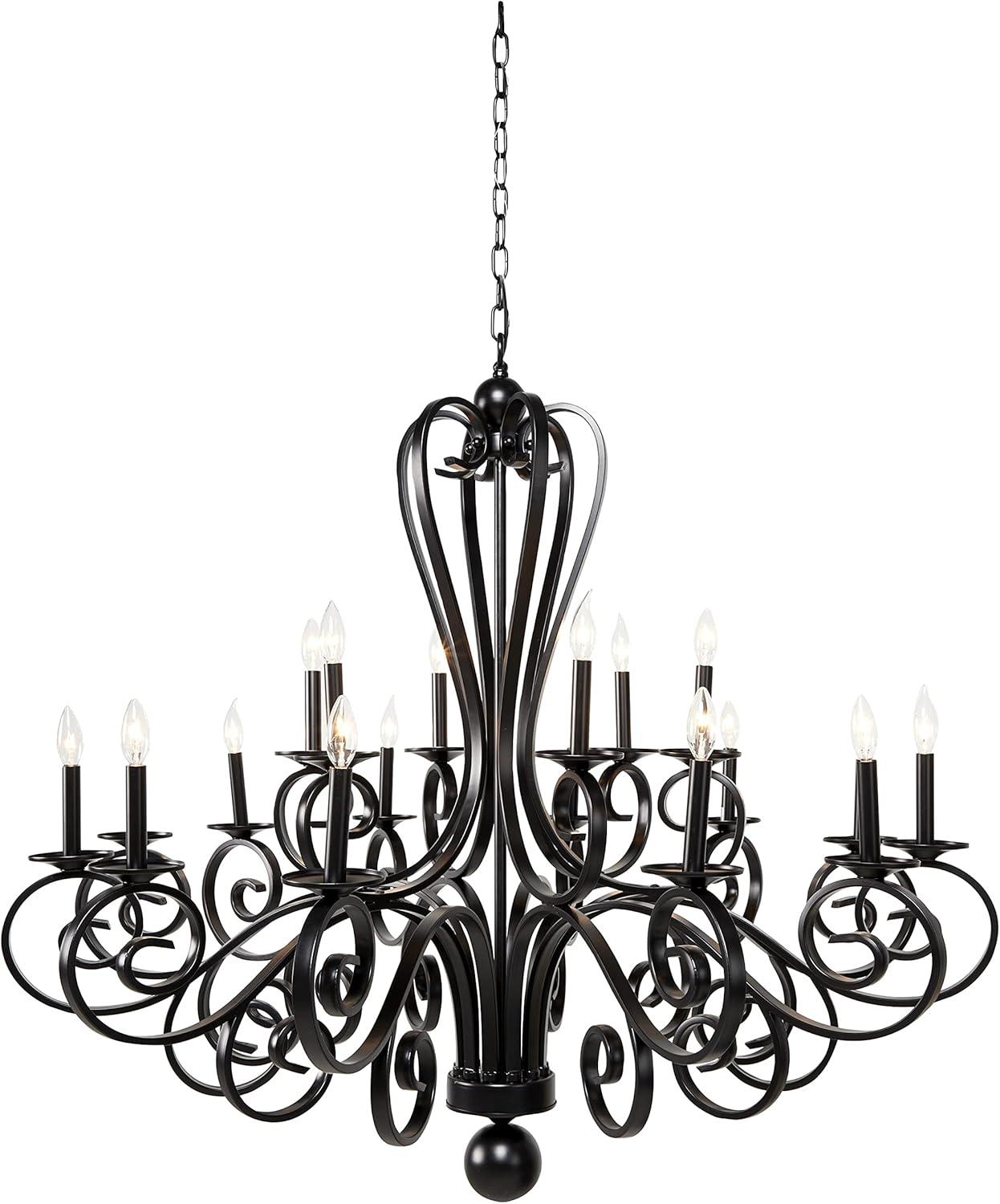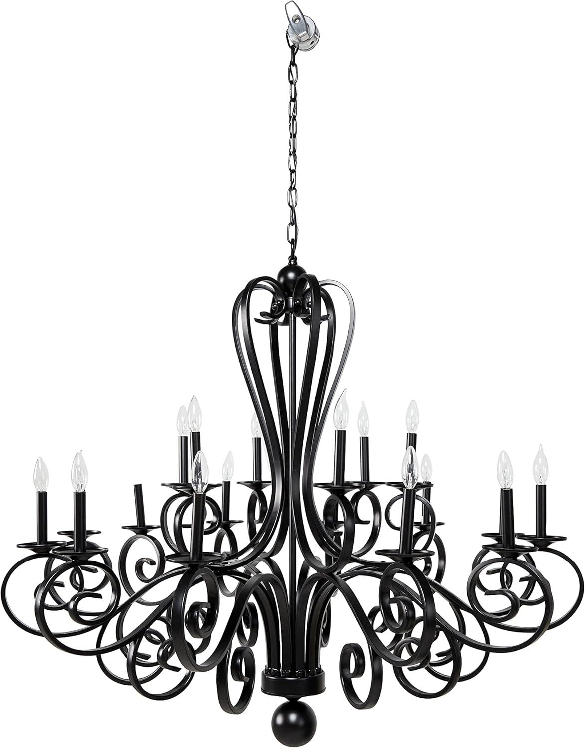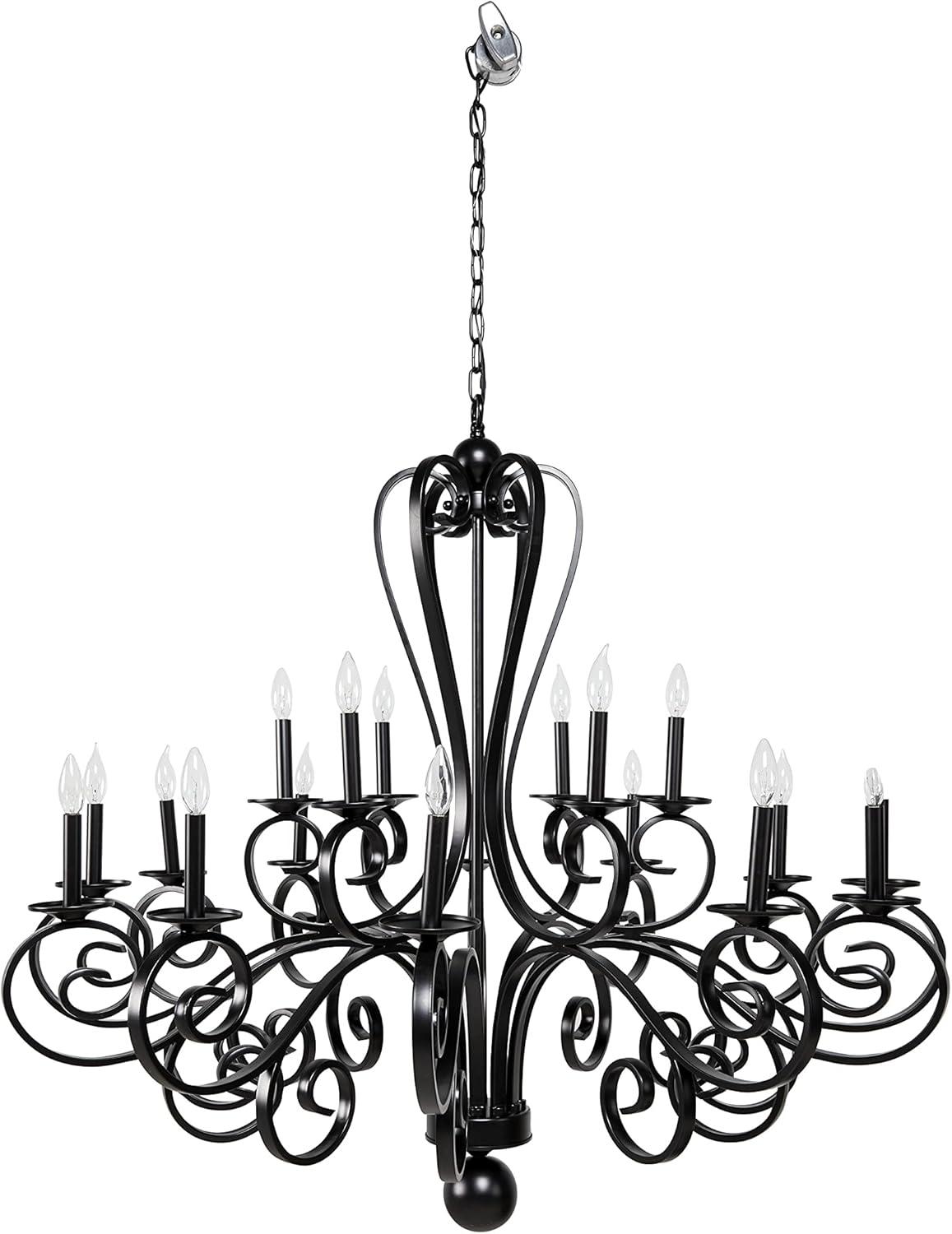 Maximize your ceiling space to add depth and dimensions in your home with this gorgeous chandelier. Beautifully designed and well crafted chandelier features eye catching structure for a mesmerizing focal point any where in your home. Enhance the lighting of your space and create a moody aesthetic with this lavish scrolled chandelier that is perfect for a high-ceiling entryway or living room. Requires 18 40W Type B E12/Candelabra bulbs. This item ships in 1 carton. Hang decorative light with hardwired canopy and chain; nails and screws are not included. Suitable for indoor use only. Some assembly required. Includes a hardwire switch. Maximum weight limit is 100 lbs. This is a single black colored ceiling light. Vintage style.