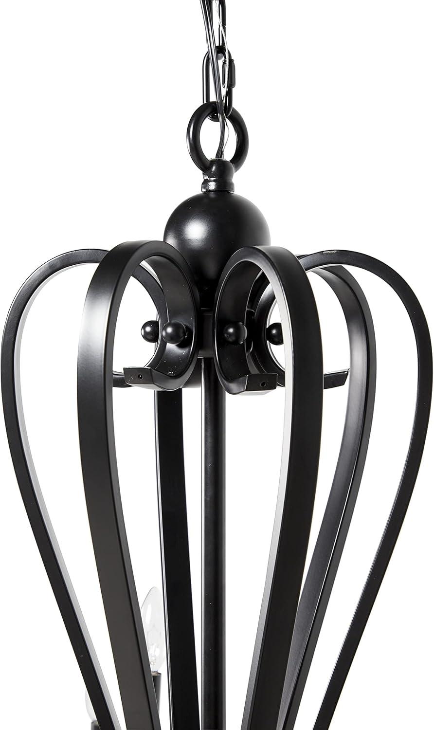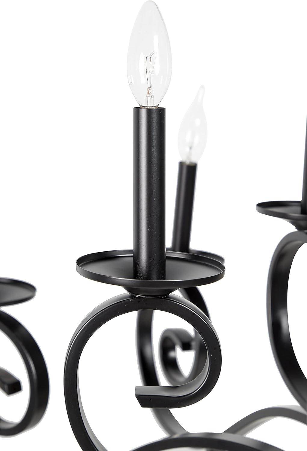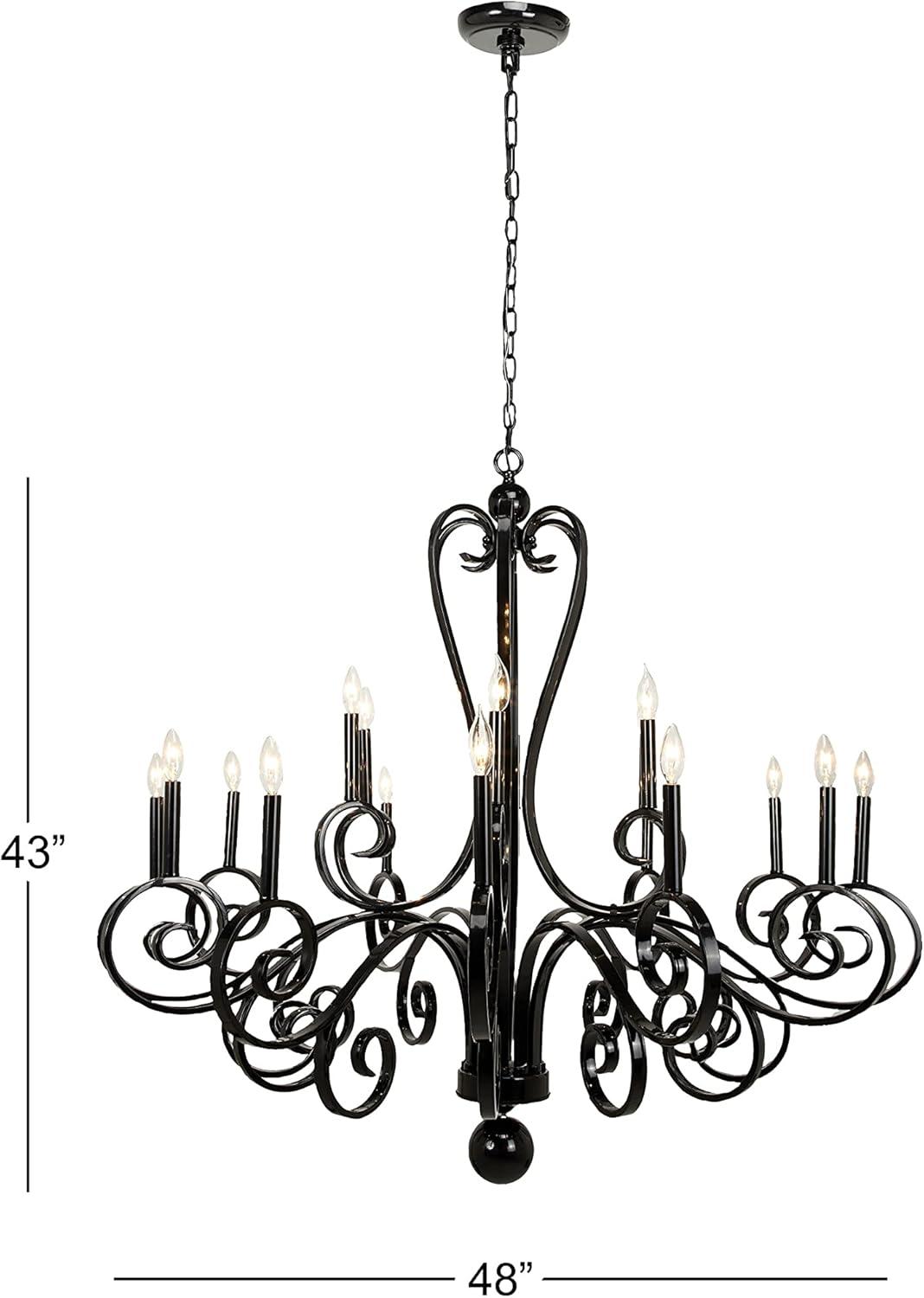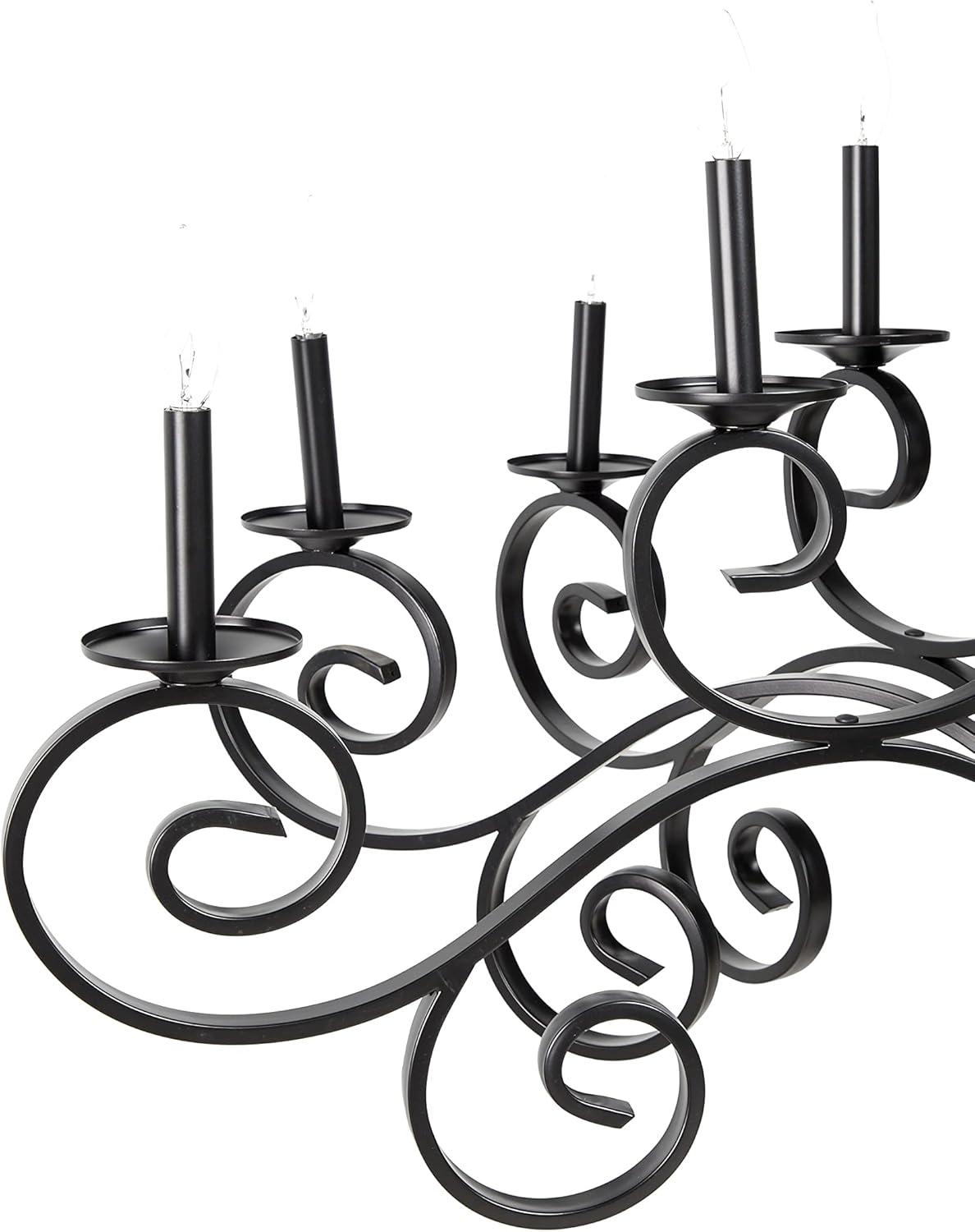 Maximize your ceiling space to add depth and dimensions in your home with this gorgeous chandelier. Beautifully designed and well crafted chandelier features eye catching structure for a mesmerizing focal point any where in your home. Enhance the lighting of your space and create a moody aesthetic with this lavish scrolled chandelier that is perfect for a high-ceiling entryway or living room. Requires 18 40W Type B E12/Candelabra bulbs. This item ships in 1 carton. Hang decorative light with hardwired canopy and chain; nails and screws are not included. Suitable for indoor use only. Some assembly required. Includes a hardwire switch. Maximum weight limit is 100 lbs. This is a single black colored ceiling light. Vintage style.