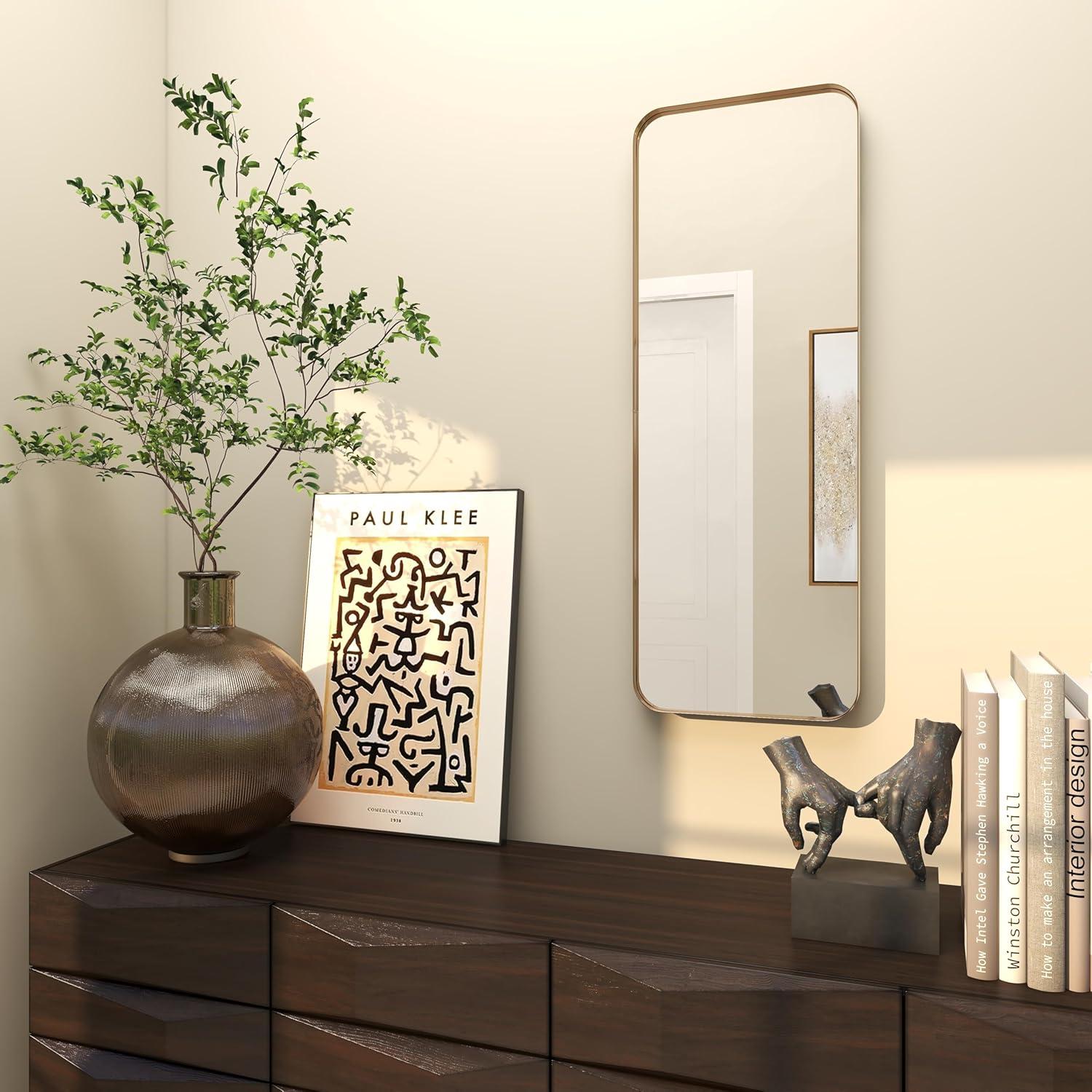 LARGE SIZE The gold metal wall mirror measures 12.95L x 1.75W x 35.85H inches, and weighs 8.83 lbs