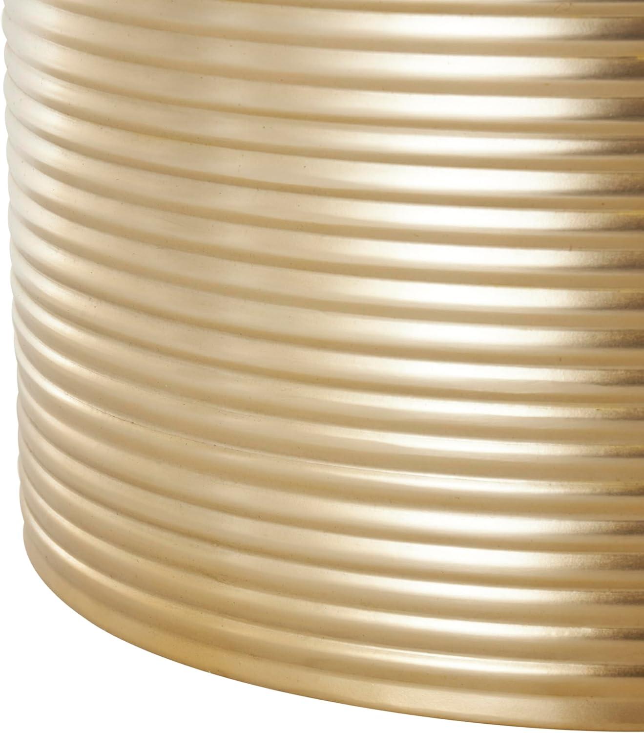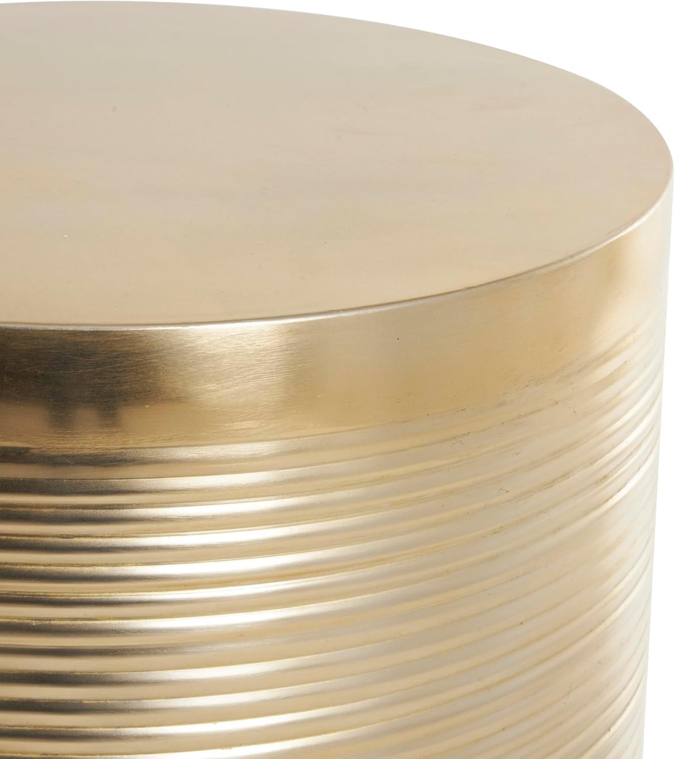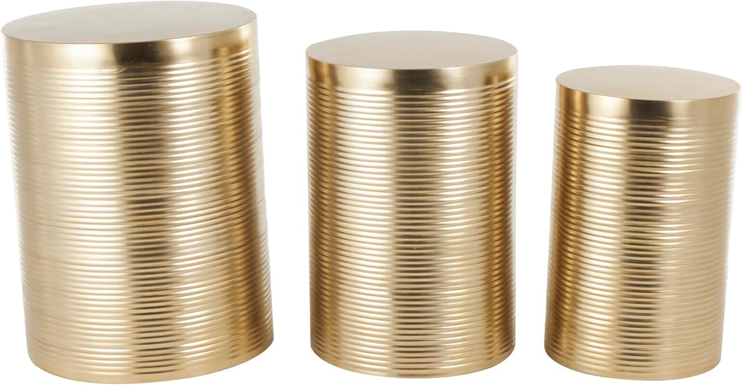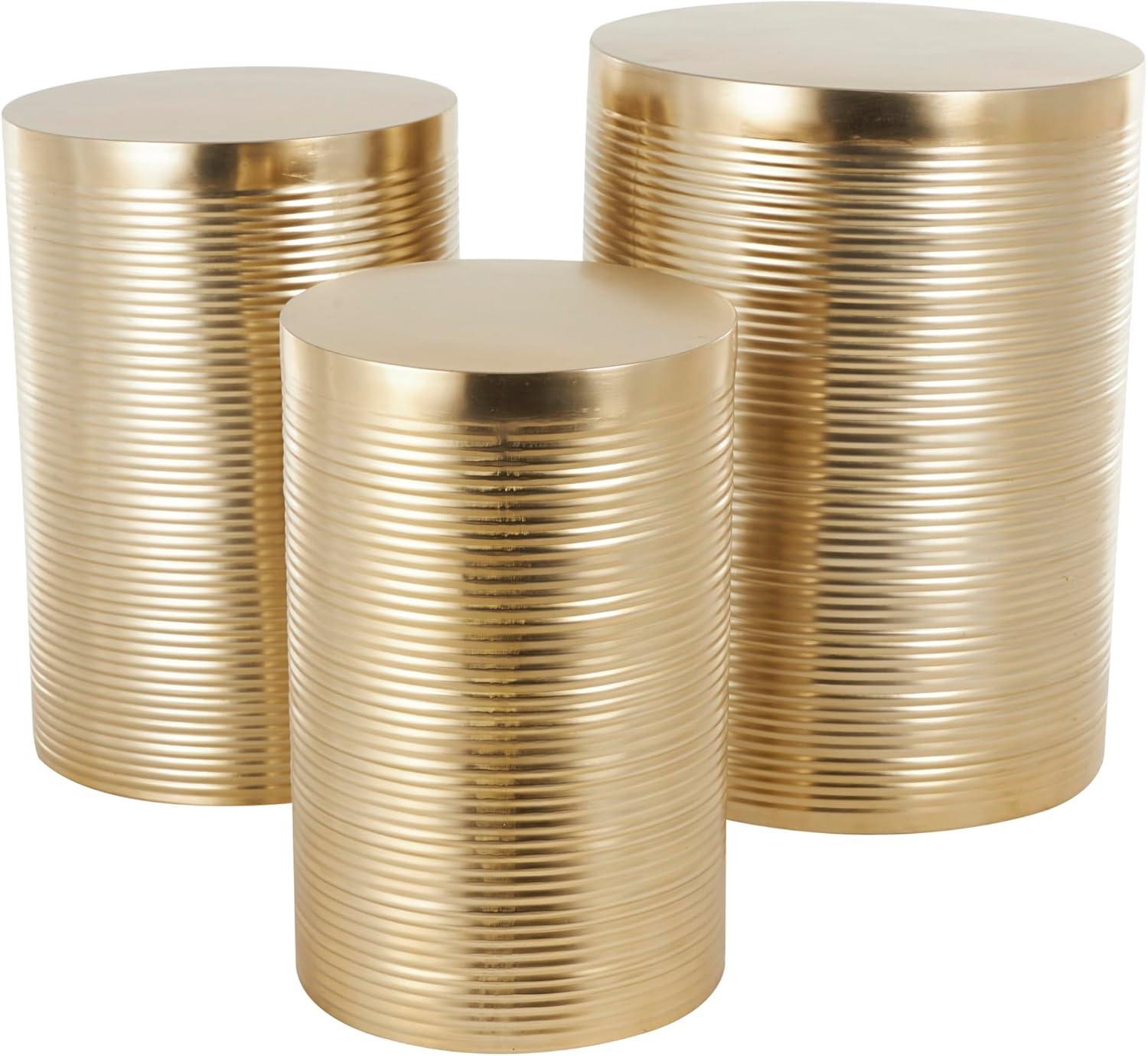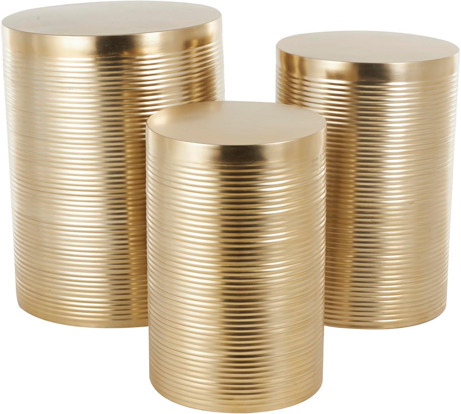 GOLD LIVING ROOM TABLES: Ribbed cylinder table set exhibits a shiny gold finish, exuding a contemporary and sophisticated vibe