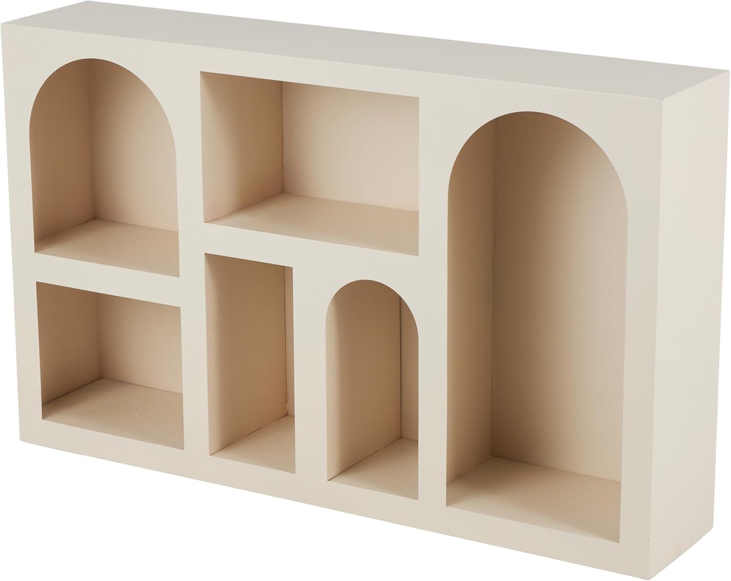 This modern shelving unit is welded from matte black metal in a geometric design with perfectly shaped shelves. The matte black shelving unit has arched, square, and rectangular storage spaces. Wipe clean with a dry cloth. The geometric shelving unit is perfect for living rooms, offices, or bedrooms. This item ships in 1 carton. Iron shelving unit makes a great gift for any occasion. Suitable for indoor use only. This item ships fully assembled in one piece. Maximum weight limit is 20 lbs. This is a single black colored display shelf. Iron shelving unit features 5 shelves. Modern style.