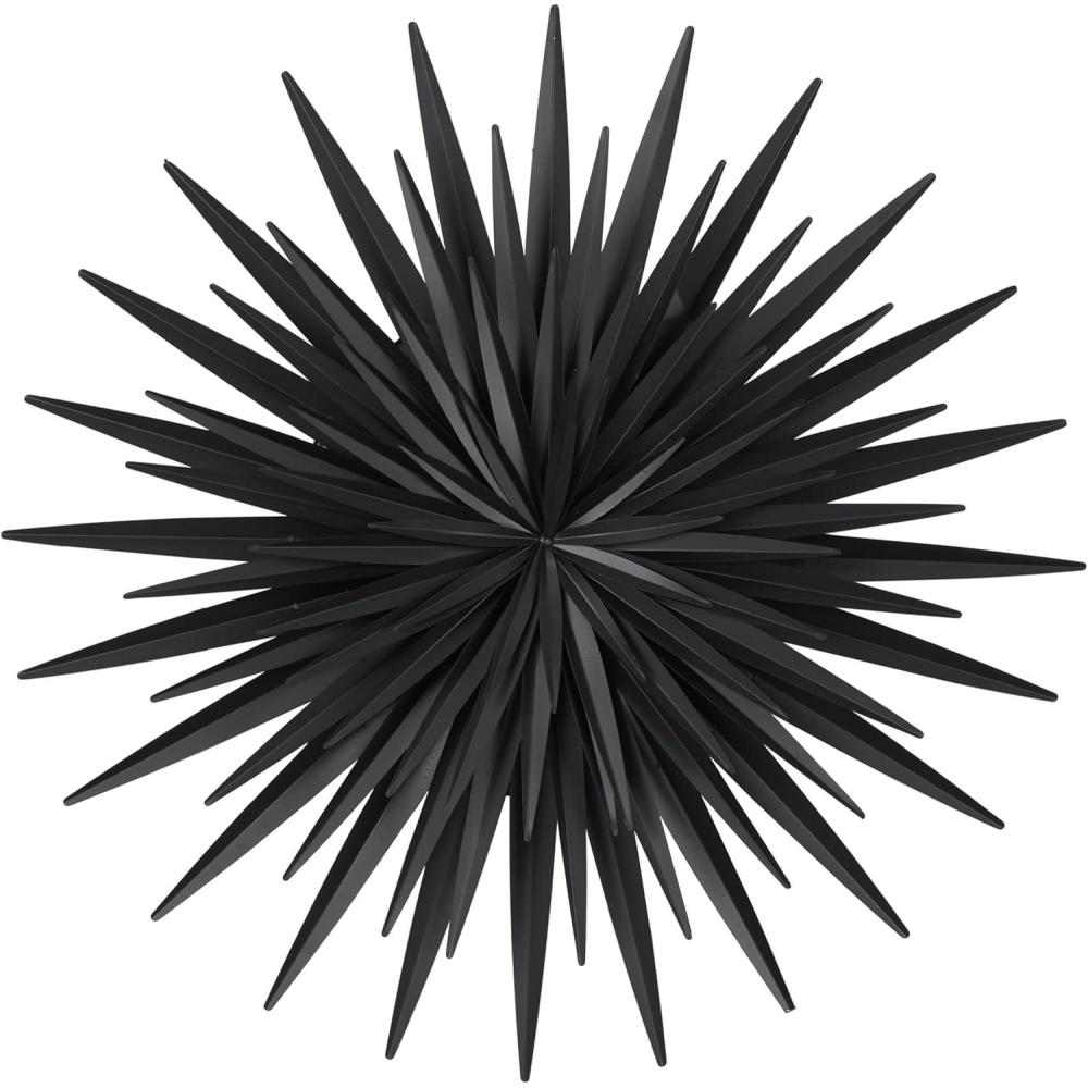 Each piece of iron in this modern room wall decor has been meticulously layered and welded together to create a 3D effect that adds depth and dimension. Despite its complex design, this matte black wall art for living room maintains a round shape, symbolizing unity and wholeness in its modern interpretation of a sunburst. Wipe clean with a dry cloth. This sunburst wall sculpture can be hung as a captivating focal point in your living room, bedroom, or hallway to add a touch of contemporary elegance to your space. This item ships in 1 carton. Can be hung vertically using the keyholes; nails and screws not included. Suitable for indoor use only. This item ships fully assembled in one piece. This is a single black colored wall sculptures. Modern style.