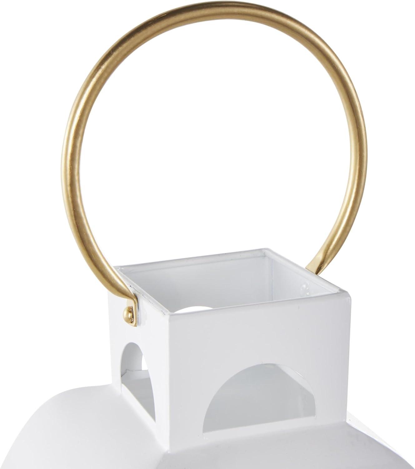 WHITE AND GOLD MATTE FINISH: A pristine matte white candle lantern with tall arched cutout and a and gold handle
