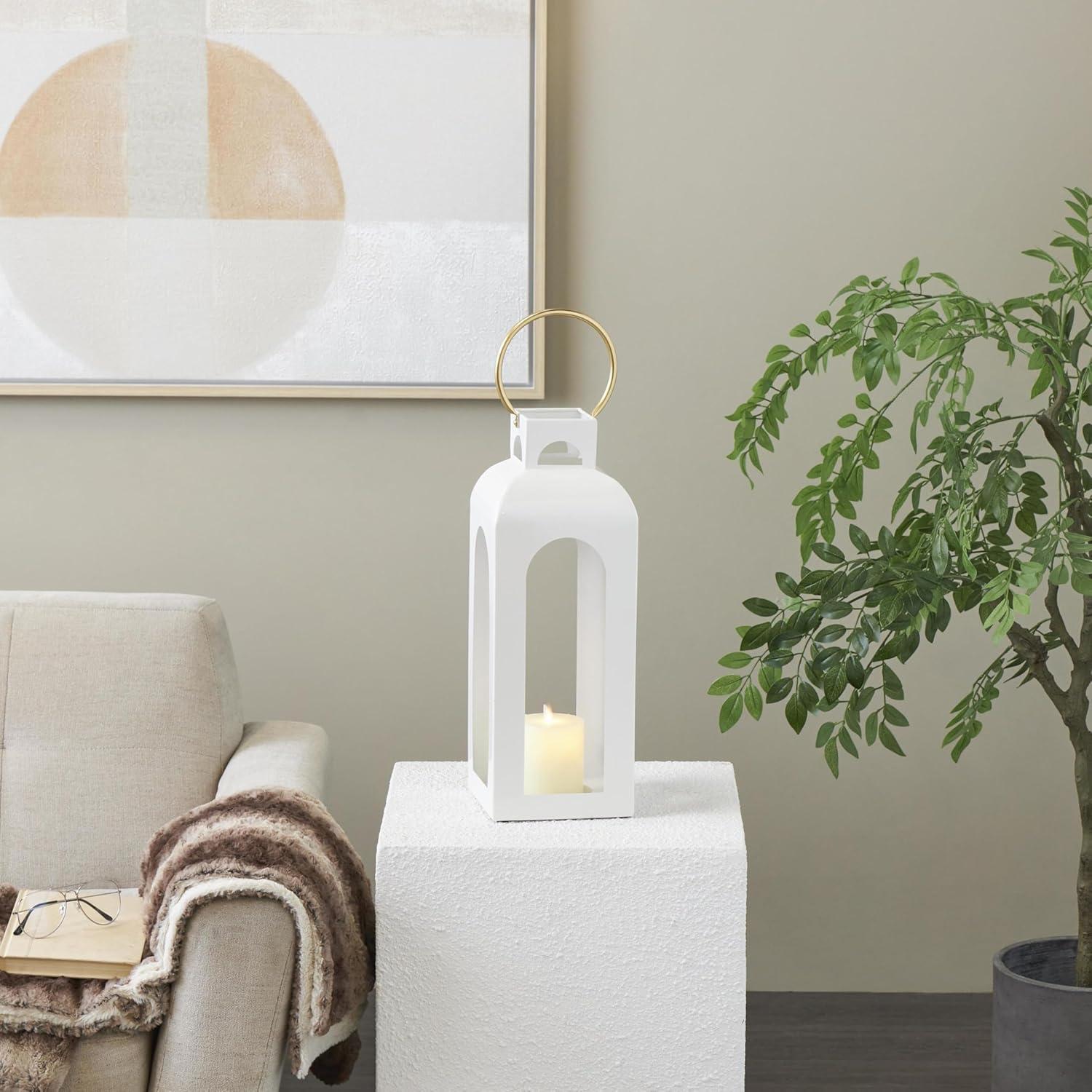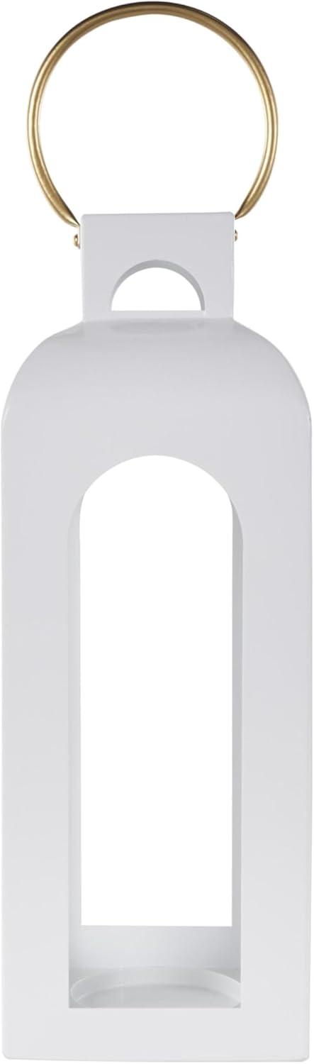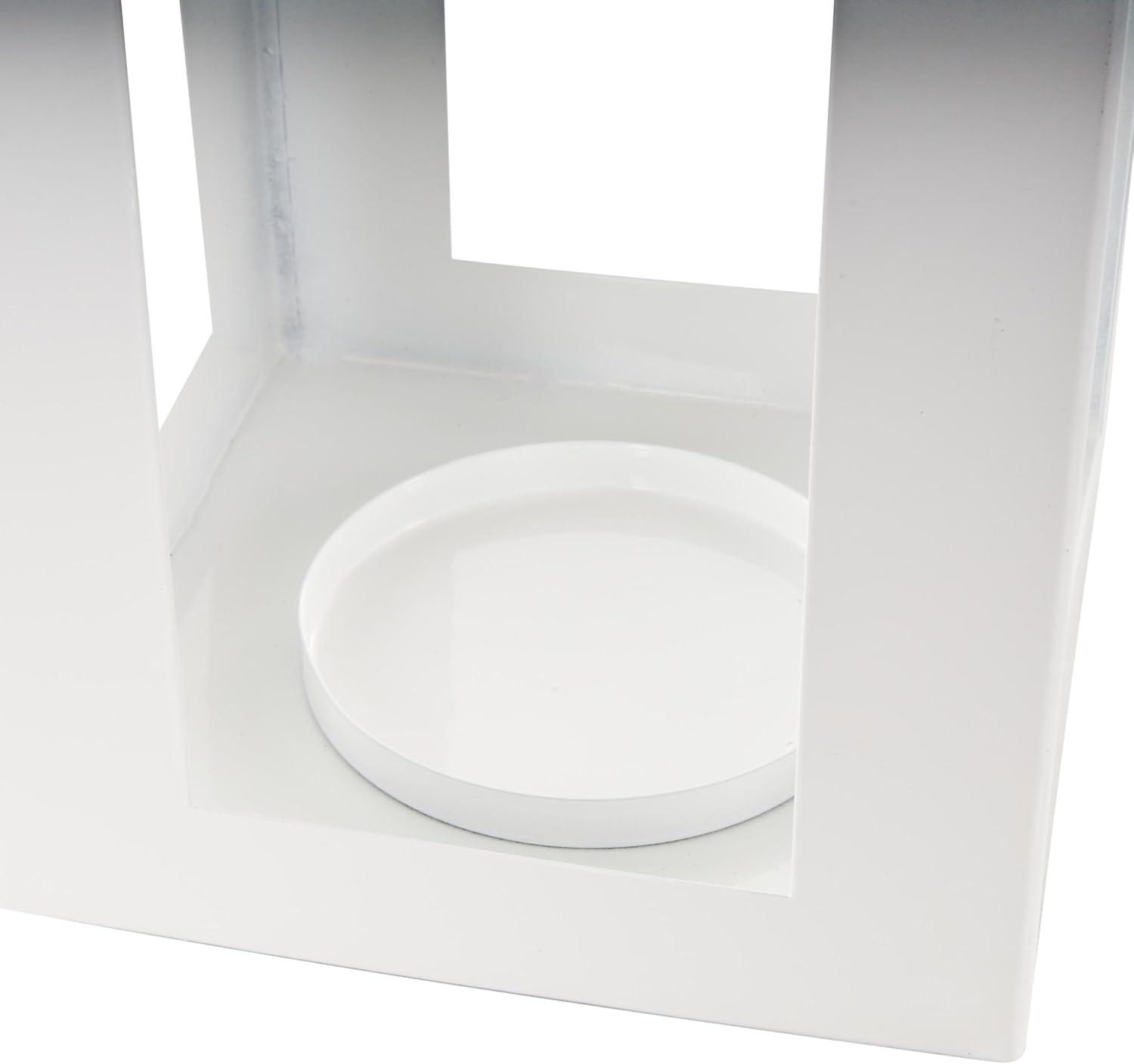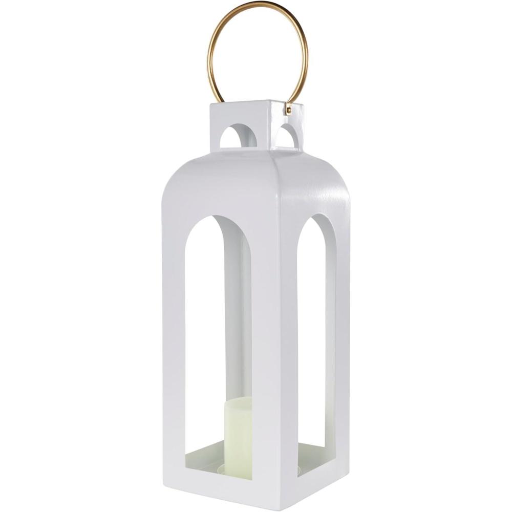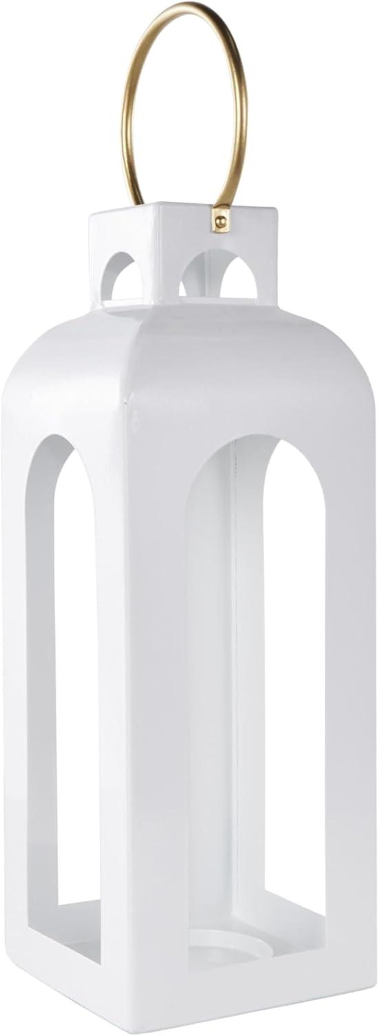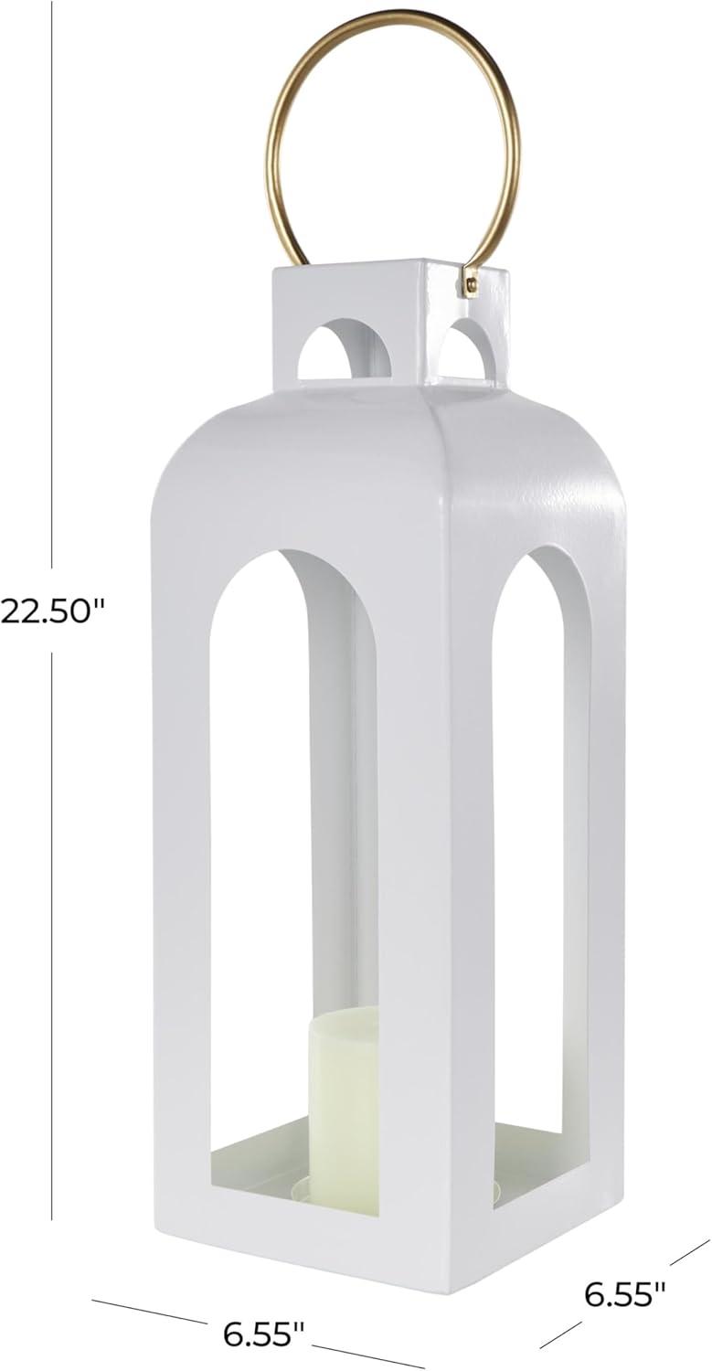Place this candle lantern as a centerpiece on your dining table or as an accent piece in your living room, creating a warm and inviting atmosphere when filled with a candle. Designed with felt or rubber stoppers at the base that prevent scratching furniture and table tops, as well as sliding around. Can hold 1 pillar candle, not included. This item ships in 1 carton. Please note that this item is for decorative use only. Metal candle lantern makes a great gift for any occasion. Suitable for indoor use only. This item ships fully assembled in one piece. This is a single white colored decorative candle lantern. Transitional style.