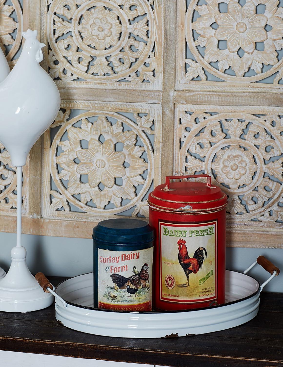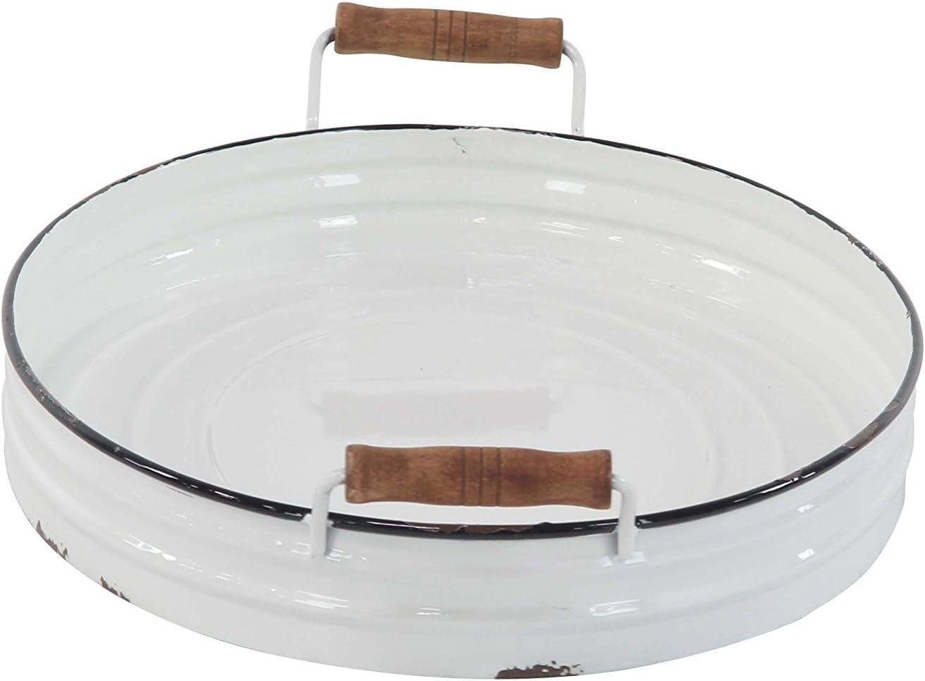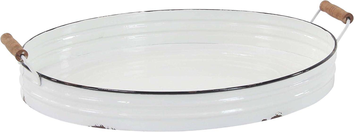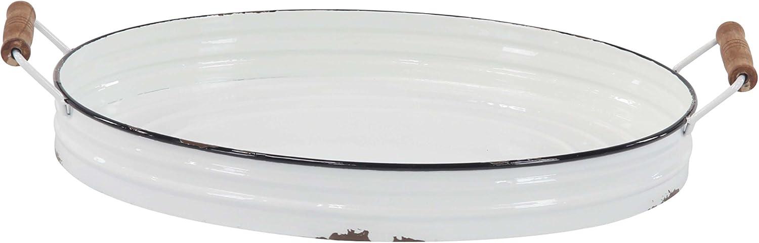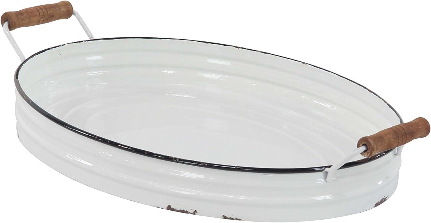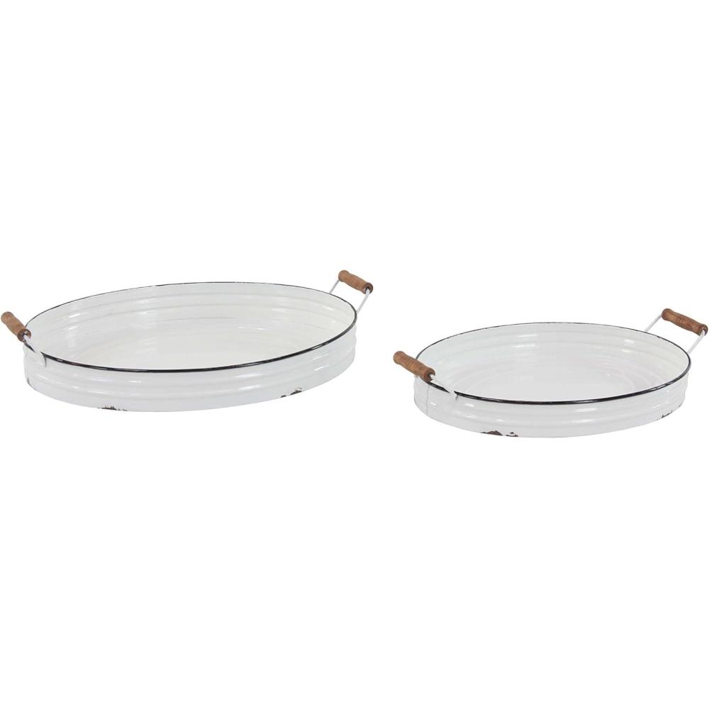 WHITE AND BROWN POLISHED FINISH These oval-shaped farmhouse metal trays feature a solid and distressed white iron finish with black riming's