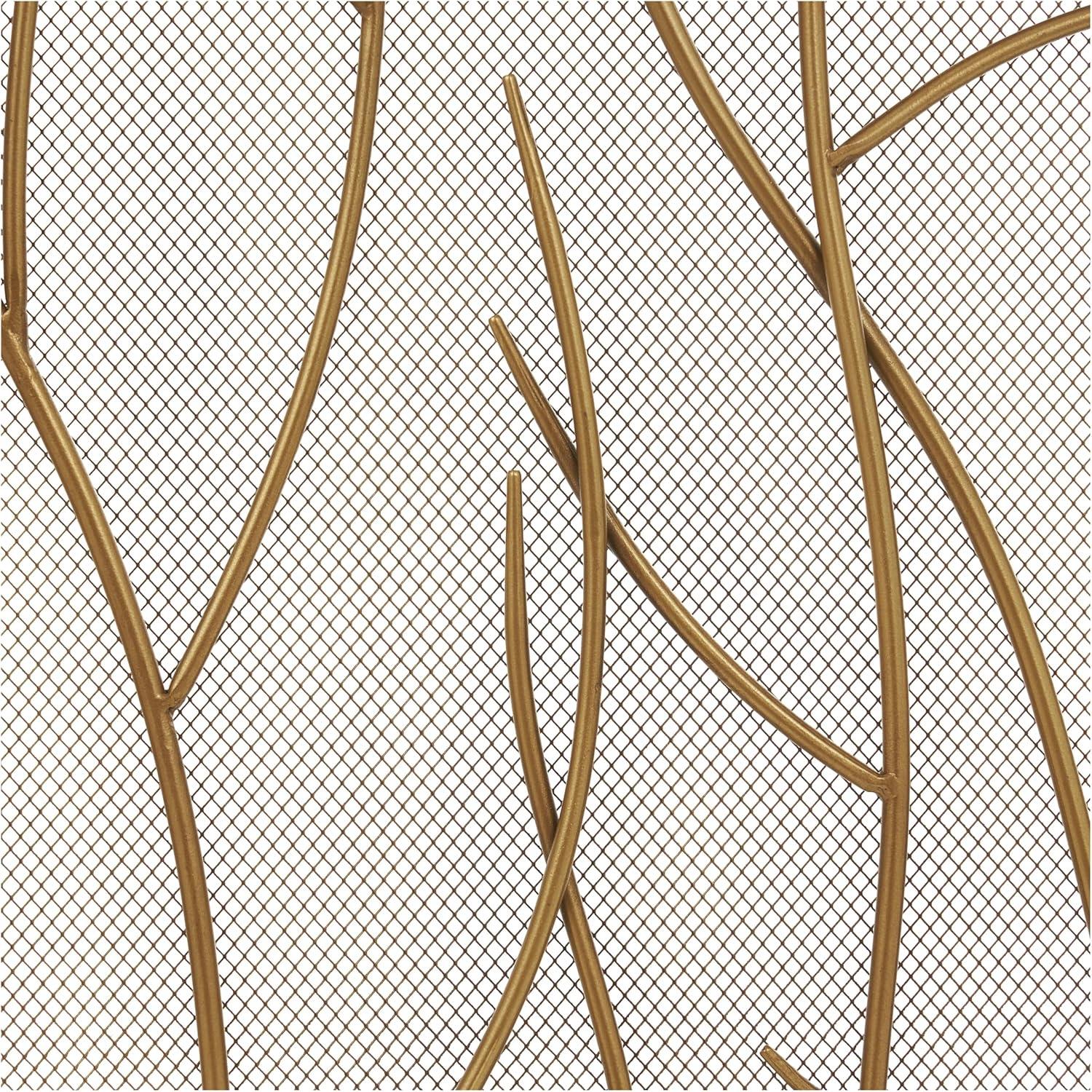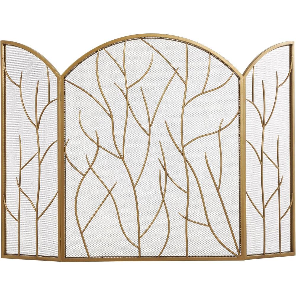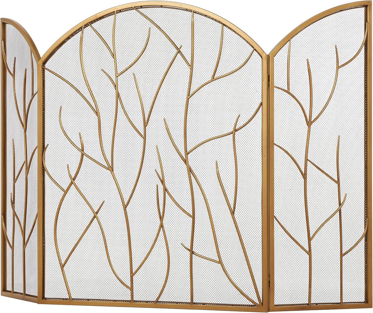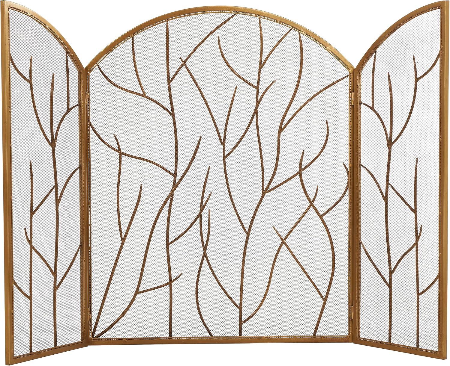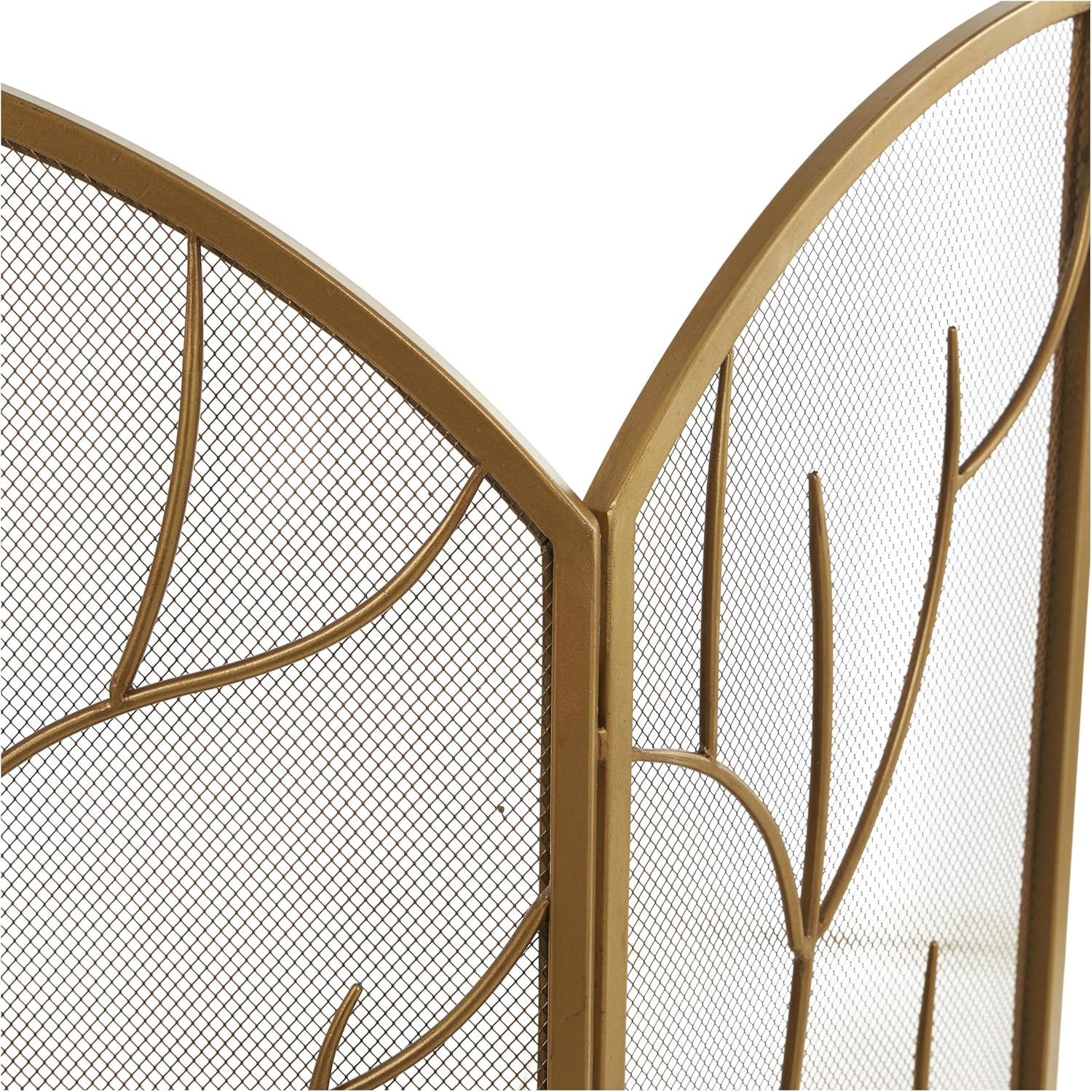 Foldable 3-panel fireplace screen features welded metal bars creating a curved branch pattern on top of a mesh background, with a hinge mechanism between frames attaching the panels together. Modern fire screen showcases 3 arched metal panels with a continuous overlapping branch design, for added dimension in the home. Wipe clean with a dry cloth. Add style and charm with this protective mesh screen covering your fireplace or empty wall to eliminate negative space, or try placing it in front of a candle cluster to recreate a warm and homey feel. This item ships in 1 carton. Please note that this item is for decorative use only. Suitable for indoor use only. This item ships fully assembled in one piece. Item features 3 panel screens. This is a single gold colored fire spark guard. Modern style.