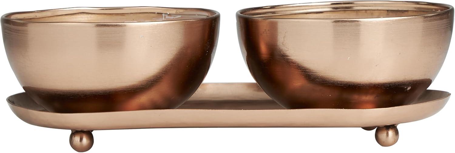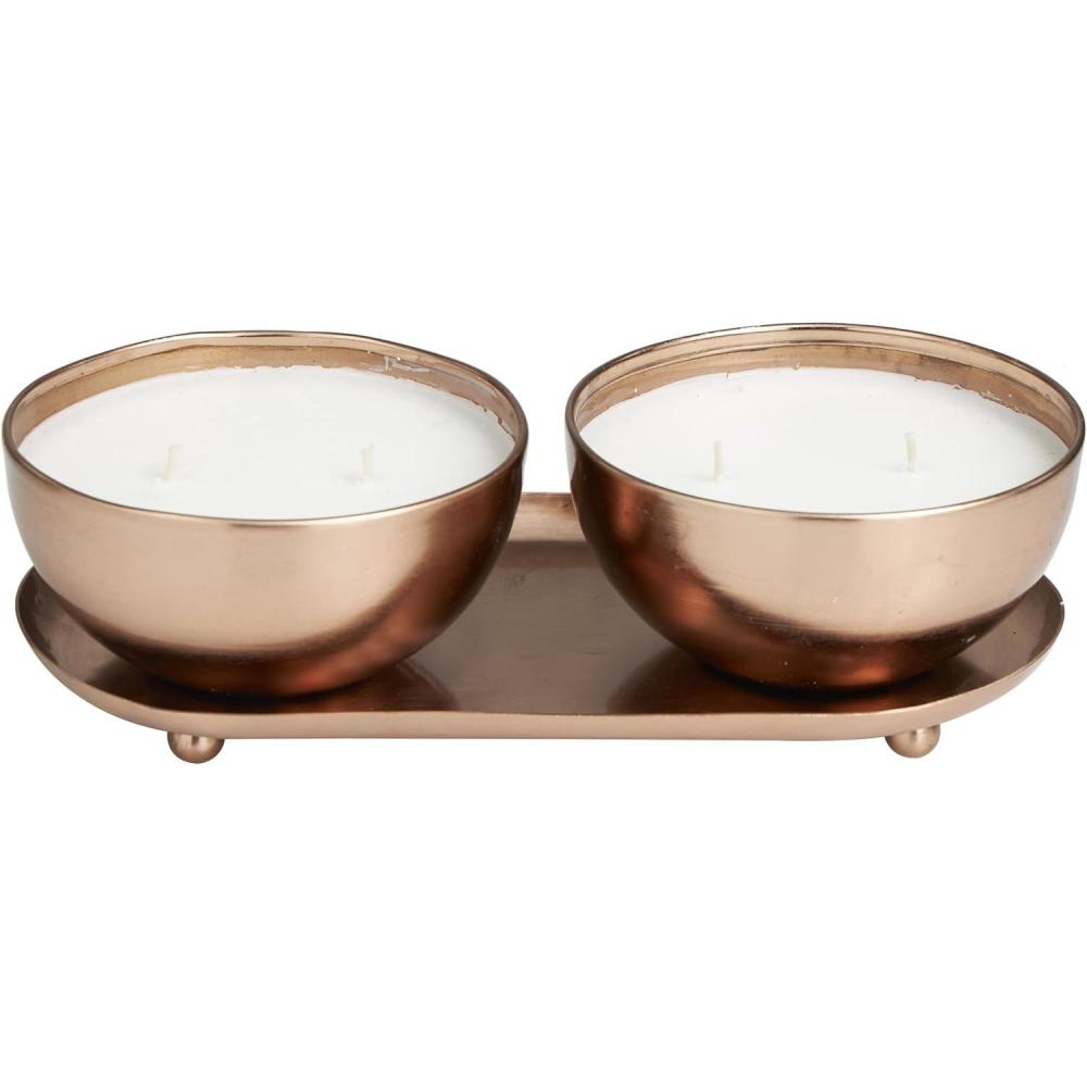 WHITE AND COPPER POLISHED FINISH Minimalistic polished copper candle bowls house one white wax 2-wick candle each, with a sleek copper tray to complete the look
