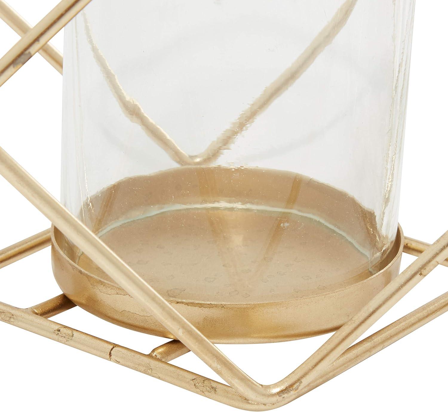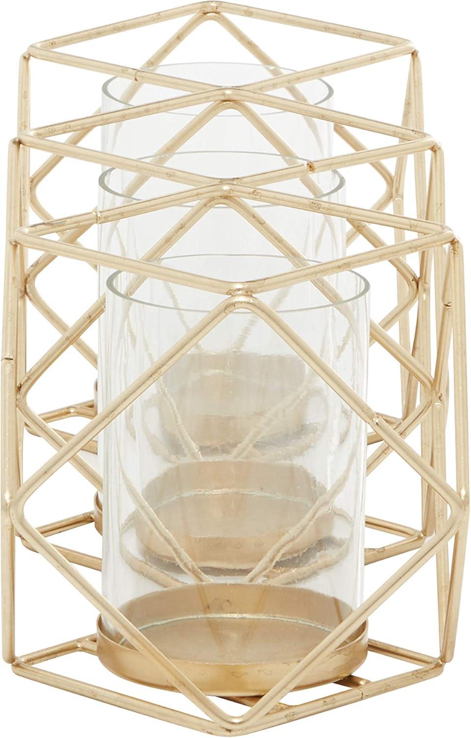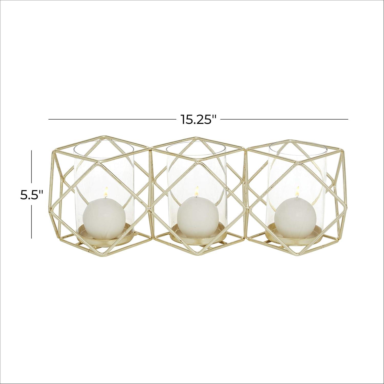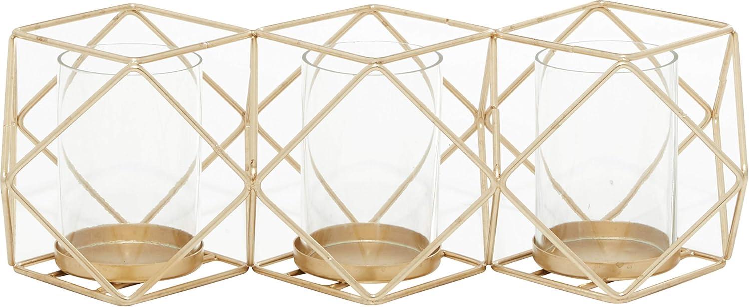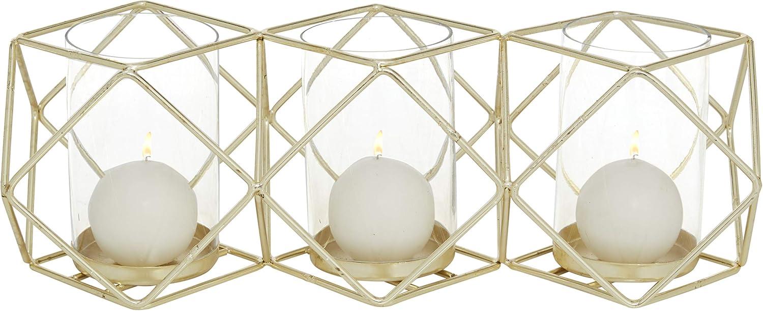 Make an impressive display in your home with this gold candle holder centerpiece. This accent piece is not only useful for covering open candle flames but is also great in creating an elegant appearance to your contemporary or glam-themed interior. This gold metal and glass candle holder paired with votive or pillar candles is the perfect combination of a stunning candle arrangement. Unique and modern, it comes with three cylindrical hurricane glasses and a frame with open geometric triangle design. Flaunting this accent piece inside your home will surely grab the attention of your guests. This item comes shipped in 1 carton. Suitable for indoor use only. Made in India. Modern Design. This metal and glass candle holder can accommodate 3 pillar candles.