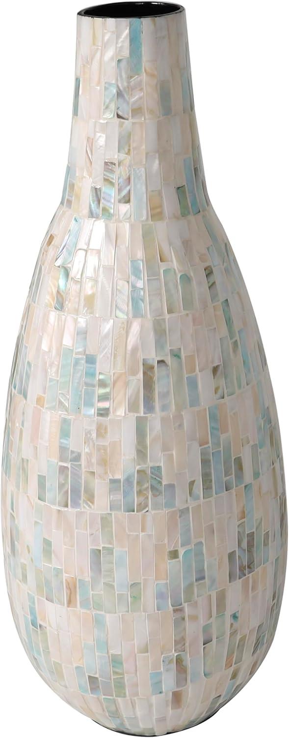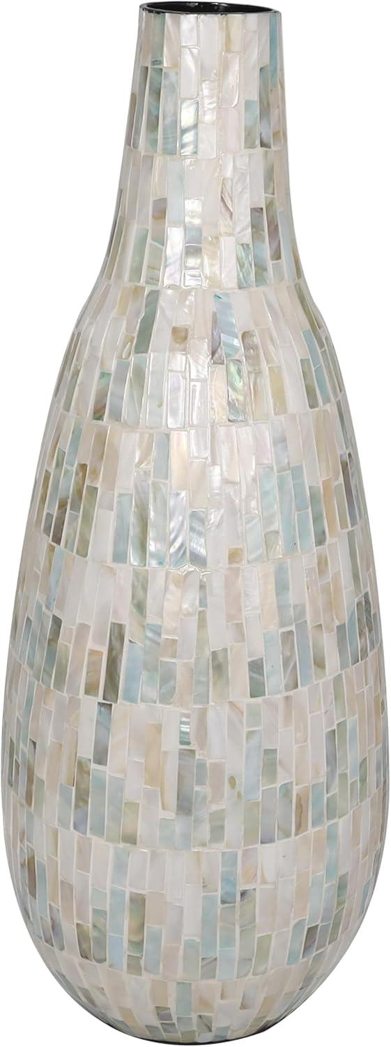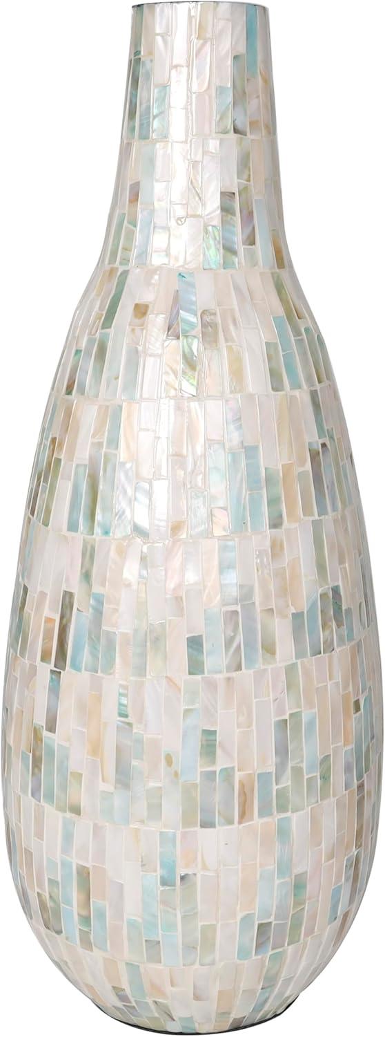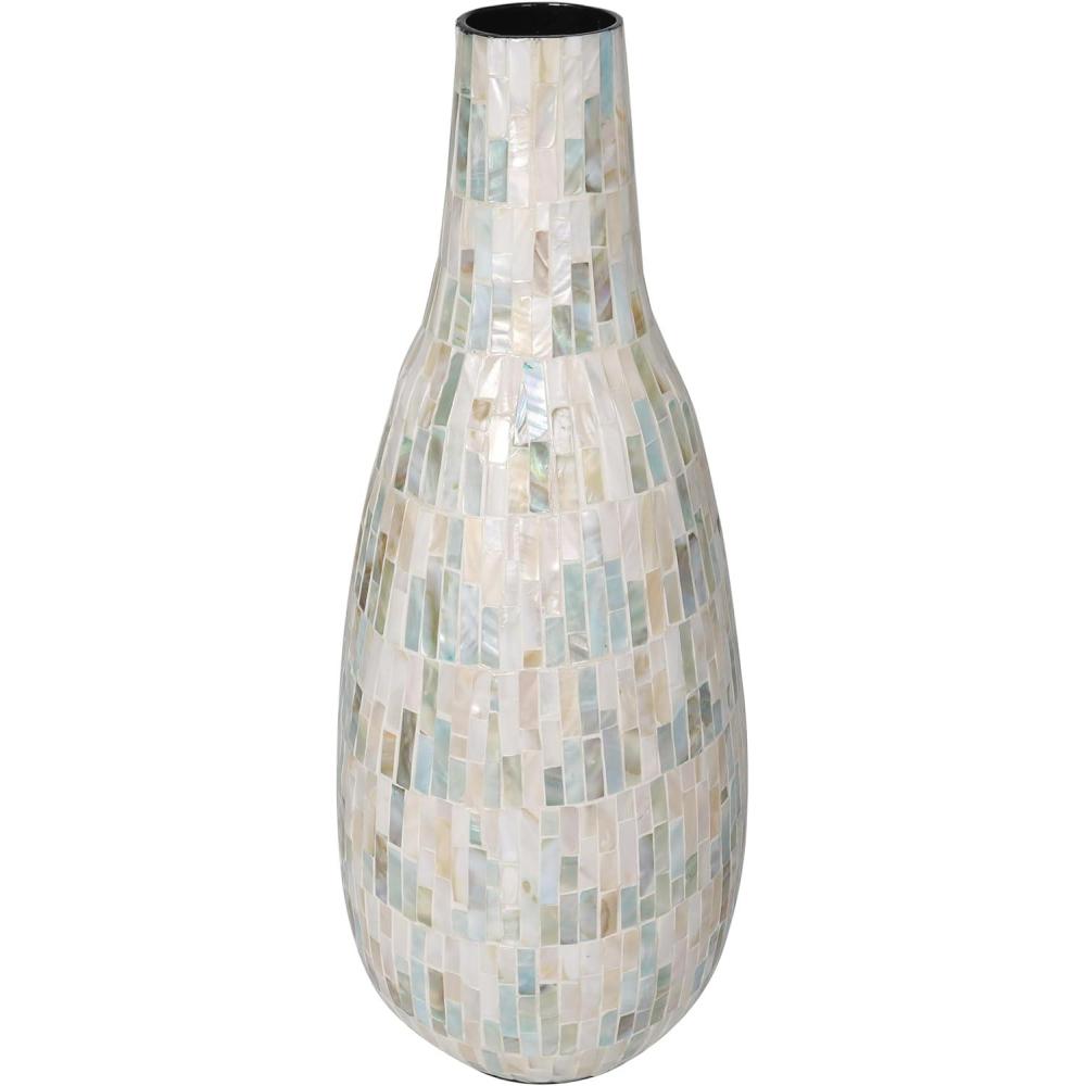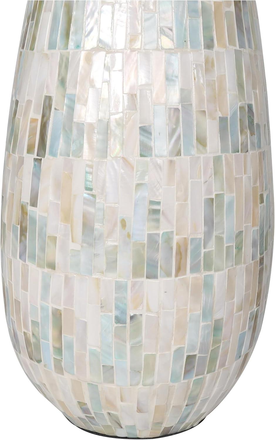 This captivating modern vase has been expertly constructed with attention to detail from mother of pearl shells hand placed in a stunning mosaic pattern, making it an exquisite contemporary vase for home decor. With a unique look that stands out, this rounded polished white vase for faux flowers features a wide mouth opening and rectangular shell pieces in various sizes. Wipe clean with a dry cloth. Show off this one-of-a-kind white centerpiece vase as a decorative accent piece on a coffee table or console, or display your favorite flowers and greenery for a more captivating look. Designed with felt or rubber stoppers at the base that prevent scratching furniture and table tops, as well as sliding around. This item ships in 1 carton. Mother of pearl vase makes a great gift for any occasion. Due to the handmade nature of this item, no two will be alike, there will be slight differences in shape, size, and color. Suitable for indoor use only. This item ships fully assembled in one piece. Made in Vietnam. This is a single white colored vase. Contemporary style. Vase has a 2.80 in mouth opening.