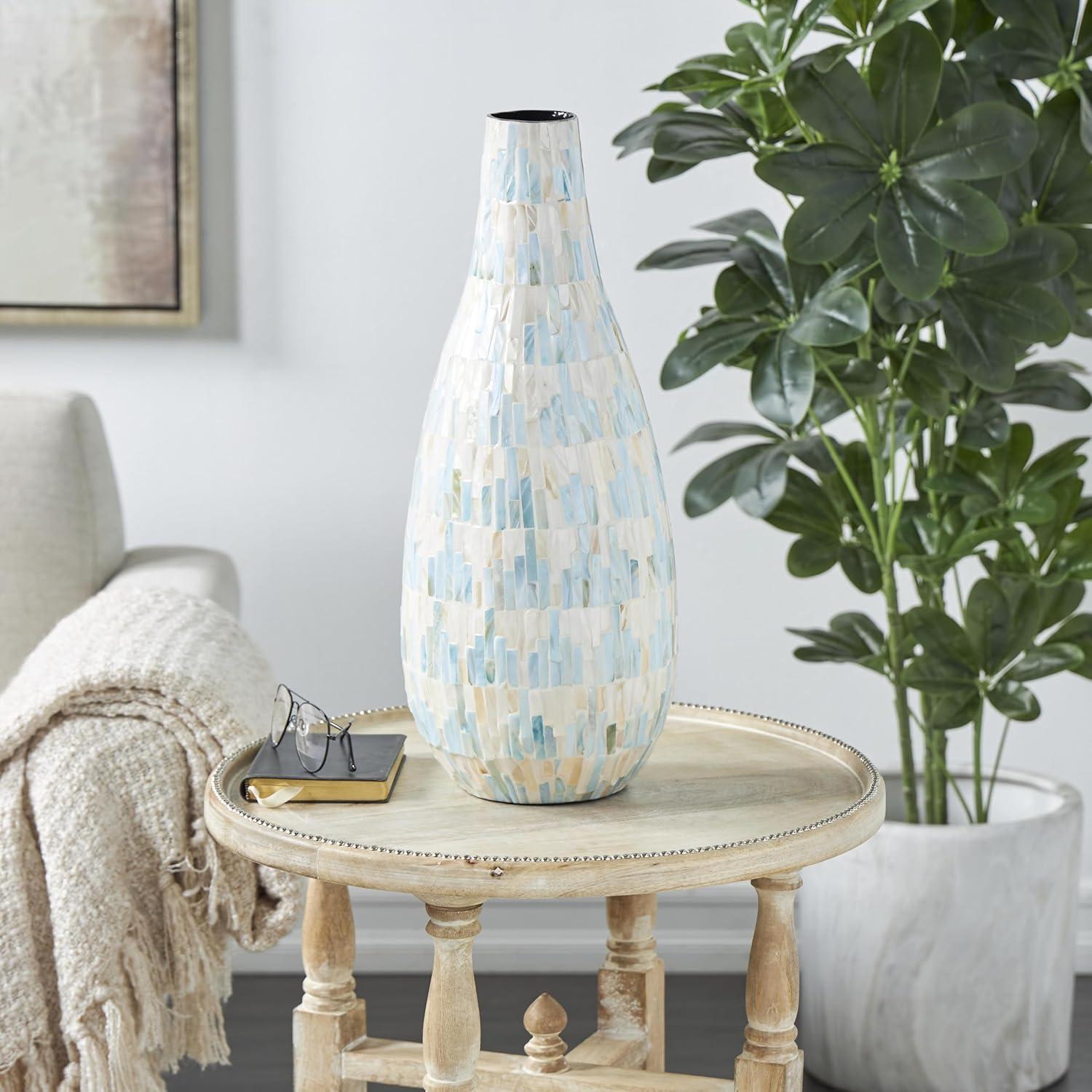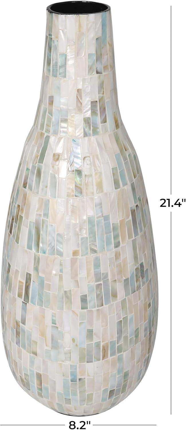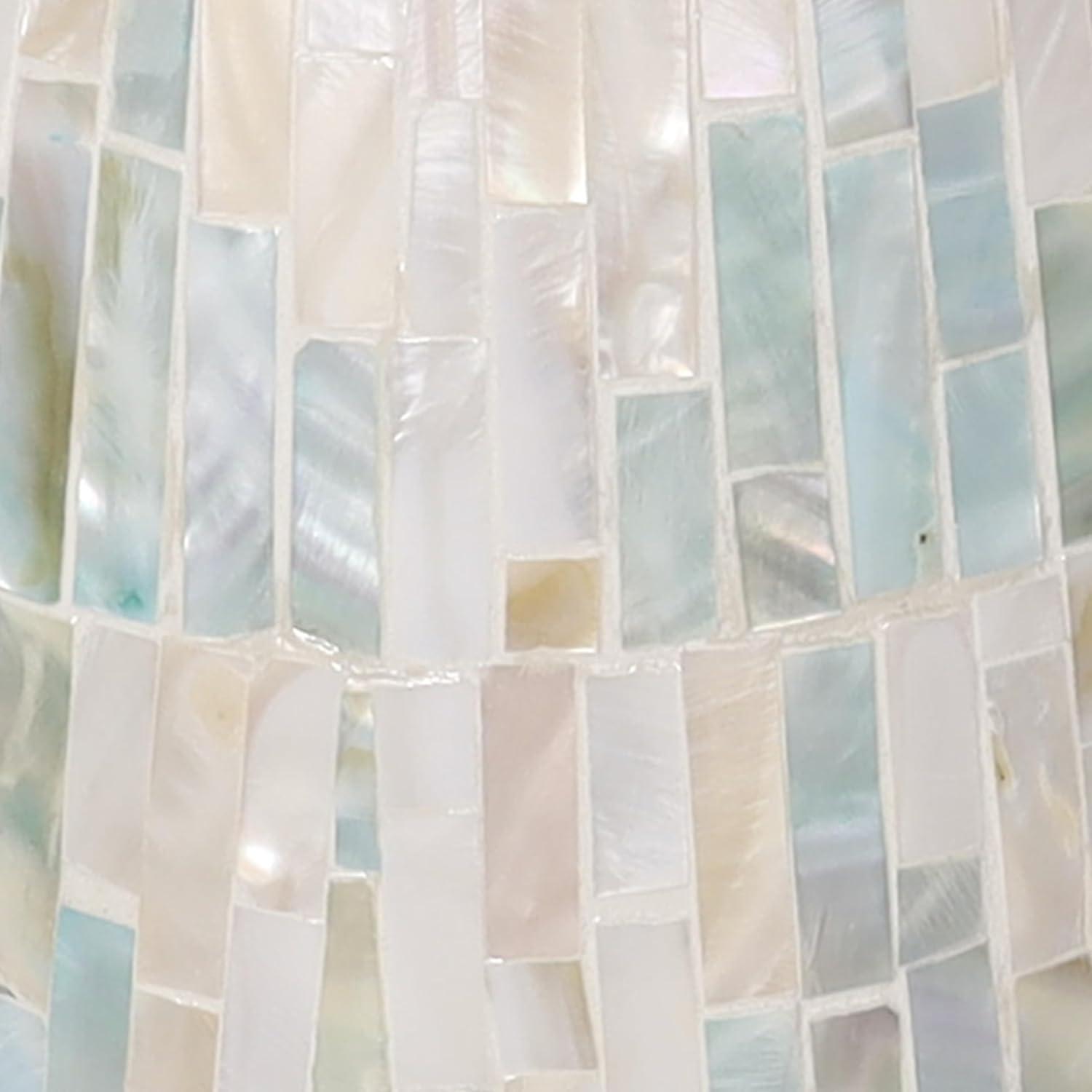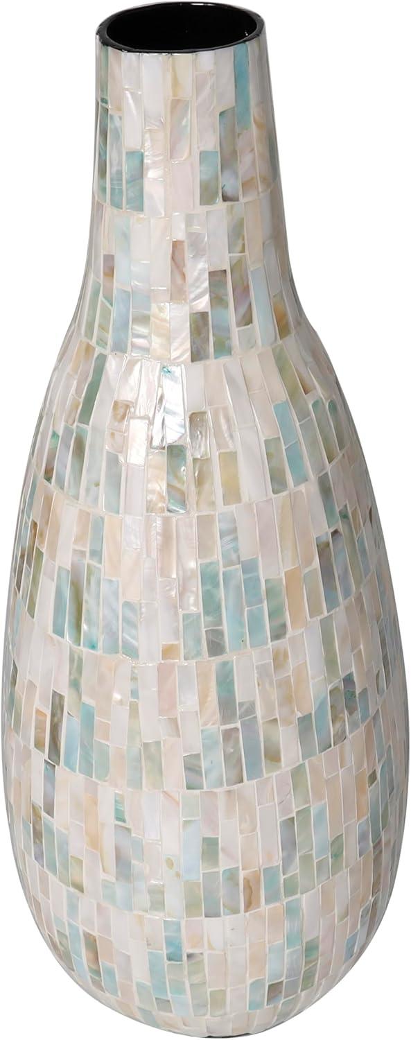 This captivating modern vase has been expertly constructed with attention to detail from mother of pearl shells hand placed in a stunning mosaic pattern, making it an exquisite contemporary vase for home decor. With a unique look that stands out, this rounded polished white vase for faux flowers features a wide mouth opening and rectangular shell pieces in various sizes. Wipe clean with a dry cloth. Show off this one-of-a-kind white centerpiece vase as a decorative accent piece on a coffee table or console, or display your favorite flowers and greenery for a more captivating look. Designed with felt or rubber stoppers at the base that prevent scratching furniture and table tops, as well as sliding around. This item ships in 1 carton. Mother of pearl vase makes a great gift for any occasion. Due to the handmade nature of this item, no two will be alike, there will be slight differences in shape, size, and color. Suitable for indoor use only. This item ships fully assembled in one piece. Made in Vietnam. This is a single white colored vase. Contemporary style. Vase has a 2.80 in mouth opening.