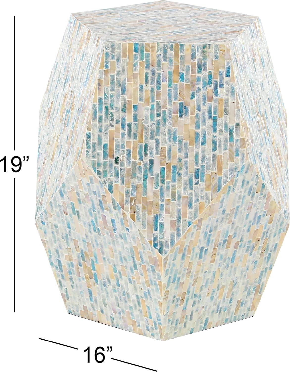 HEXAGON SMALL TABLE: The mother of pearl accent table is adorned with mussel shell inlays on the exterior, featuring a geometric form with a faceted structure that stands out as a modern piece