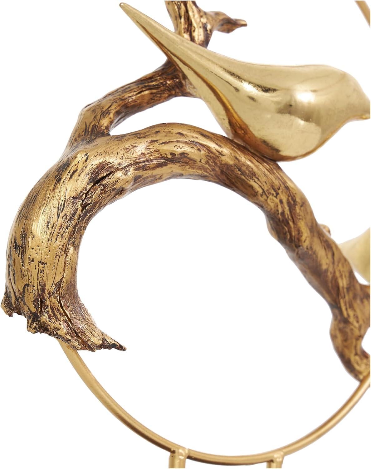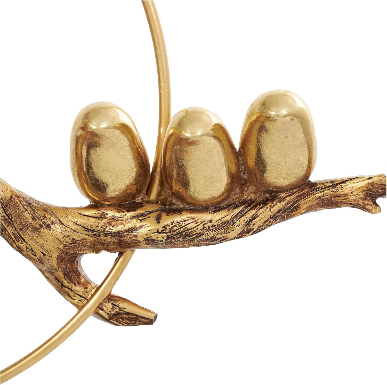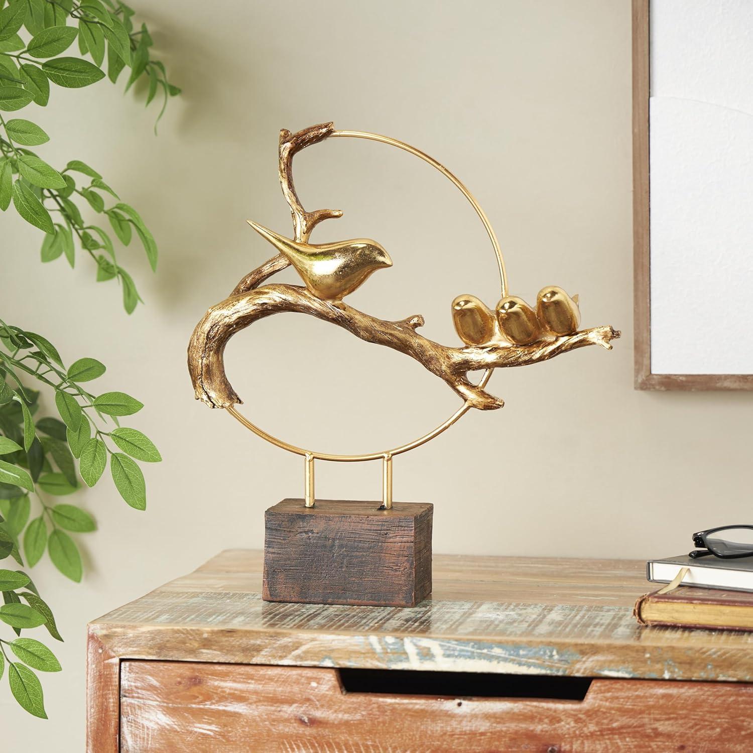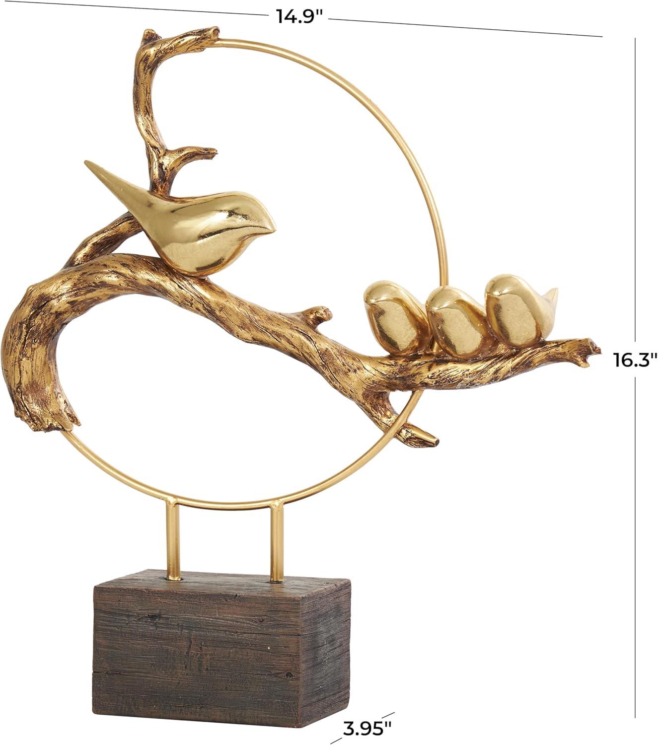 Traditional accent statue is made by molding and shaping resin into bird family and attaching it to a stone base that is crafted to resemble wood. Polished gold home decor figurine's depiction of the bird family on a branch forms a dynamic pattern, capturing the essence of familial bonds and nature's beauty. Wipe clean with a dry cloth. Place this bird home decor statue in your living room or office as an elegant centerpiece that evokes nature’s beauty. Designed with felt or rubber stoppers at the base that prevent scratching furniture and table tops, as well as sliding around. This item ships in 1 carton. Please note that this item is for decorative use only. Polystone sculpture makes a great gift for any occasion. Suitable for indoor use only. This item ships fully assembled in one piece. This is a single gold colored statue. Traditional style.