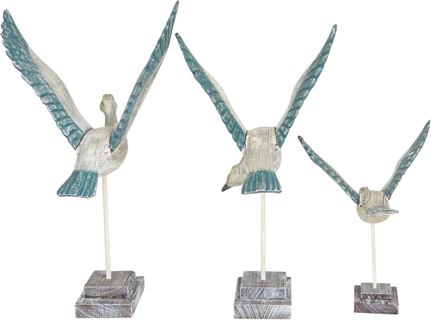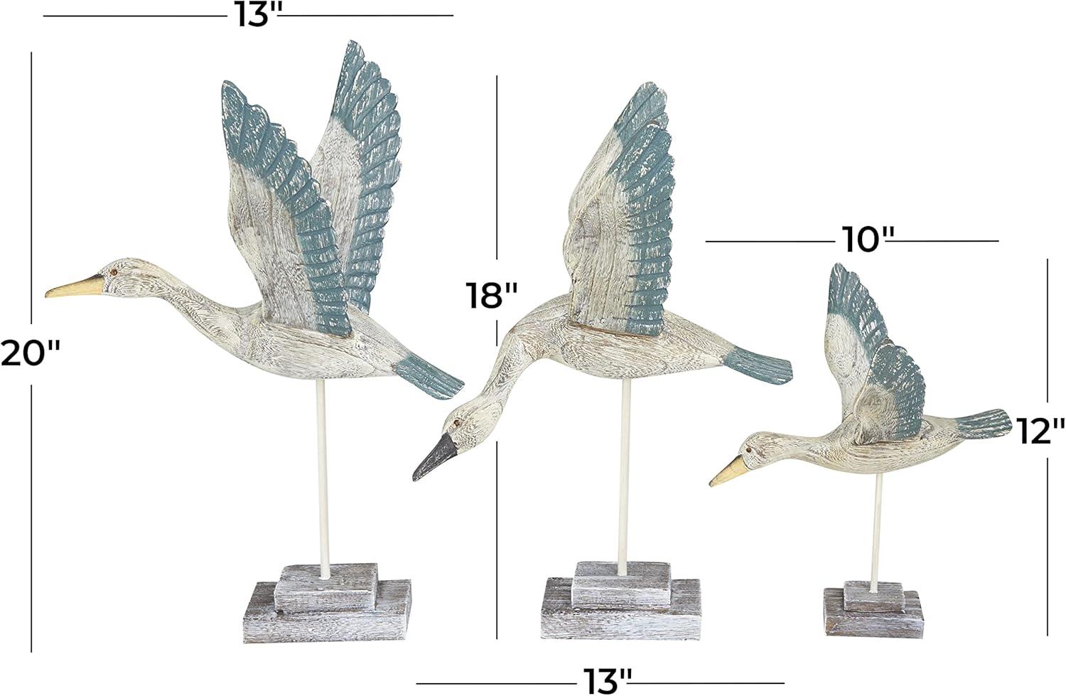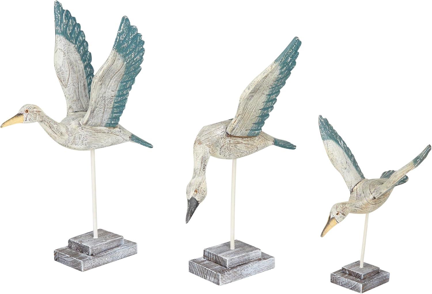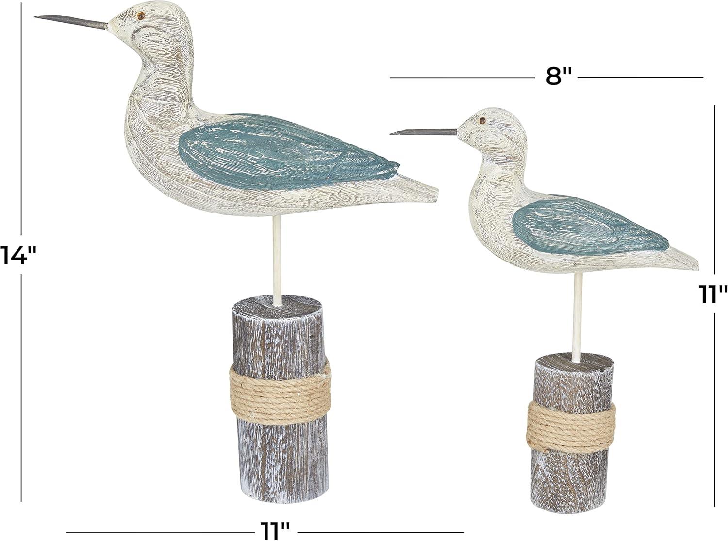WHITE AND BLUE HOME DECOR FIGURINES: Set of bird sculptures feature a white matte finish with blue coral patterns and brown bases, embodying a coastal charm and relaxed aesthetic