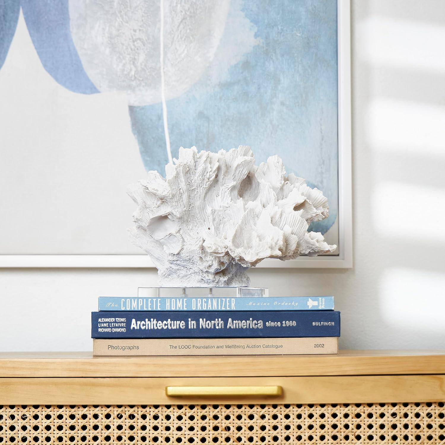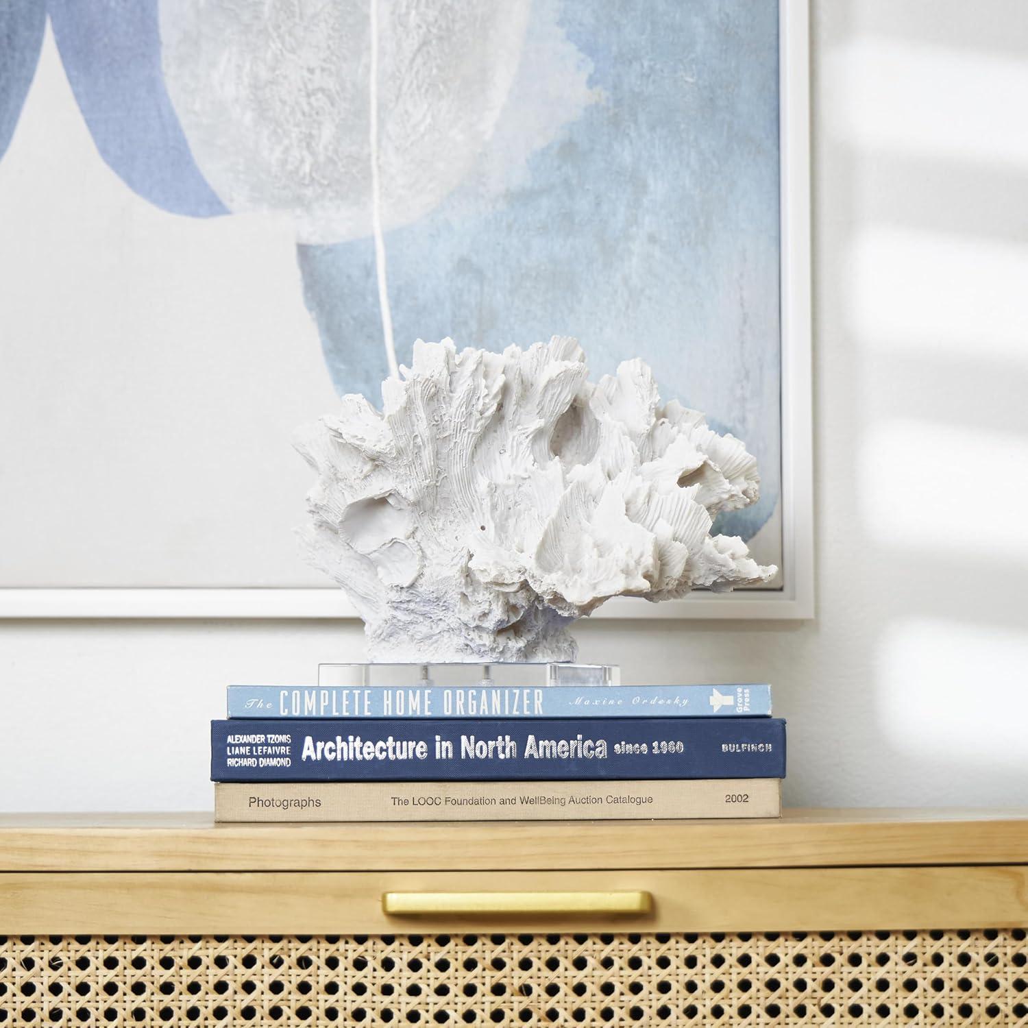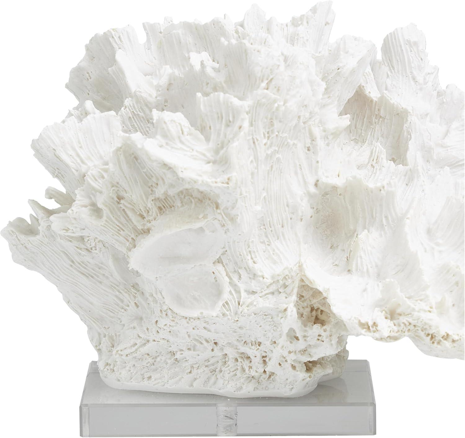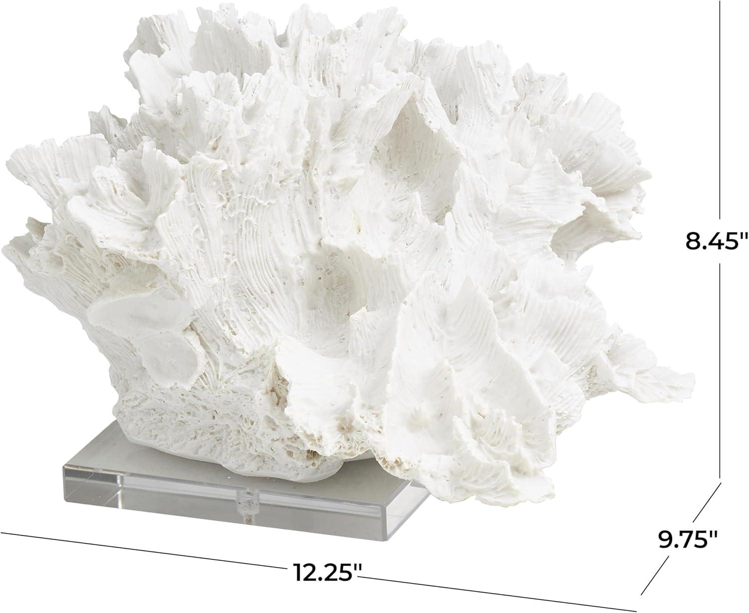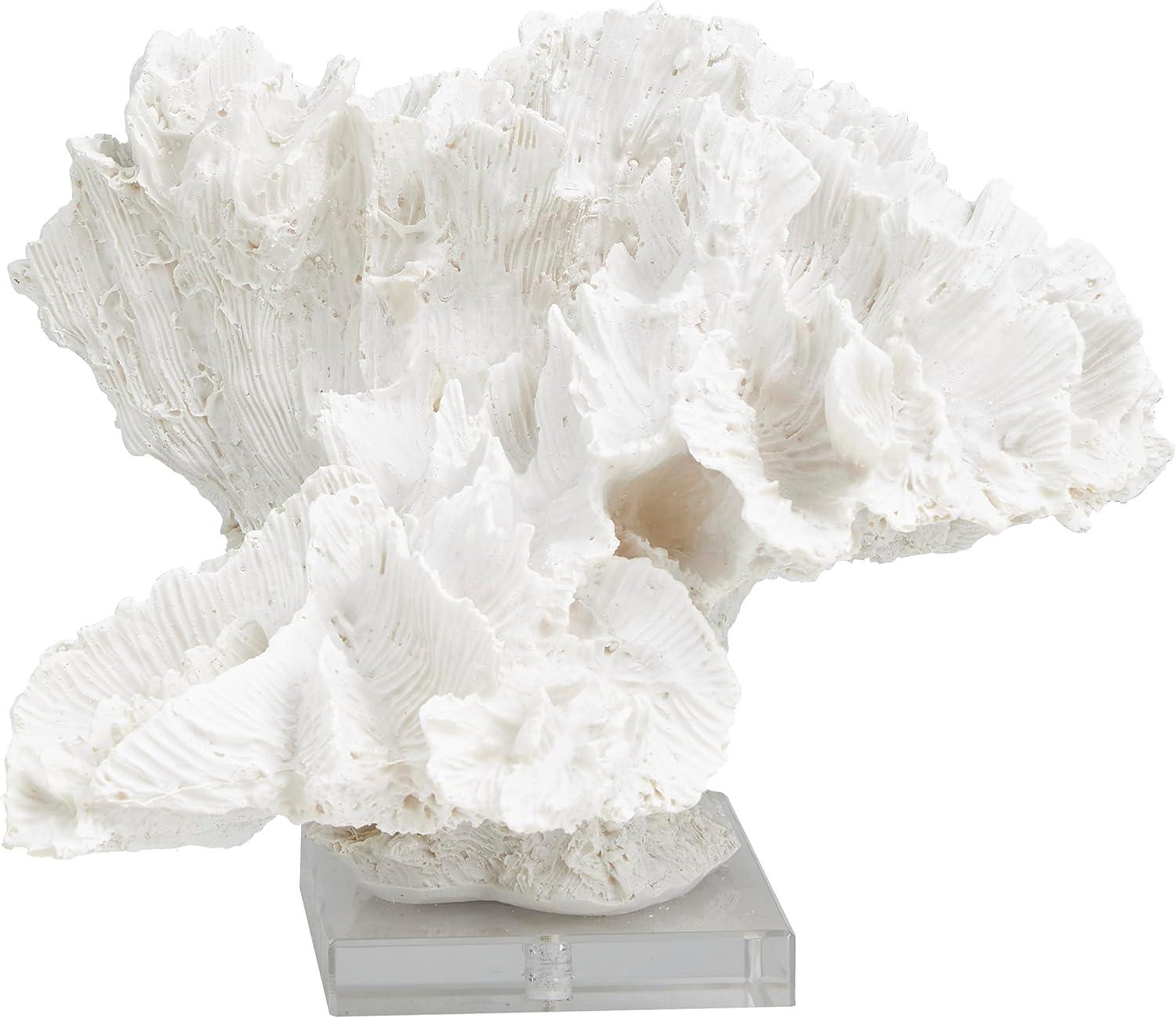 This coastal accent statue is expertly designed with molded polystone, securely attached to a clear base for support. Textured white home decor figurine showcases a realistically textured coral shape and a rectangular acrylic base for added elegance. Wipe clean with a dry cloth. Enhance your space by placing this coral home decor statue on a coffee table, bookshelf, or console table. Designed with felt or rubber stoppers at the base that prevent scratching furniture and table tops, as well as sliding around. This item ships in 1 carton. Please note that this item is for decorative use only. Polystone sculpture makes a great gift for any occasion. Suitable for indoor use only. This item ships fully assembled in one piece. This is a single white colored statue. Coastal style.