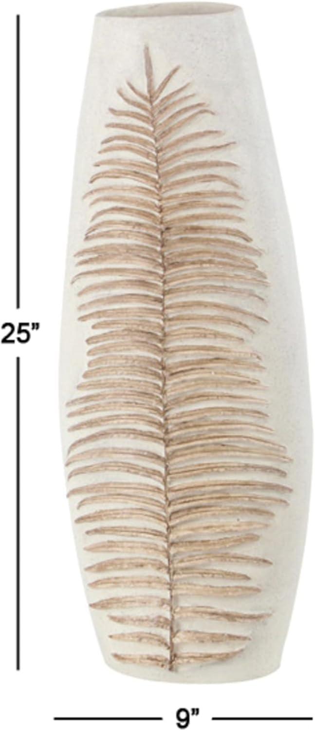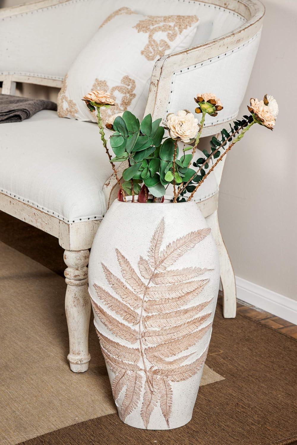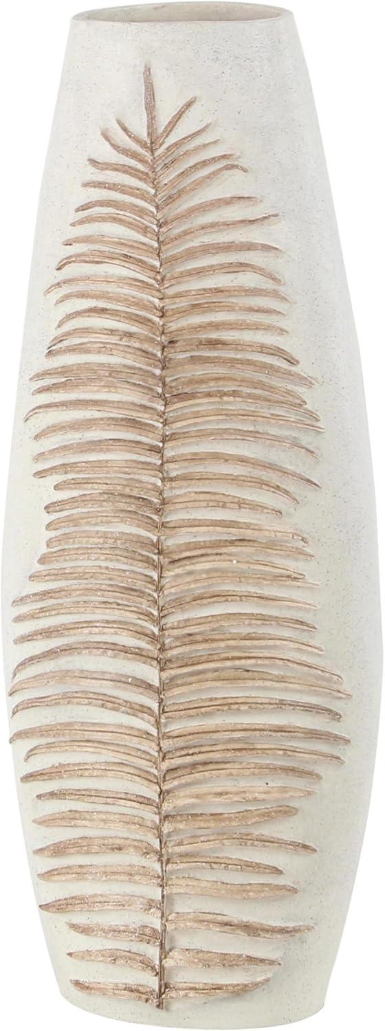 WHITE AND BROWN VASE FOR FLOWERS: Tall floor vase with a white finish and large beige faux leaf fossil overlay