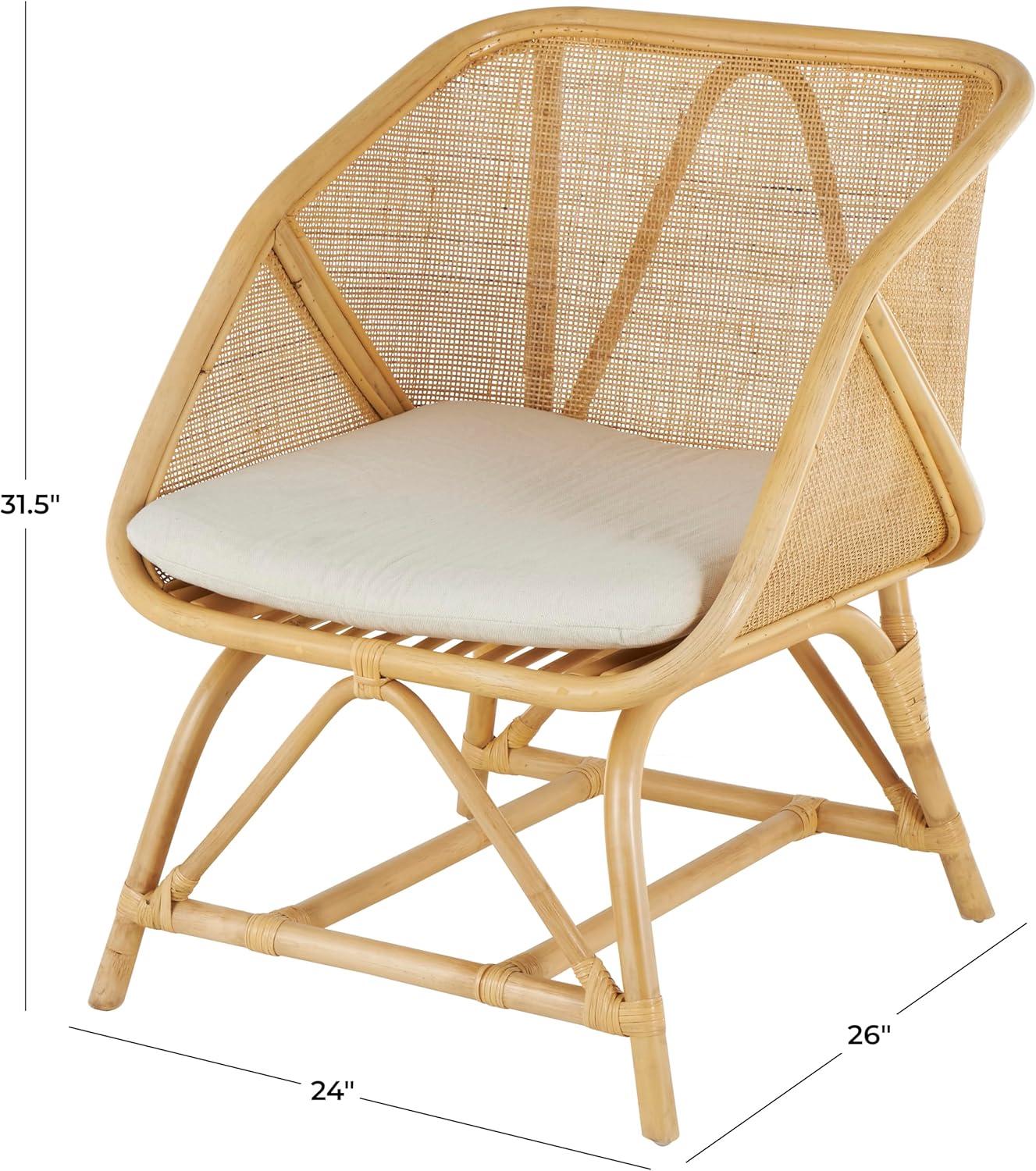 This traditional small space accent chair was constructed with a bamboo base woven with rattan while the cushion is made from high-quality fabric that ensures long-lasting use. The textured light brown living room chair has a distinct square shape with triangle silhouettes and a geometric rattan pattern, enhancing its overall charm. Wipe clean with a dry cloth. The light brown side chair is versatile enough to be placed in your living room, bedroom, or study area for an extra touch of elegance. This item ships in 1 carton. Suitable for indoor use only. This item ships fully assembled in one piece. Maximum weight limit is 250 lbs. Made in Indonesia. Can accommodate 1 person. This is a single light brown colored side chair. Traditional style.