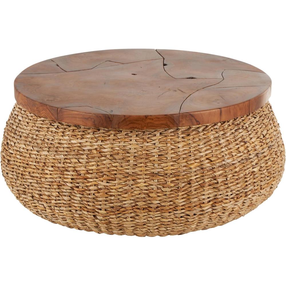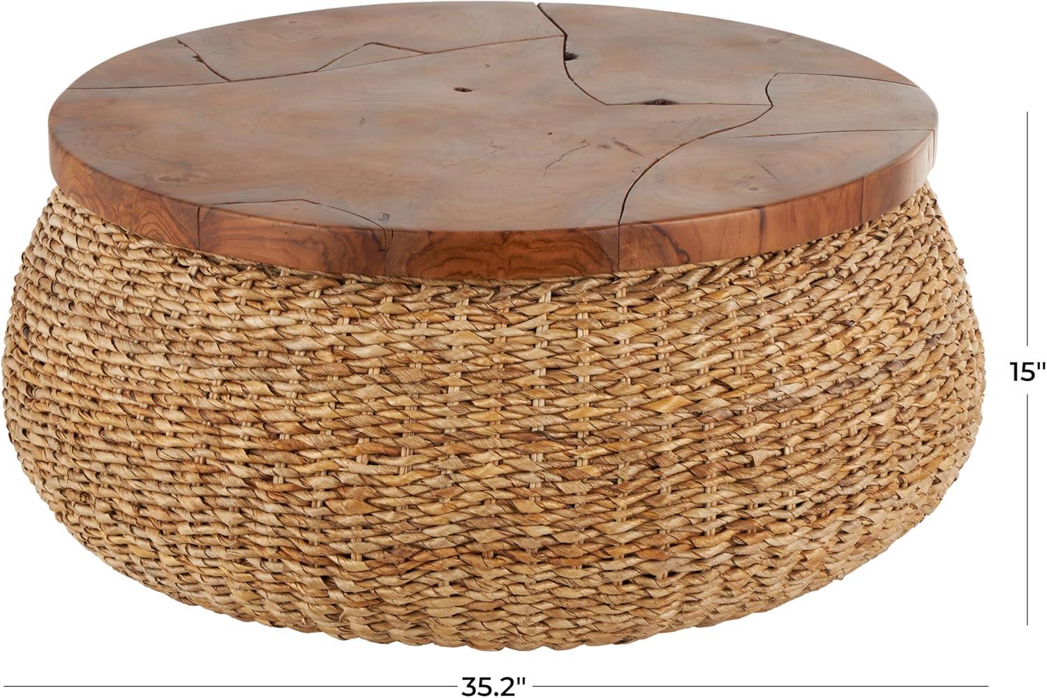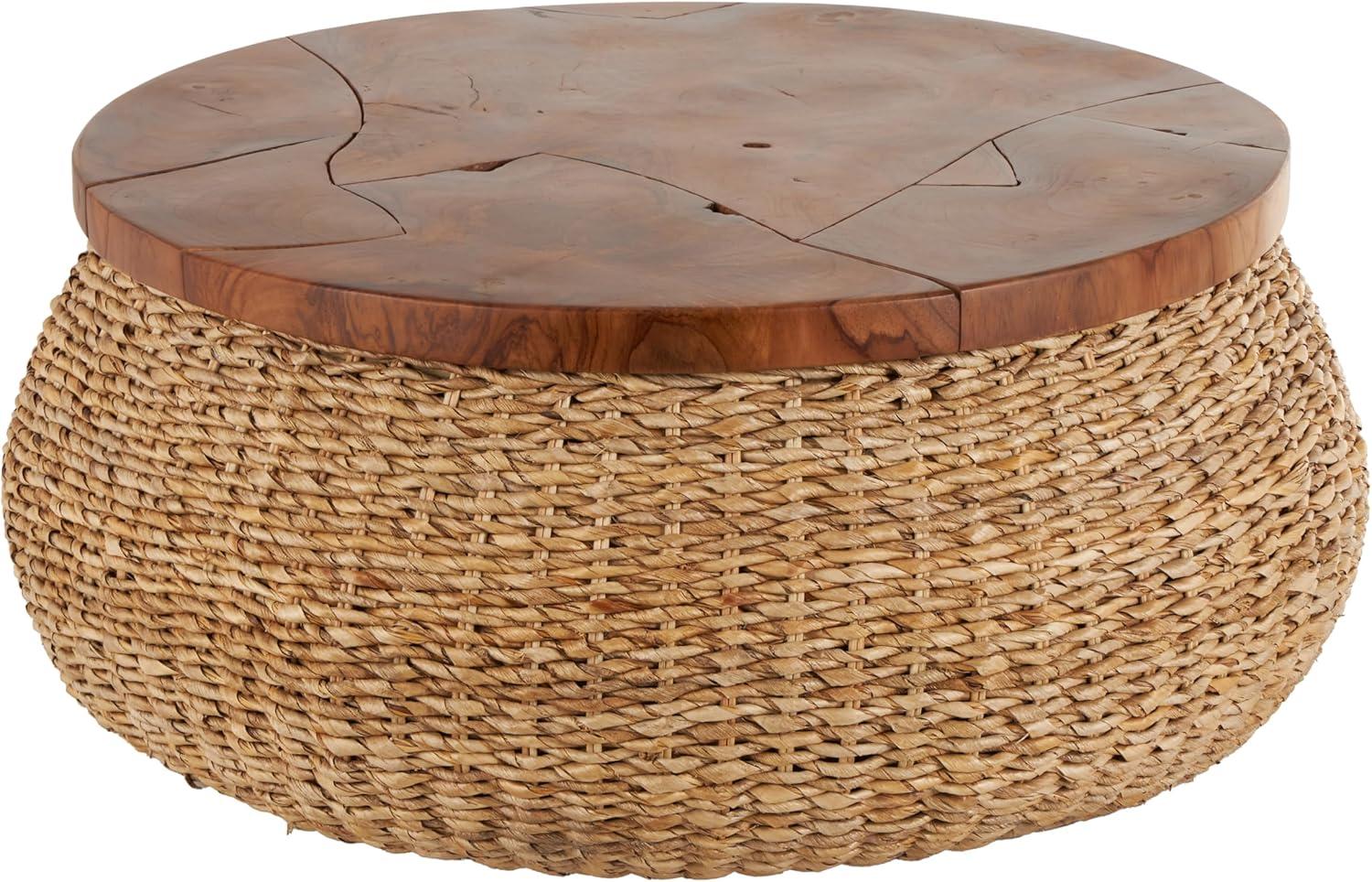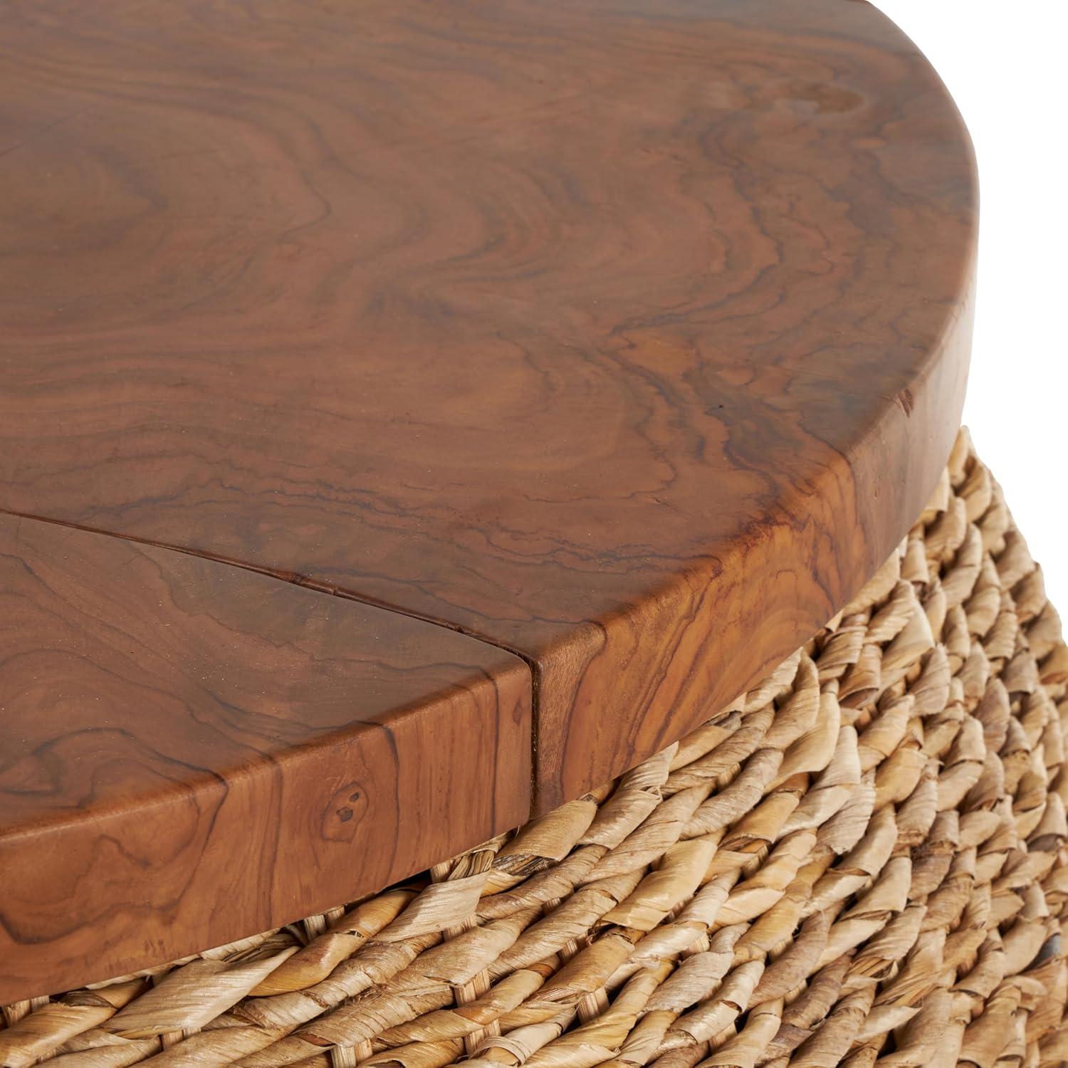 The traditional home table combines intricately woven rattan with a finely polished teak surface, showcasing expert craftsmanship. The textured brown center table for the living room has a classic round shape with a woven pattern, enhancing its versatility. Wipe clean with a dry cloth. This brown table is perfect for enhancing the ambiance of any living room or kitchen, where its warm tones and compact design blend seamlessly with the surrounding decor. This item ships in 1 carton. Suitable for indoor use only. This item ships fully assembled in one piece. Maximum weight limit is 100 lbs. Made in Indonesia. This is a single brown colored living room table. Traditional style.