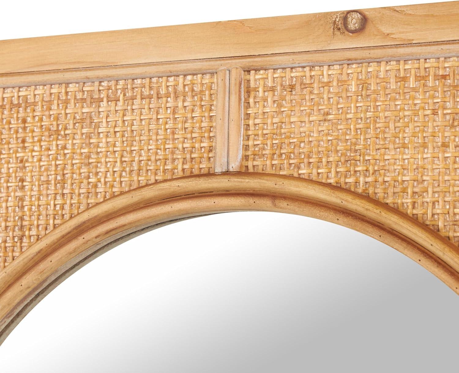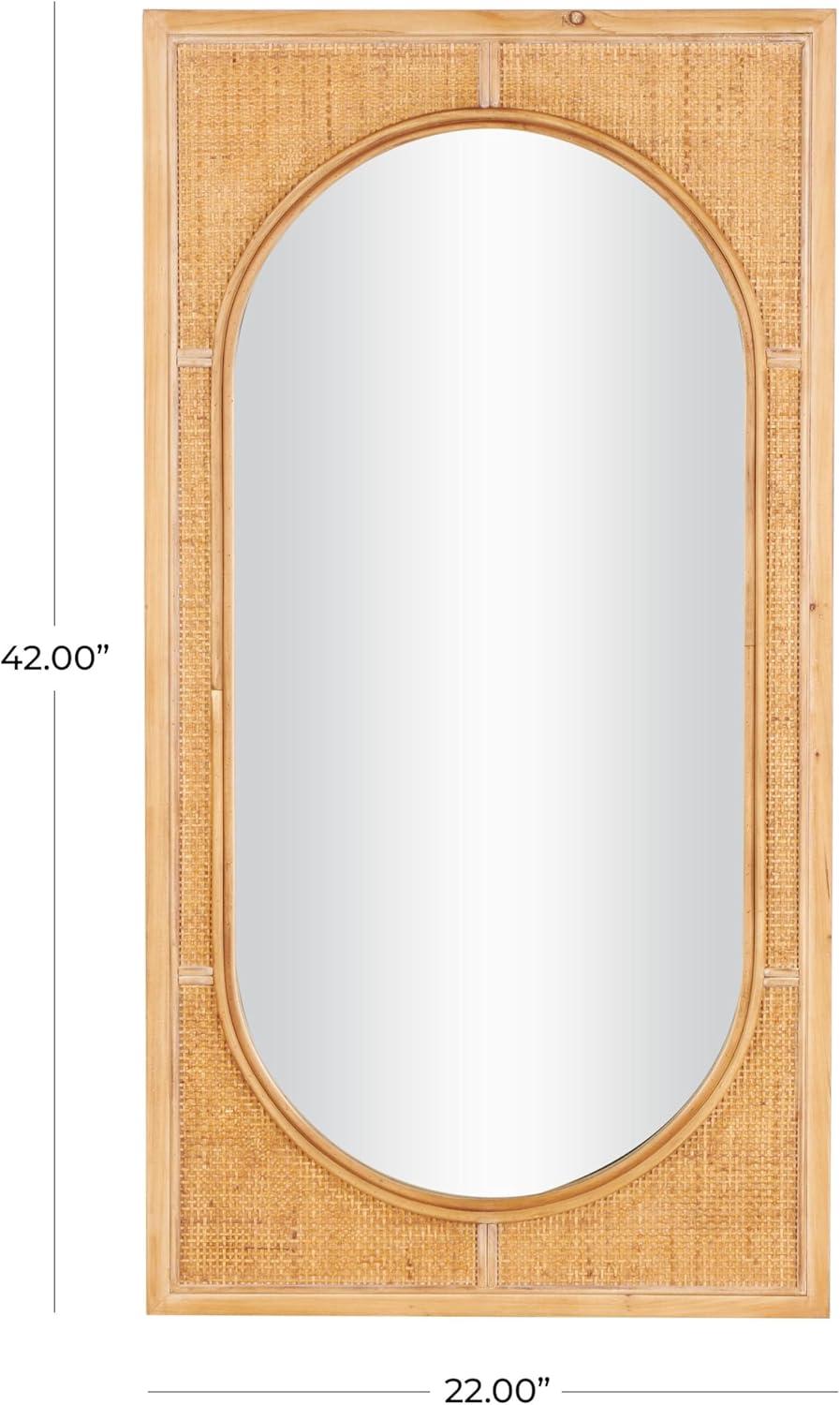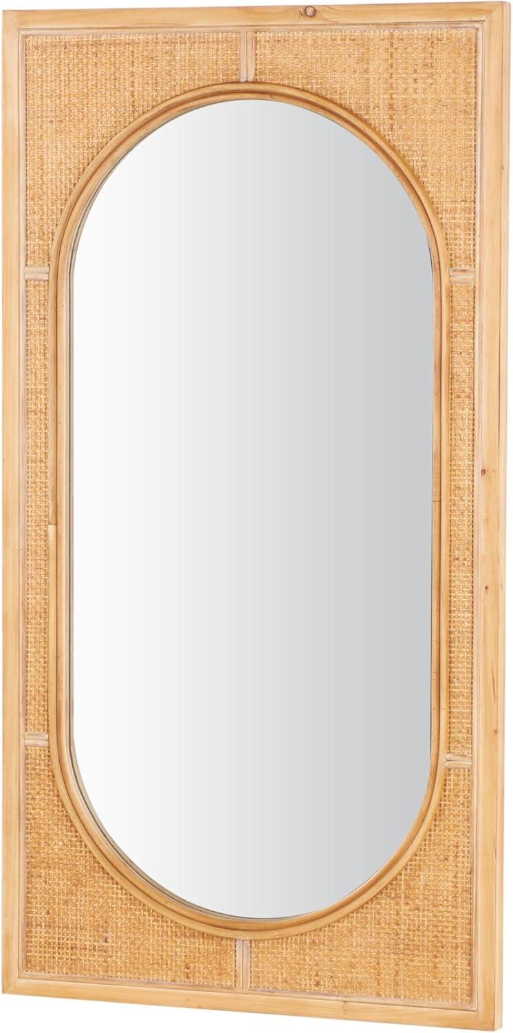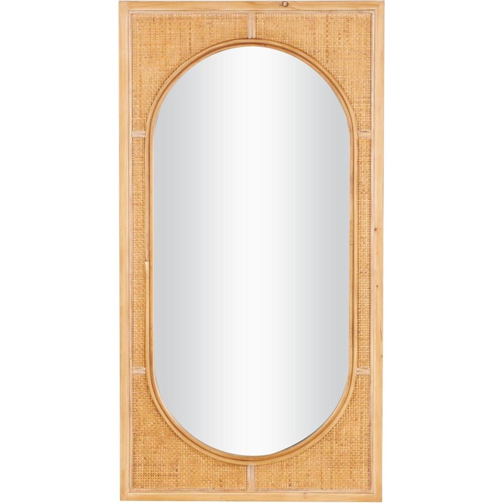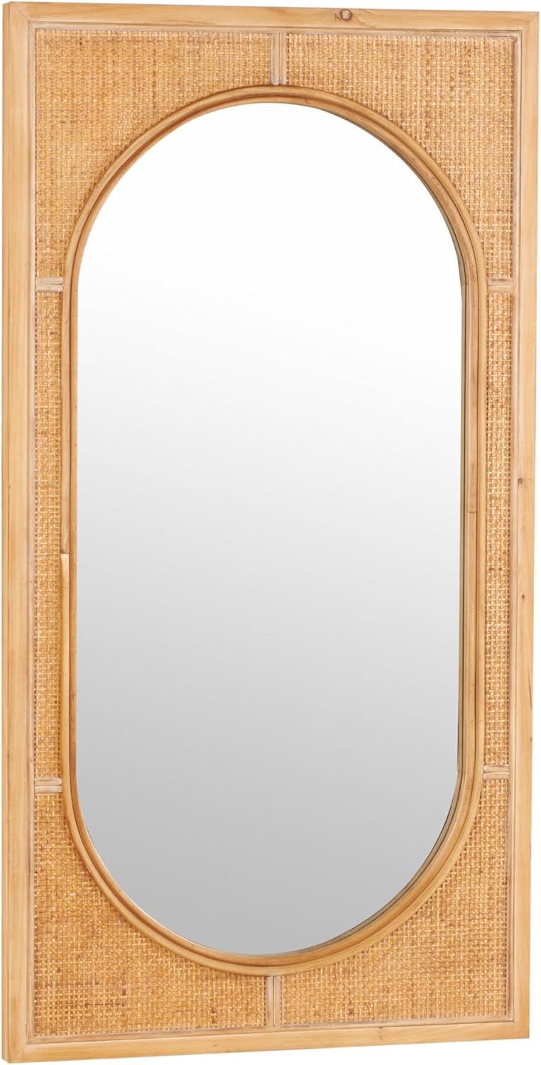 The construction of this wall mirror combines different textures and materials to create an appealing contrast between the warm rattan frame and the sleek glass center. Natural rectangular mirror encases the oval glass center, with a woven inspired pattern that adds texture and style. Wipe clean with a dry cloth. Oval wall mirror can be used as a functional mirror or a decorative wall accent in the bedroom or living room to open up the space and brighten the room. This item ships in 1 carton. Can be hung vertically using the d-rings; nails and screws not included. Suitable for indoor use only. This item ships fully assembled in one piece. This is a single brown colored entryway mirror. Bohemian style.