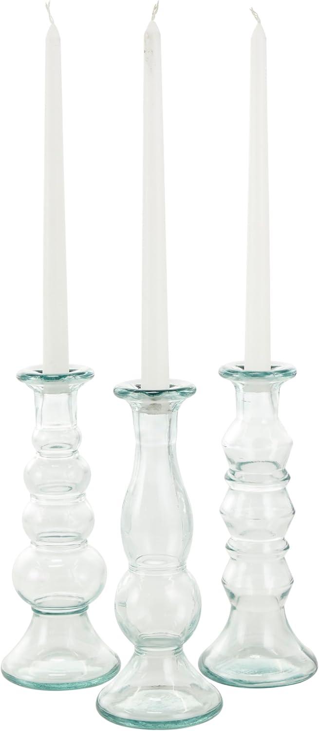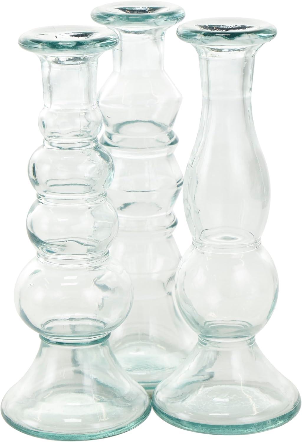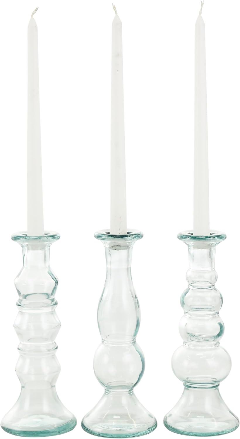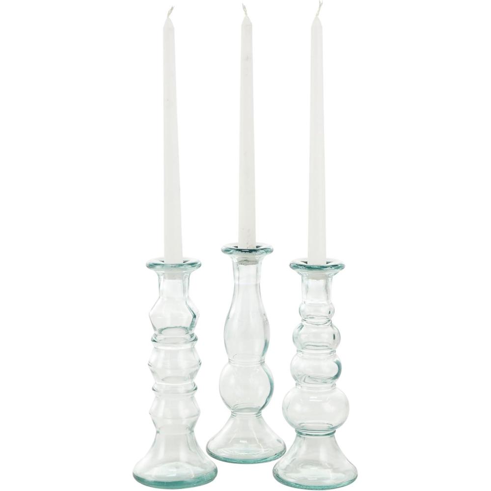 To use the item, simply place the candles in each holder and light them for a warm and inviting atmosphere. Designed with felt or rubber stoppers at the base that prevent scratching furniture and table tops, as well as sliding around. Can hold 3 taper candles, not included. This item ships in 1 carton. Recycled glass candle holder makes a great gift for any occasion. Suitable for indoor use only. This item ships fully assembled in one piece. Made in Spain. This clear colored candle stand comes as a set of 3. Contemporary style.