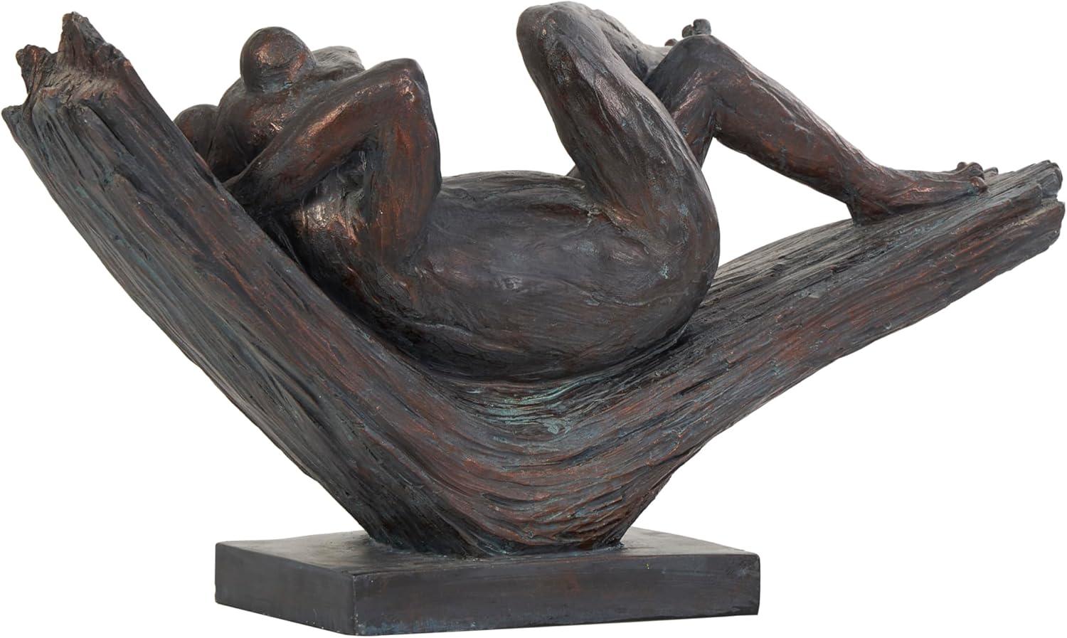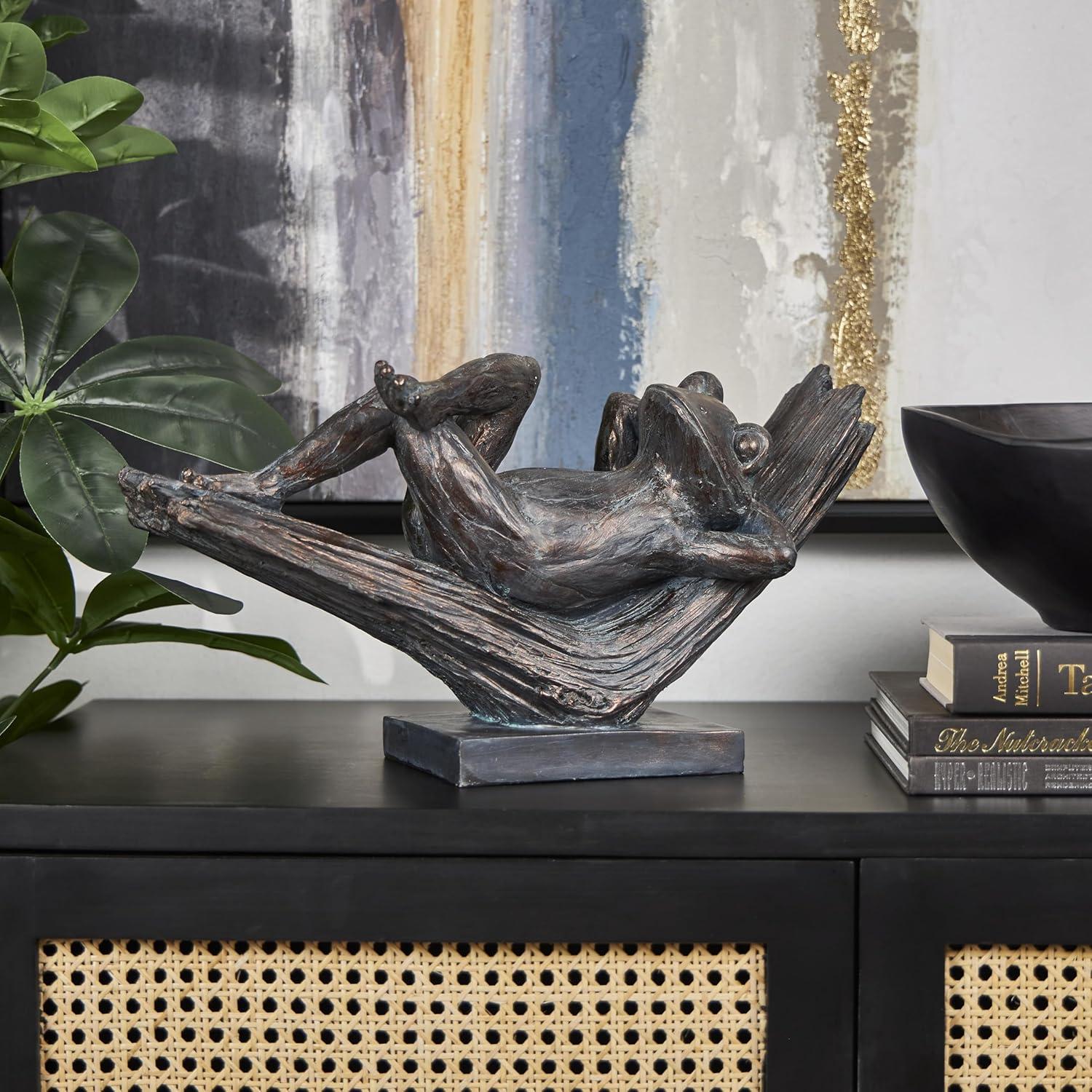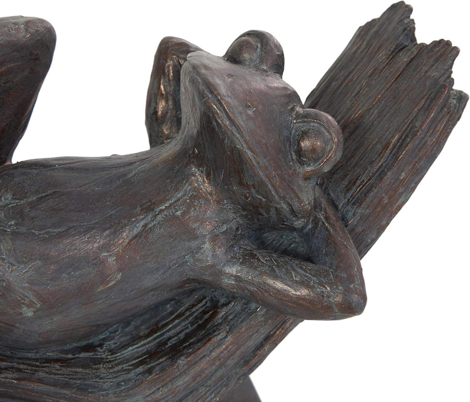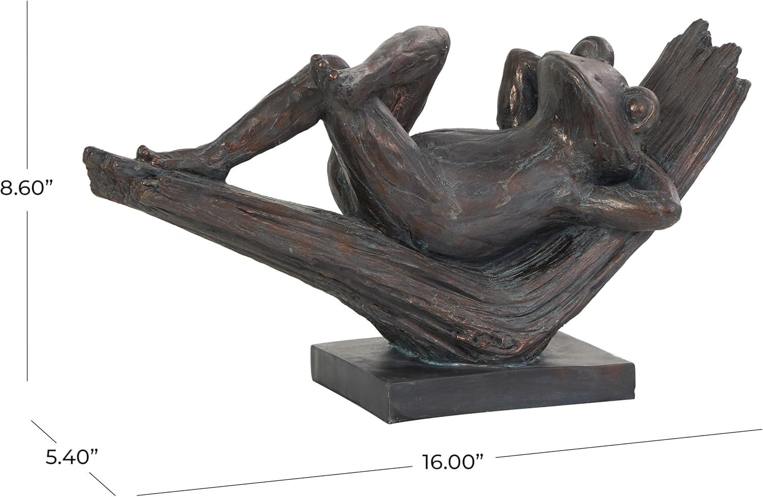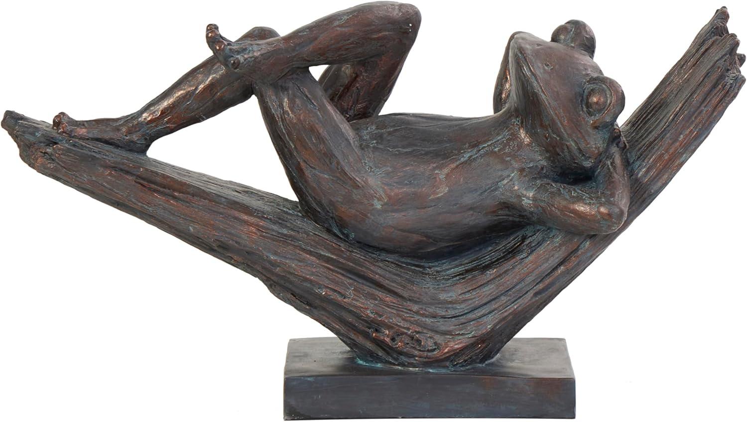 Resin is carefully molded and applied with a weathered bronze finish to ensure that this eclectic accent statue has its own distinct character and texture. Its whimsical shape of a frog relaxing in a hammock gives this weathered bronze home decor figurine an interesting look that will draw attention from all angles. Wipe clean with a dry cloth. Incorporate this whimsical frog home decor statue as part of a larger display with other pieces of artwork and decor or as an independent unique piece that will stand out in your living room. Designed with felt or rubber stoppers at the base that prevent scratching furniture and table tops, as well as sliding around. This item ships in 1 carton. Please note that this item is for decorative use only. Resin sculpture makes a great gift for any occasion. Suitable for indoor use only. This item ships fully assembled in one piece. This is a single bronze colored statue. Eclectic style.