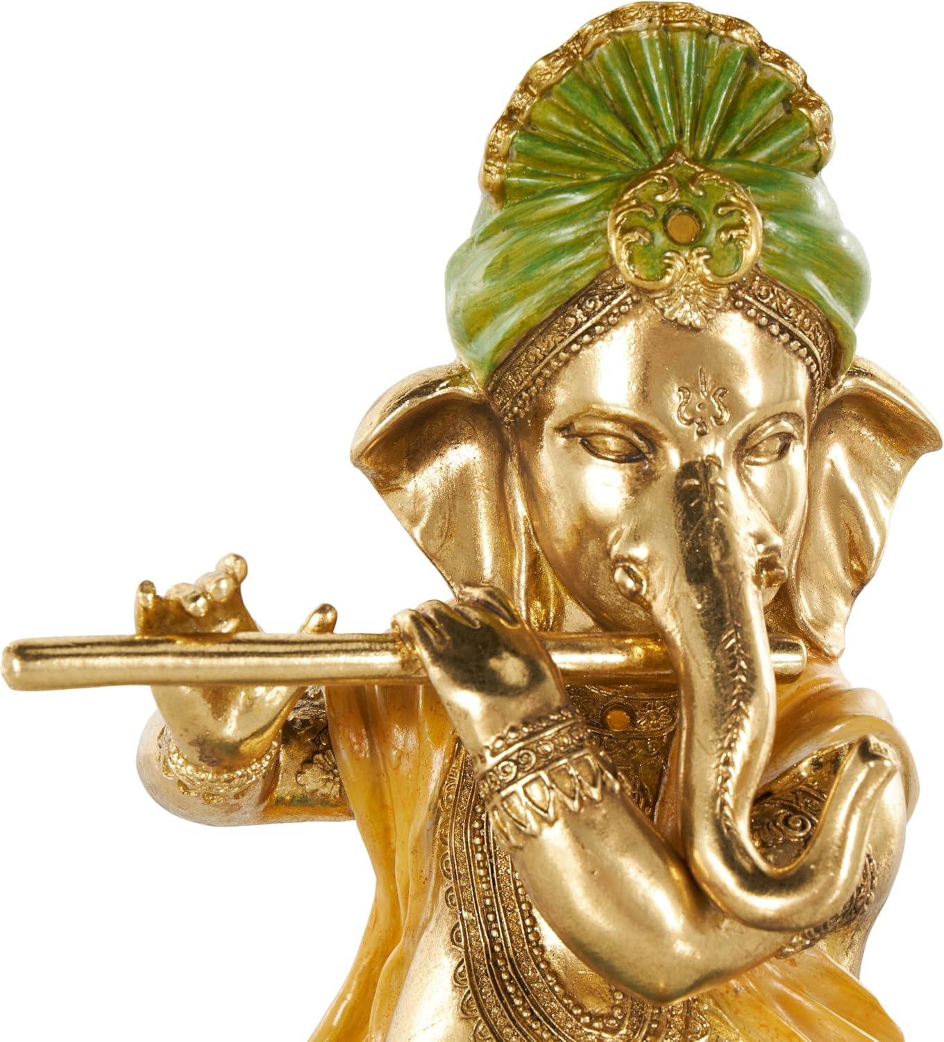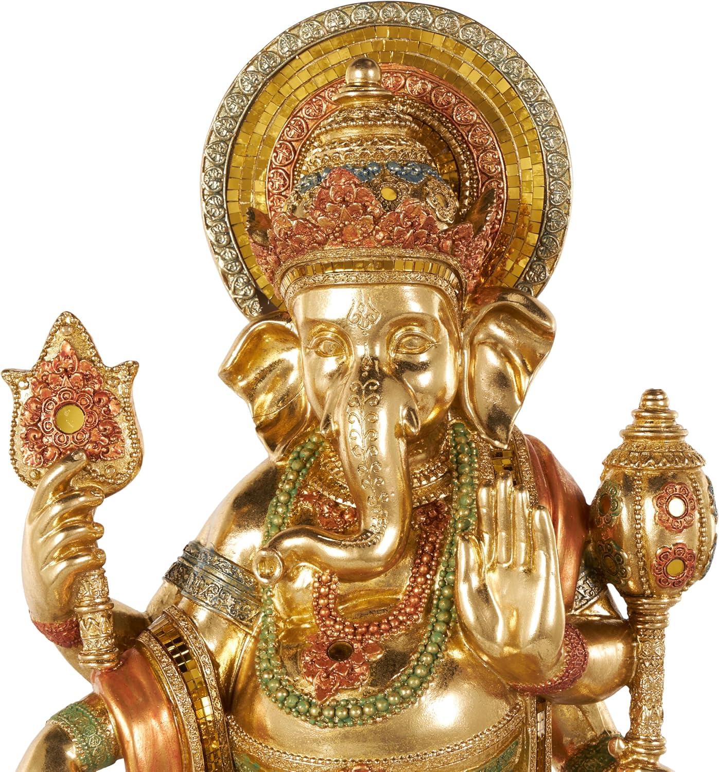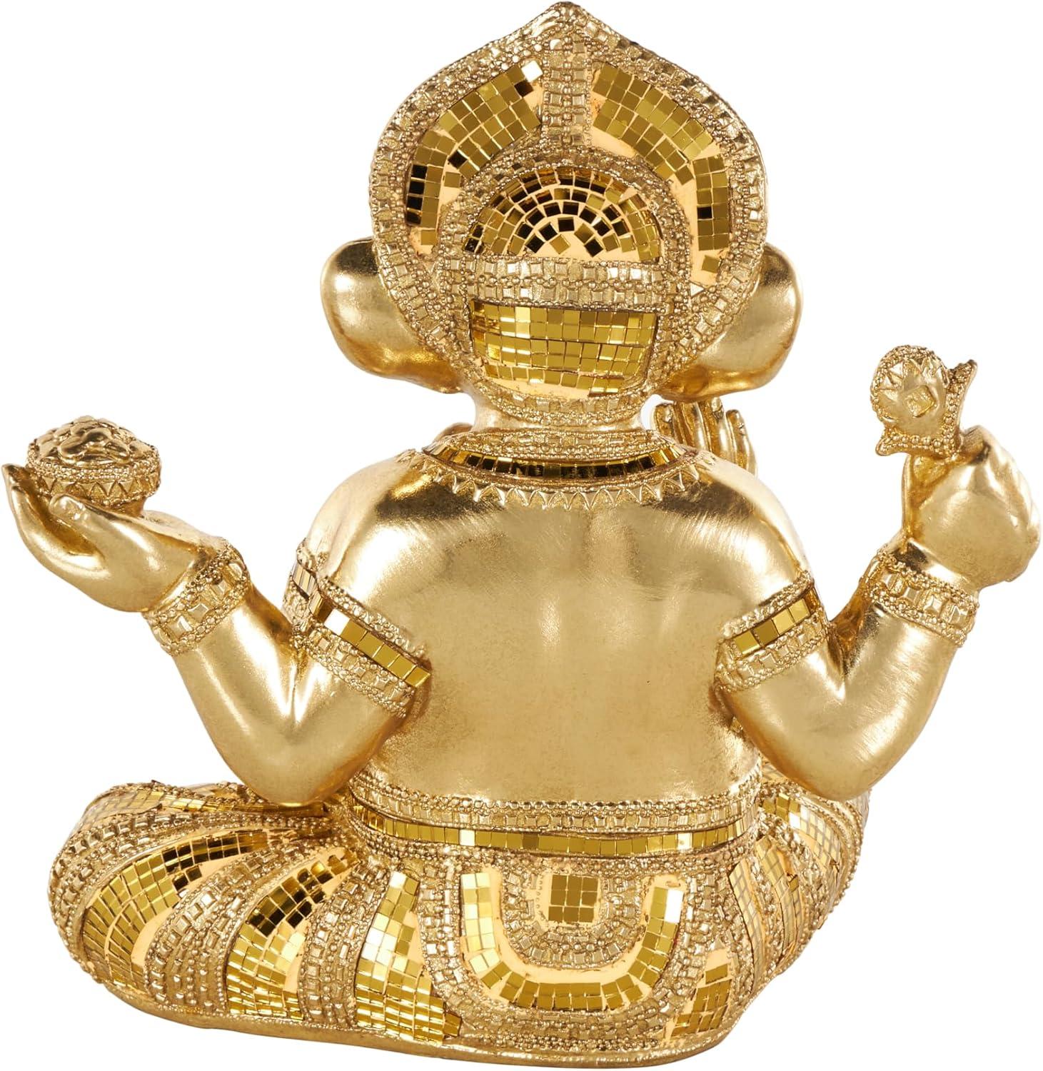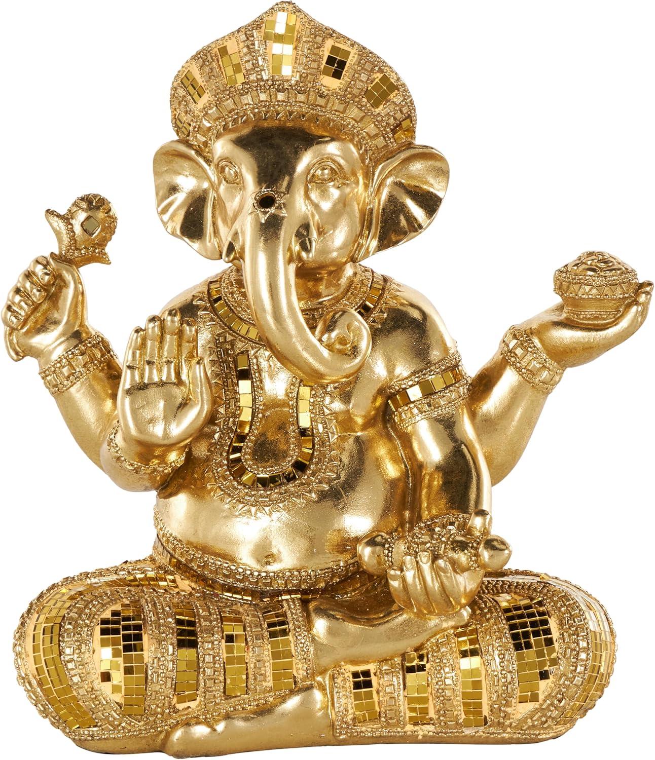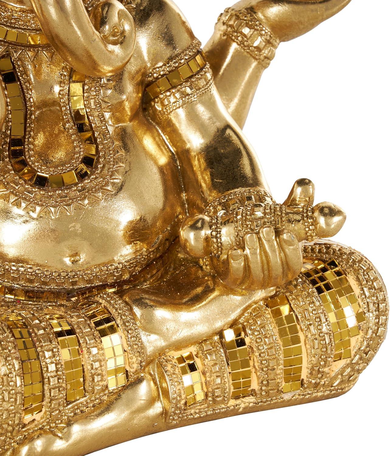 This traditional accent statue is expertly crafted by molding premium resin into the intricate form of Ganesh, then finished with a satin gold coating to enhance its traditional beauty. Satin gold home decor figurine is shaped like a Ganesh with scroll patterns that captures the essence of traditional design. Wipe clean with a dry cloth. This Ganesh home decor statue is perfect for adding a touch of tradition to your living room or bedroom. Designed with felt or rubber stoppers at the base that prevent scratching furniture and table tops, as well as sliding around. This item ships in 1 carton. Please note that this item is for decorative use only. Resin sculpture makes a great gift for any occasion. Suitable for indoor use only. This item ships fully assembled in one piece. This is a single gold colored statue. Traditional style.