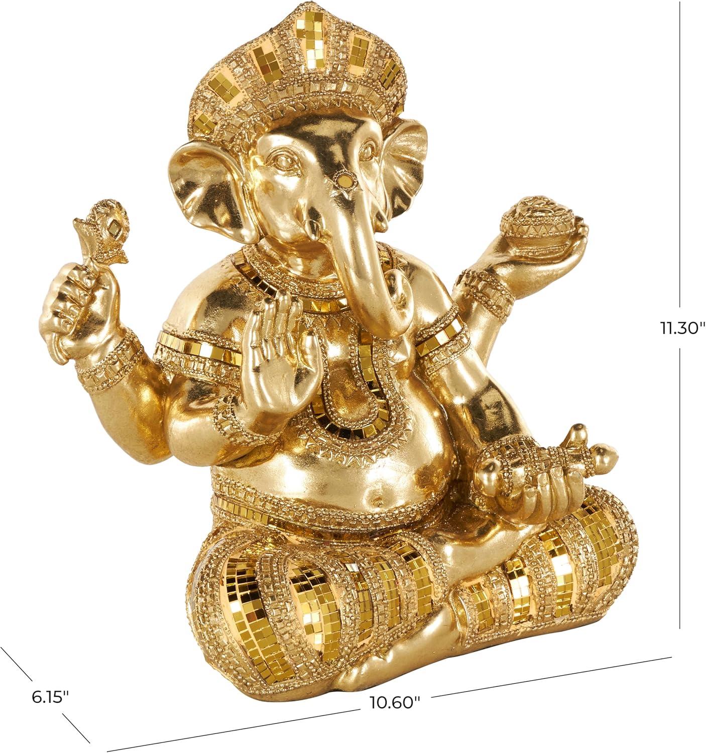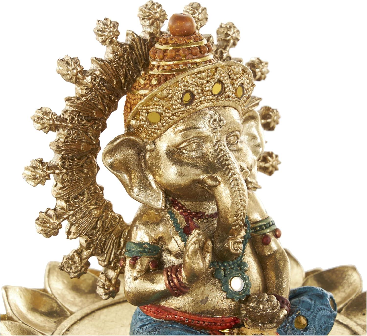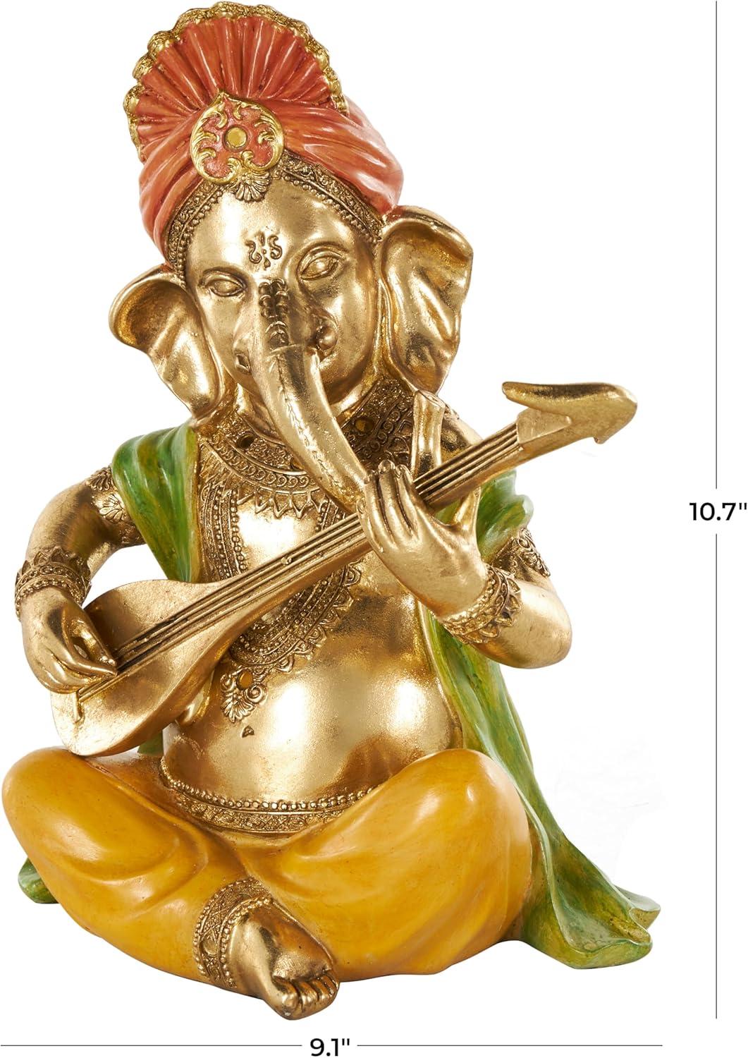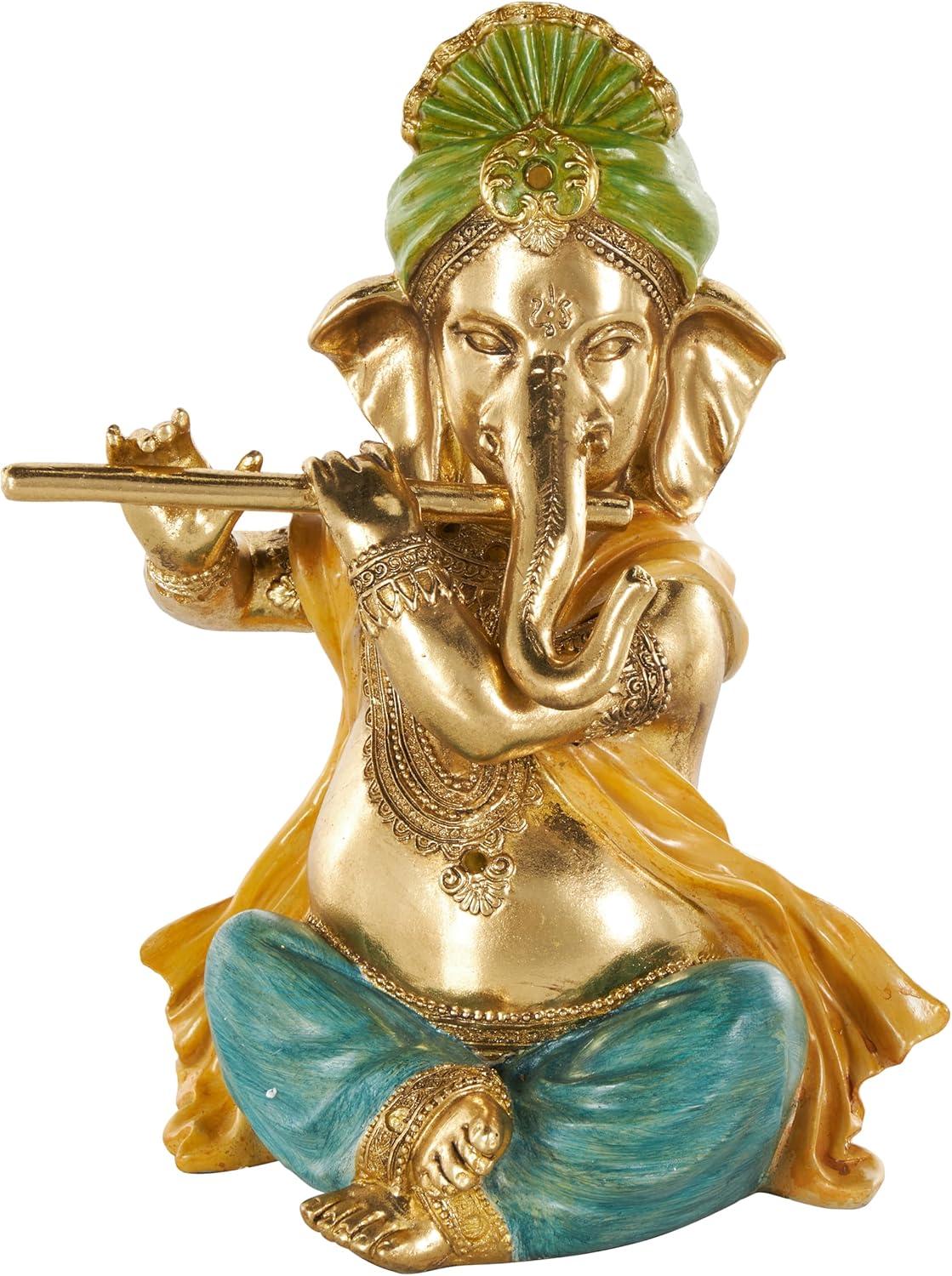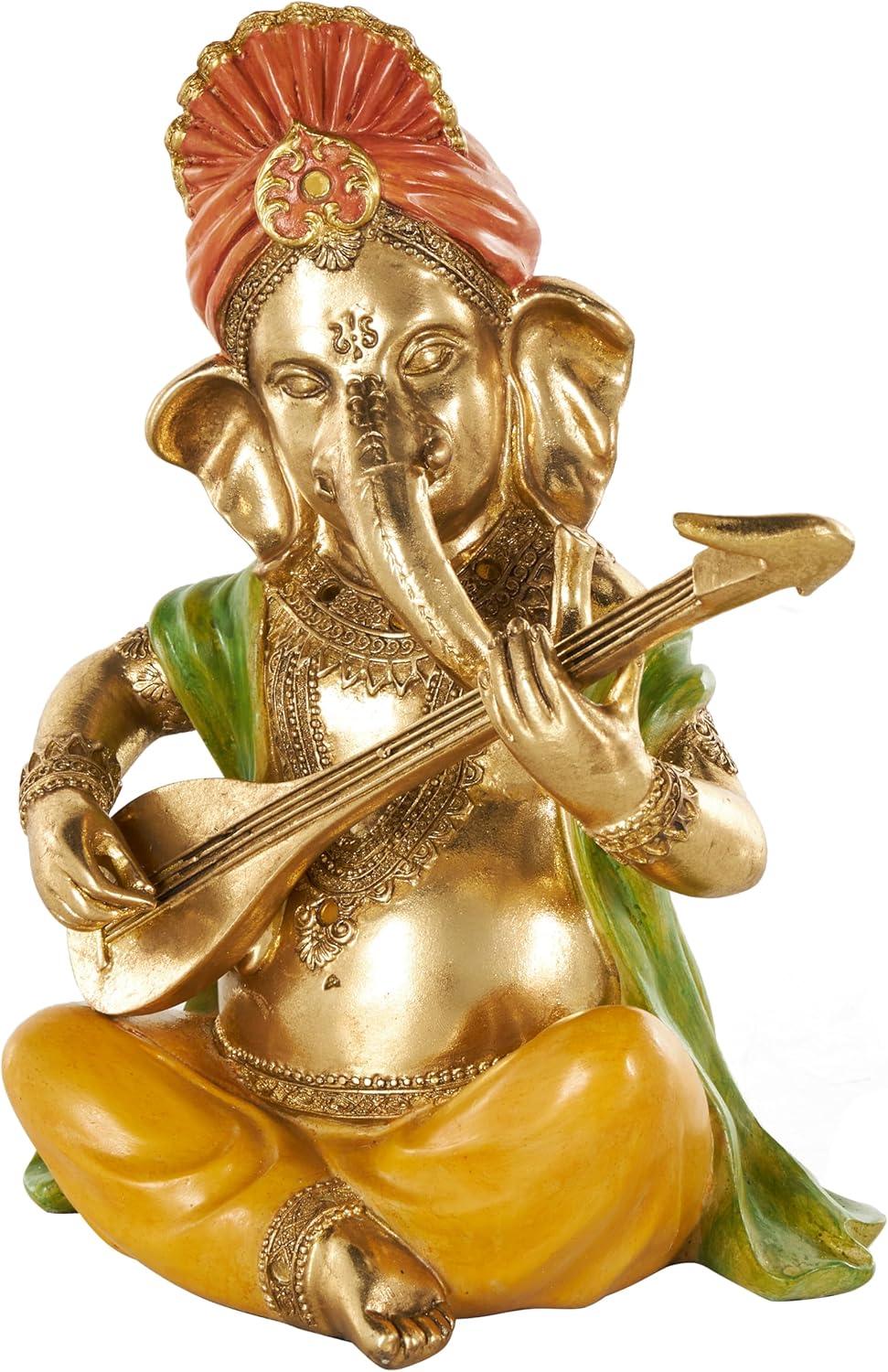 This traditional accent statue is expertly crafted by molding premium resin into the intricate form of Ganesh, then finished with a satin gold coating to enhance its traditional beauty. Satin gold home decor figurine is shaped like a Ganesh with scroll patterns that captures the essence of traditional design. Wipe clean with a dry cloth. This Ganesh home decor statue is perfect for adding a touch of tradition to your living room or bedroom. Designed with felt or rubber stoppers at the base that prevent scratching furniture and table tops, as well as sliding around. This item ships in 1 carton. Please note that this item is for decorative use only. Resin sculpture makes a great gift for any occasion. Suitable for indoor use only. This item ships fully assembled in one piece. This is a single gold colored statue. Traditional style.