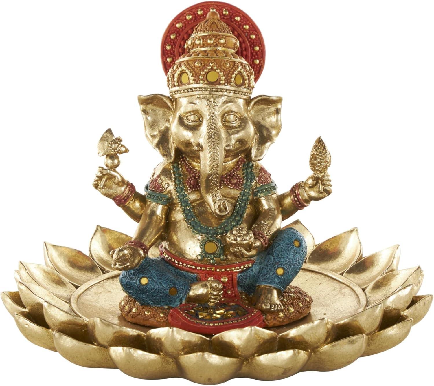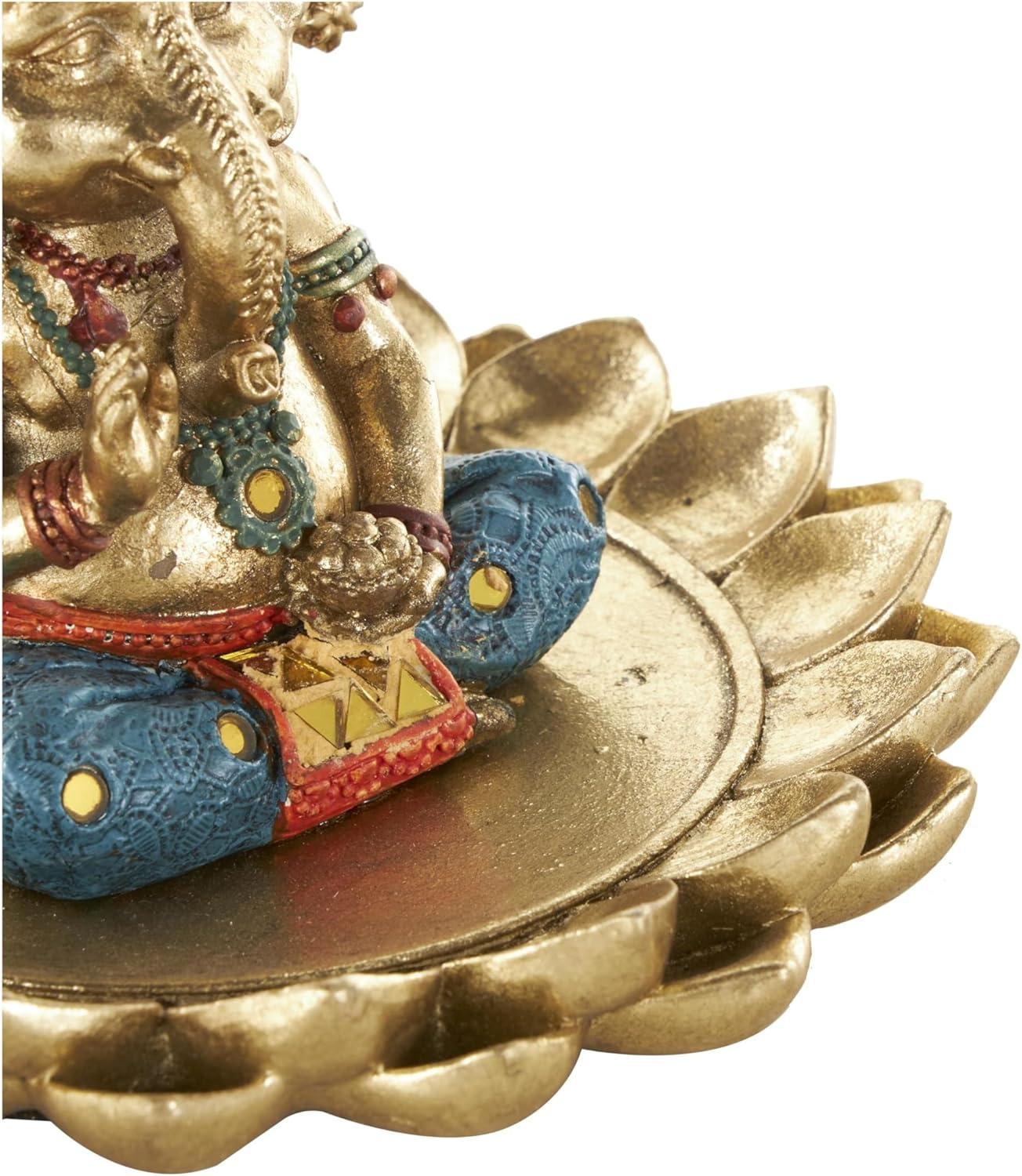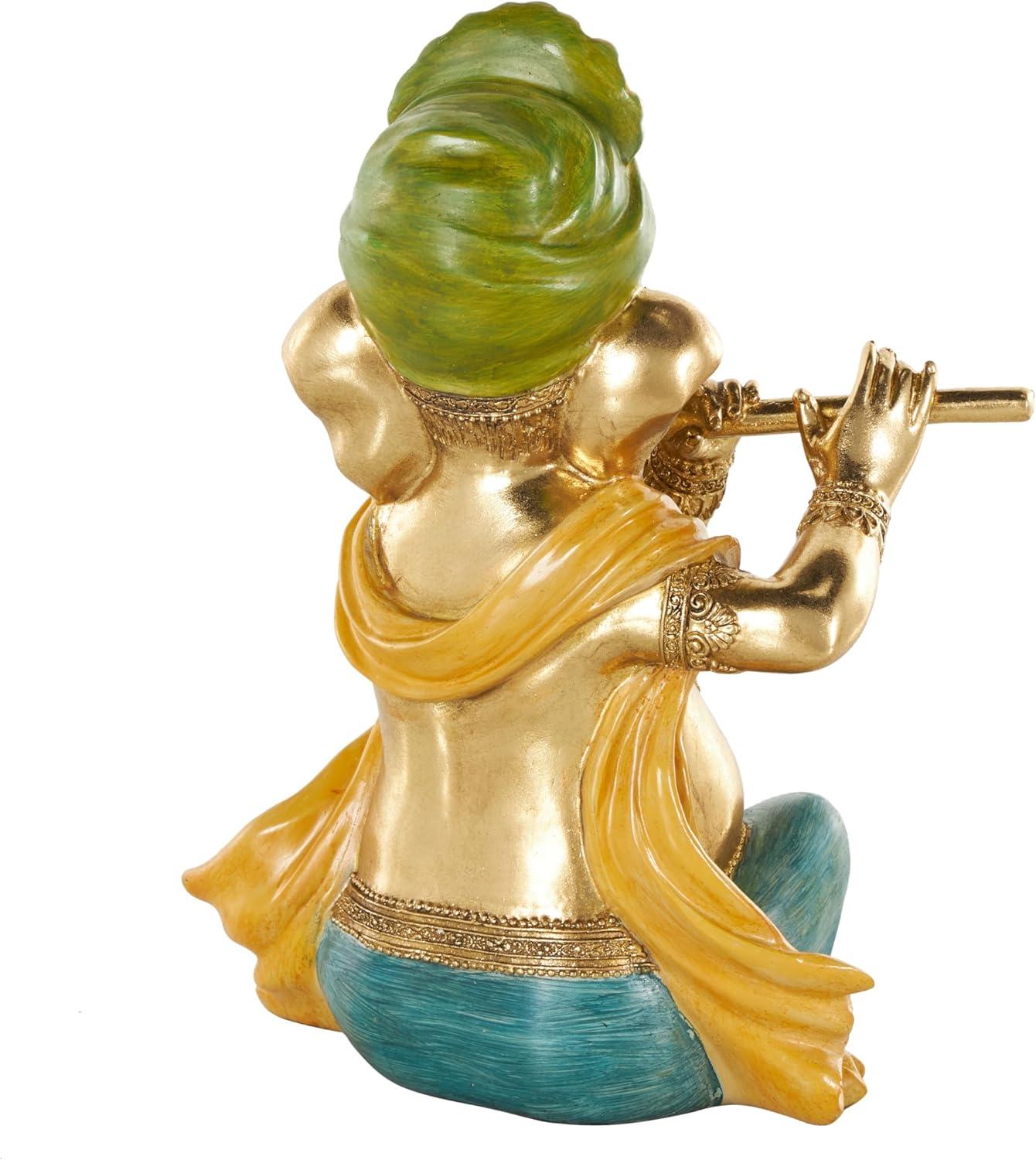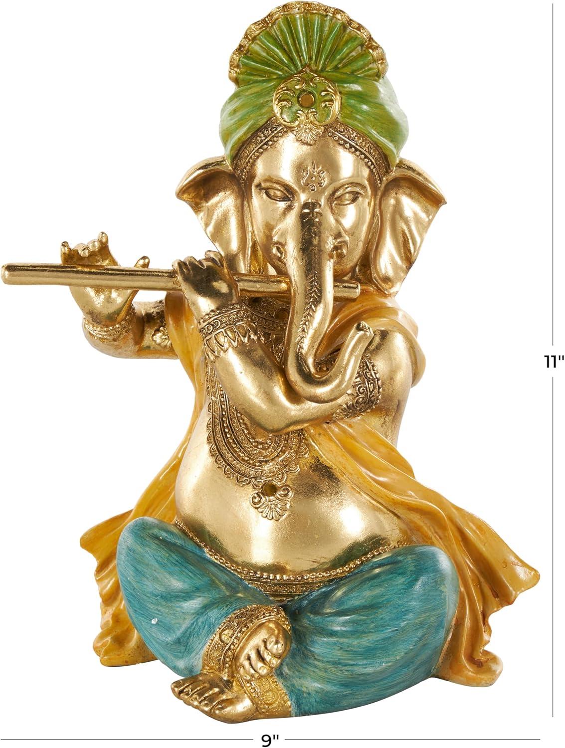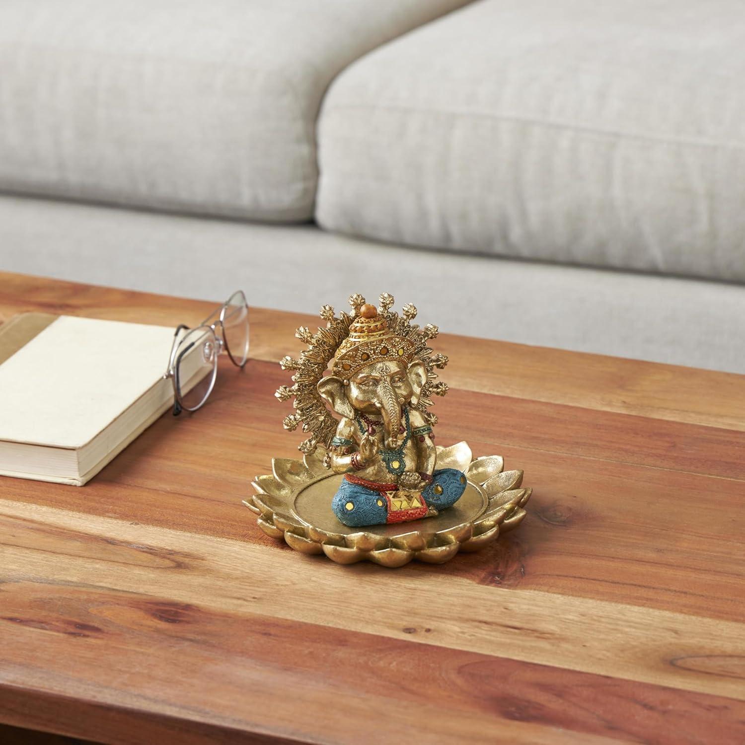 This traditional accent statue is expertly crafted by molding premium resin into the intricate form of Ganesh, then finished with a satin gold coating to enhance its traditional beauty. Satin gold home decor figurine is shaped like a Ganesh with scroll patterns that captures the essence of traditional design. Wipe clean with a dry cloth. This Ganesh home decor statue is perfect for adding a touch of tradition to your living room or bedroom. Designed with felt or rubber stoppers at the base that prevent scratching furniture and table tops, as well as sliding around. This item ships in 1 carton. Please note that this item is for decorative use only. Resin sculpture makes a great gift for any occasion. Suitable for indoor use only. This item ships fully assembled in one piece. This is a single gold colored statue. Traditional style.