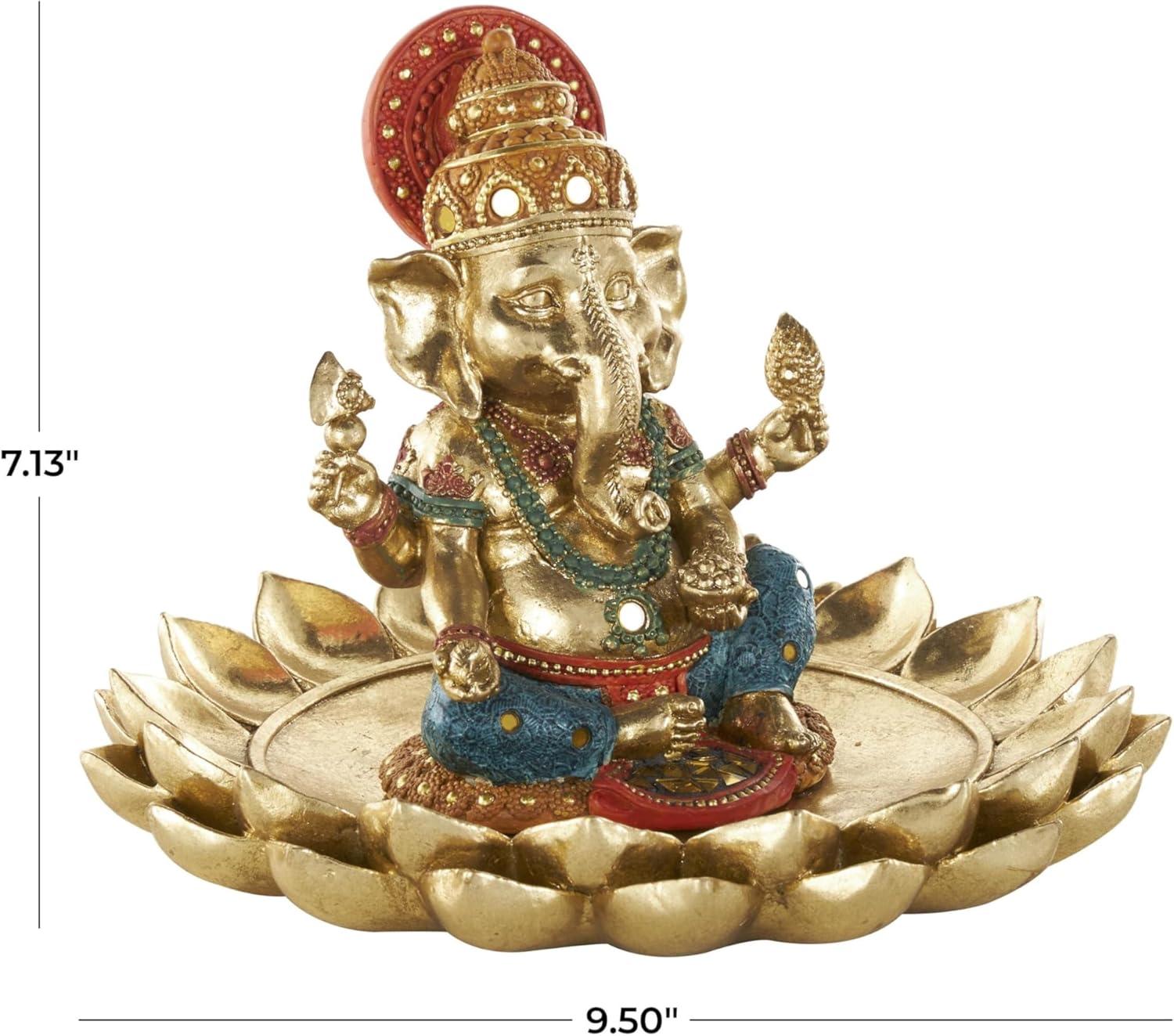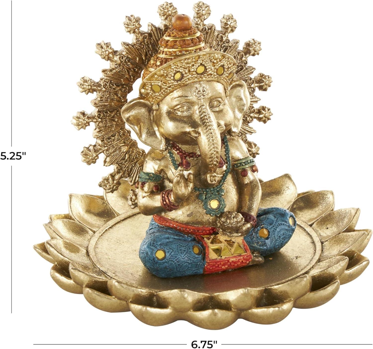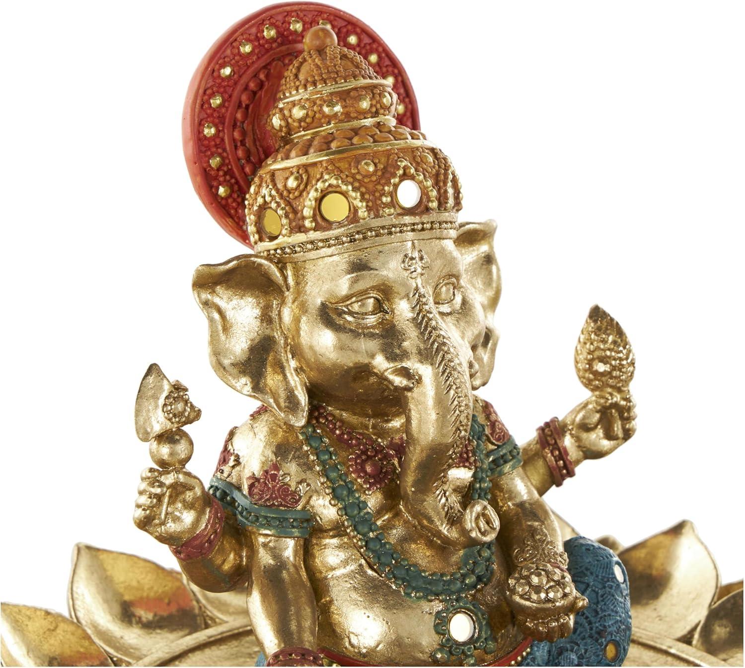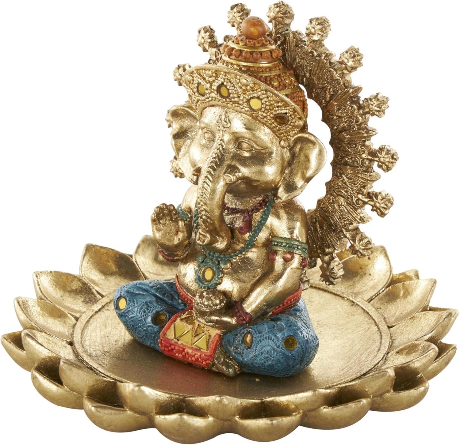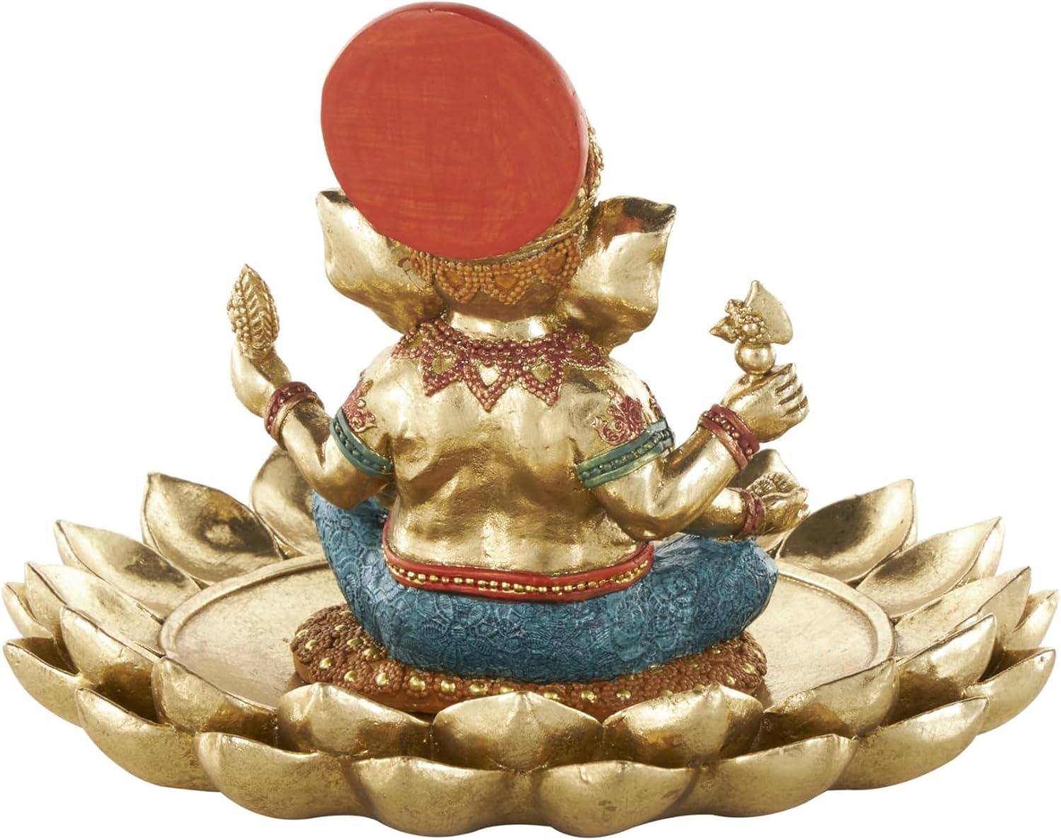 This traditional accent statue is expertly crafted by molding premium resin into the intricate form of Ganesh, then finished with a satin gold coating to enhance its traditional beauty. Satin gold home decor figurine is shaped like a Ganesh with scroll patterns that captures the essence of traditional design. Wipe clean with a dry cloth. This Ganesh home decor statue is perfect for adding a touch of tradition to your living room or bedroom. Designed with felt or rubber stoppers at the base that prevent scratching furniture and table tops, as well as sliding around. This item ships in 1 carton. Please note that this item is for decorative use only. Resin sculpture makes a great gift for any occasion. Suitable for indoor use only. This item ships fully assembled in one piece. This is a single gold colored statue. Traditional style.