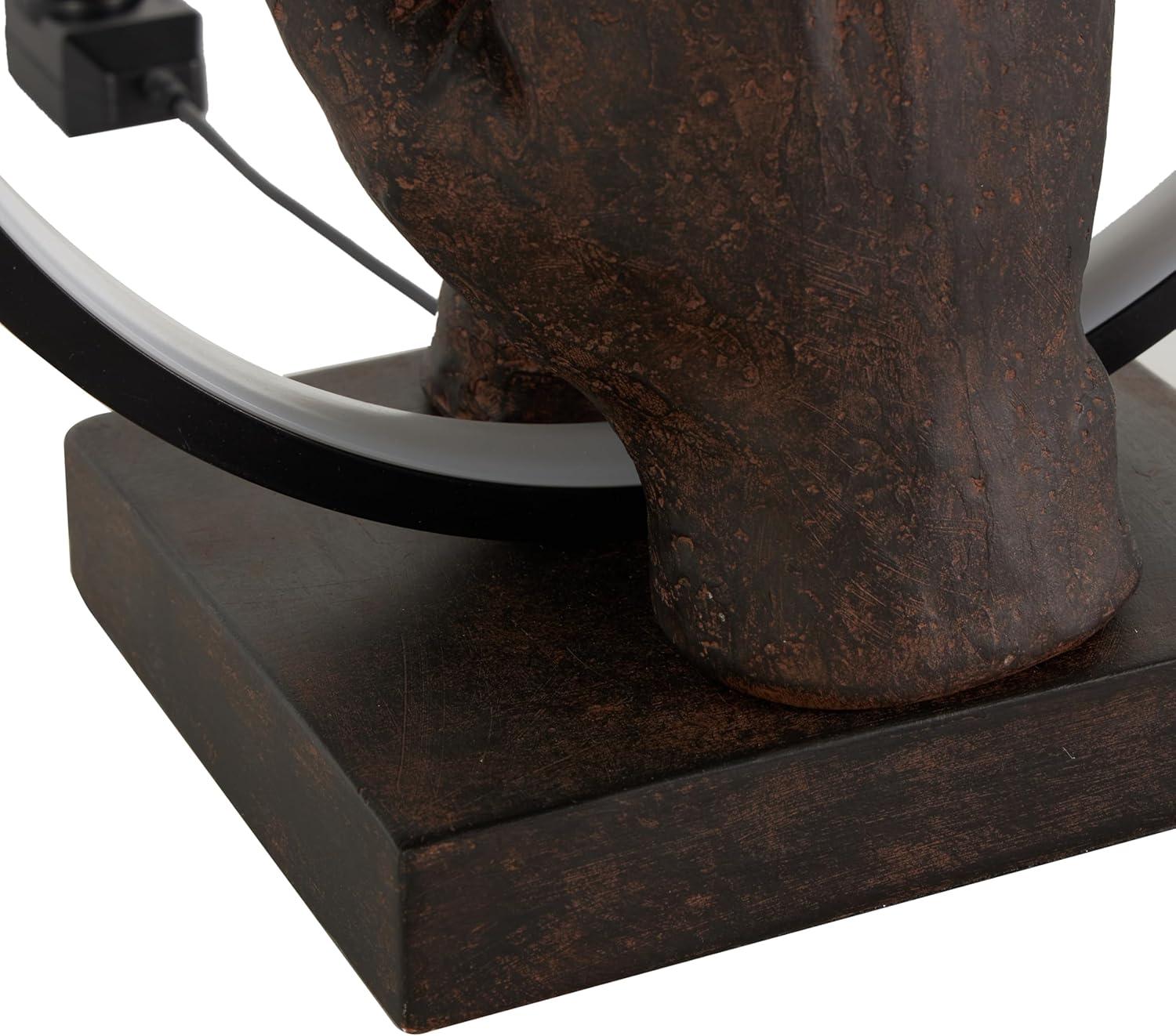 Contemporary living room table lamp is molded with resin and placed on a square base with the lamp carefully placed. This weathered copper accent lamp for table boasts a unique round shape, a square base, and a figure of hands holding that complements various decor styles. Wipe clean with a dry cloth. Ideal for enhancing living rooms or bedrooms, this hands accent lamp provides both functionality and style. Requires 1 60W Type A E26/Medium (Standard) bulb. This item ships in 1 carton. Comes with a 91″ cord length. Suitable for indoor use only. This item ships fully assembled in one piece. Includes a rotary switch. This is a single copper colored accent lamp. Contemporary style.