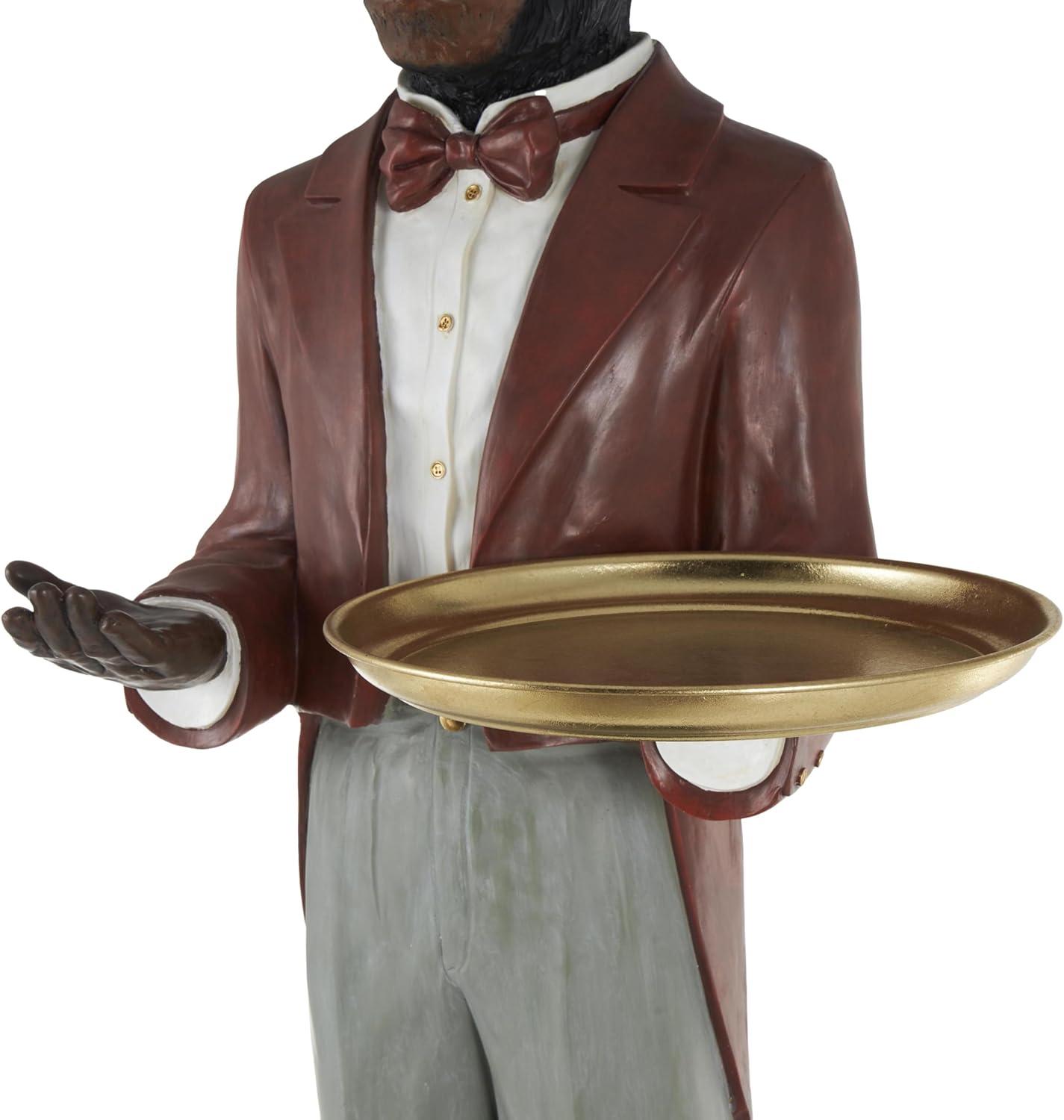MONKEY ACCENT STATUE: Resin statue features a playful monkey dressed as a waiter carrying a gold plate that adds a touch of elegance